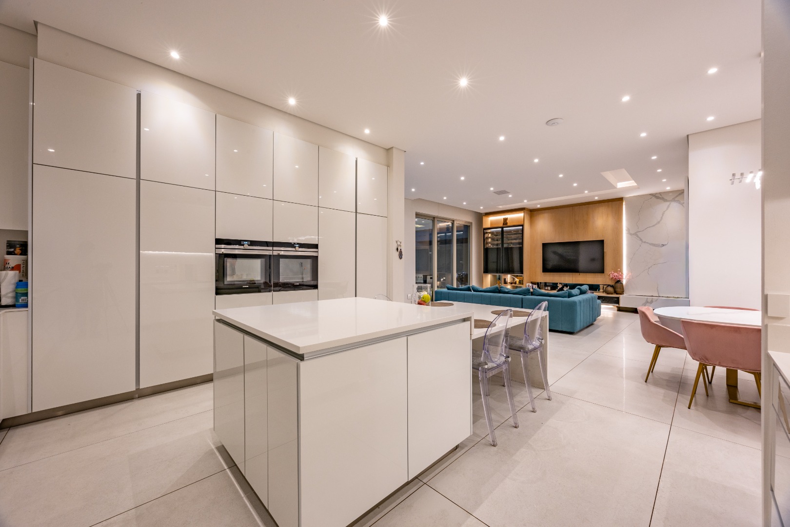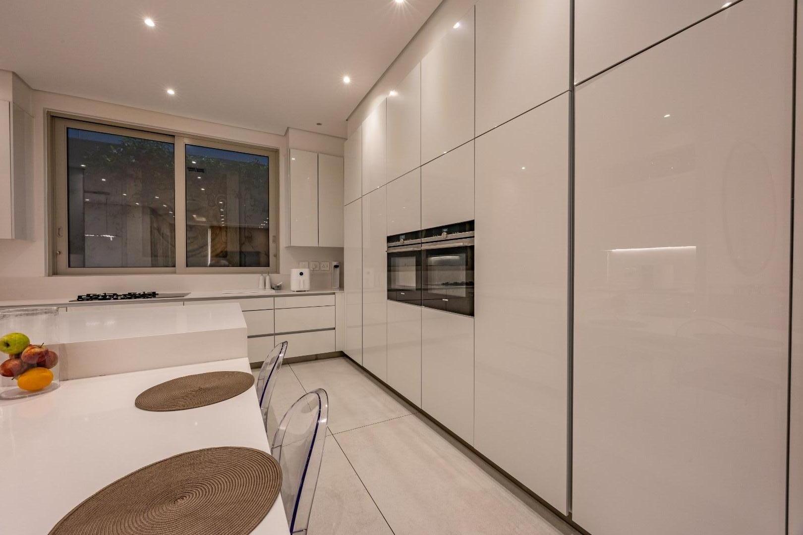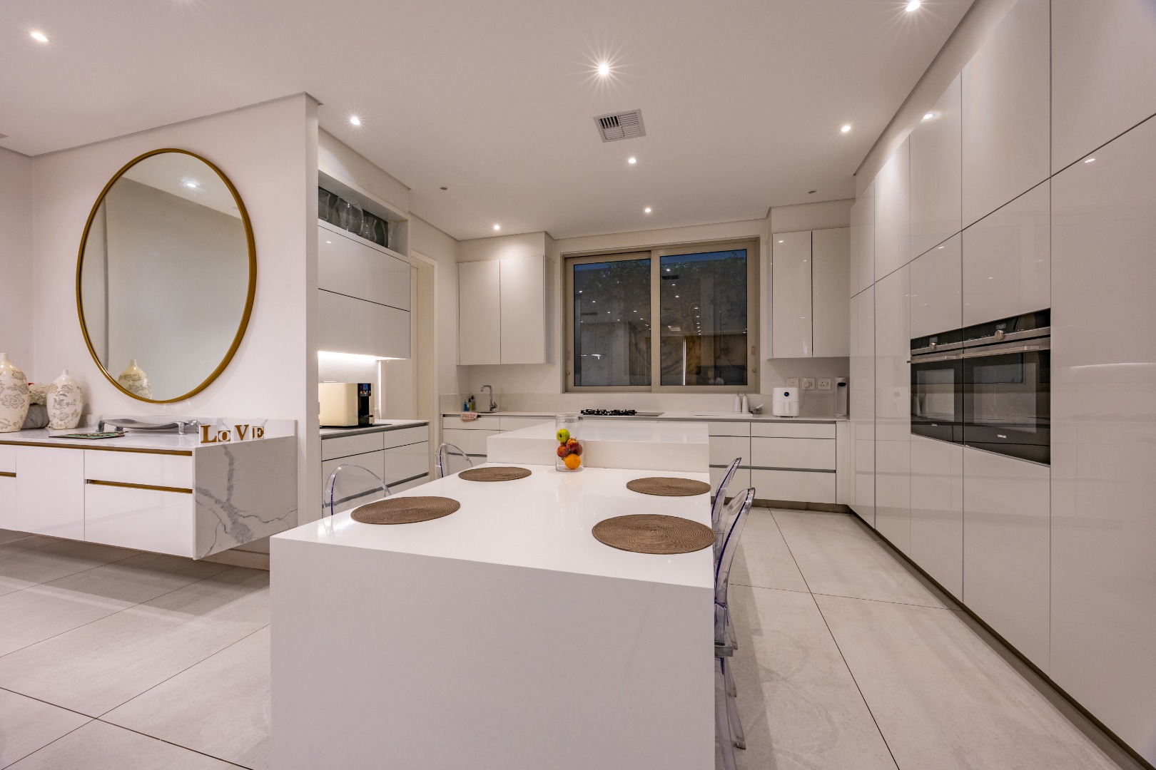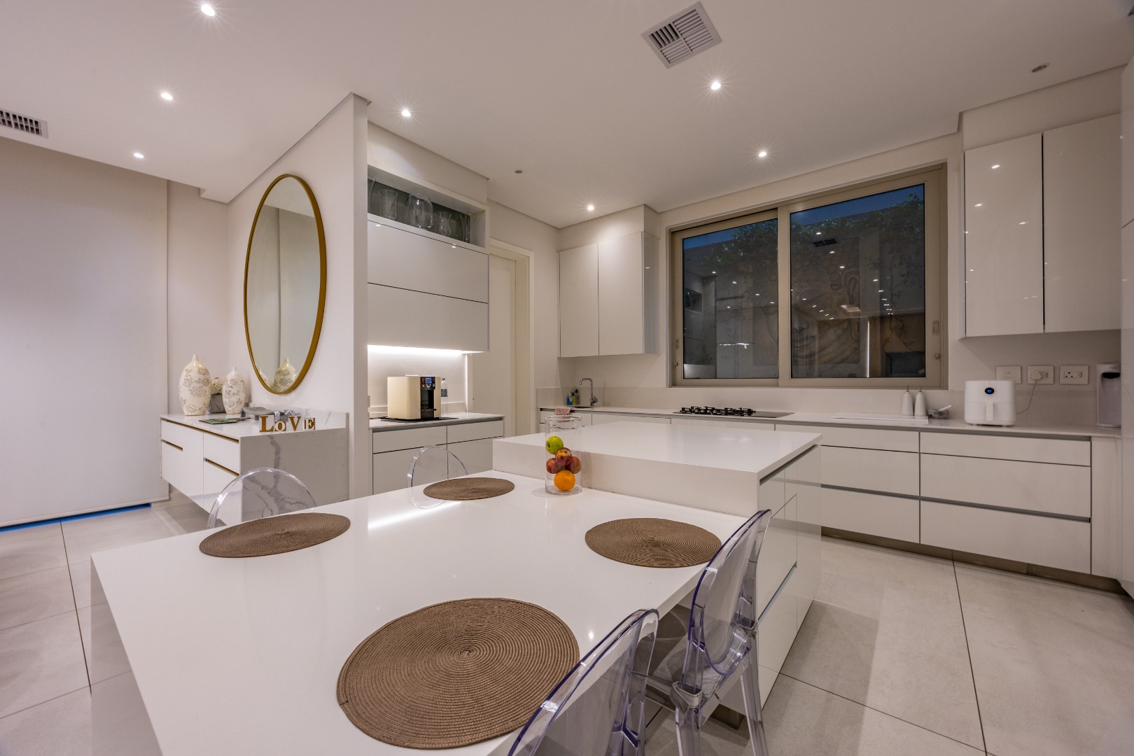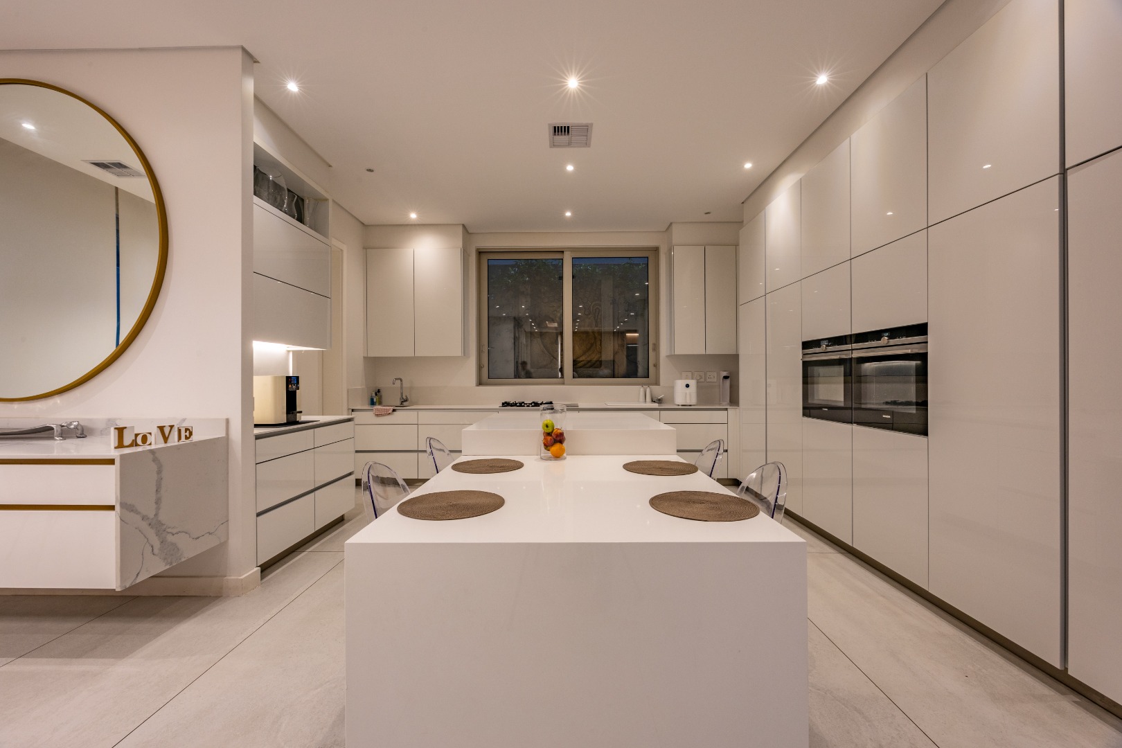 At the centre of the home lies a designer chef’s kitchen, a true showpiece finished in sleek white cabinetry with a large central island and premium fittings throughout. The space combines form and function effortlessly, enhanced by a separate scullery that ensures discretion and convenience.