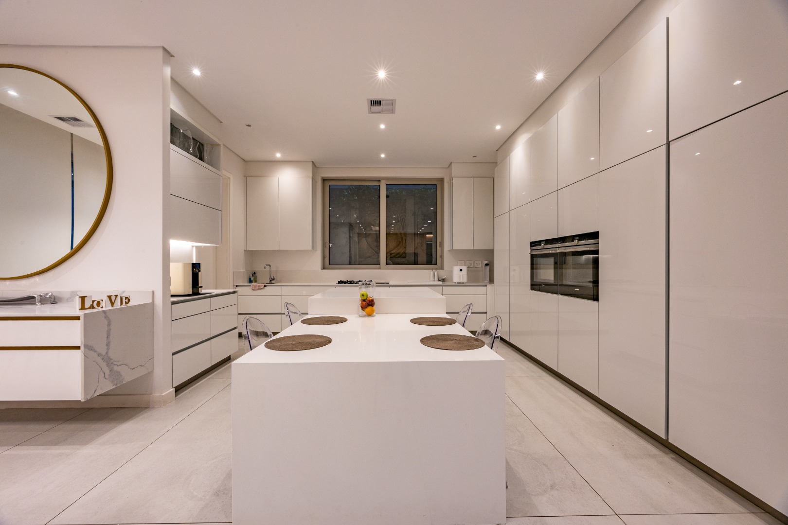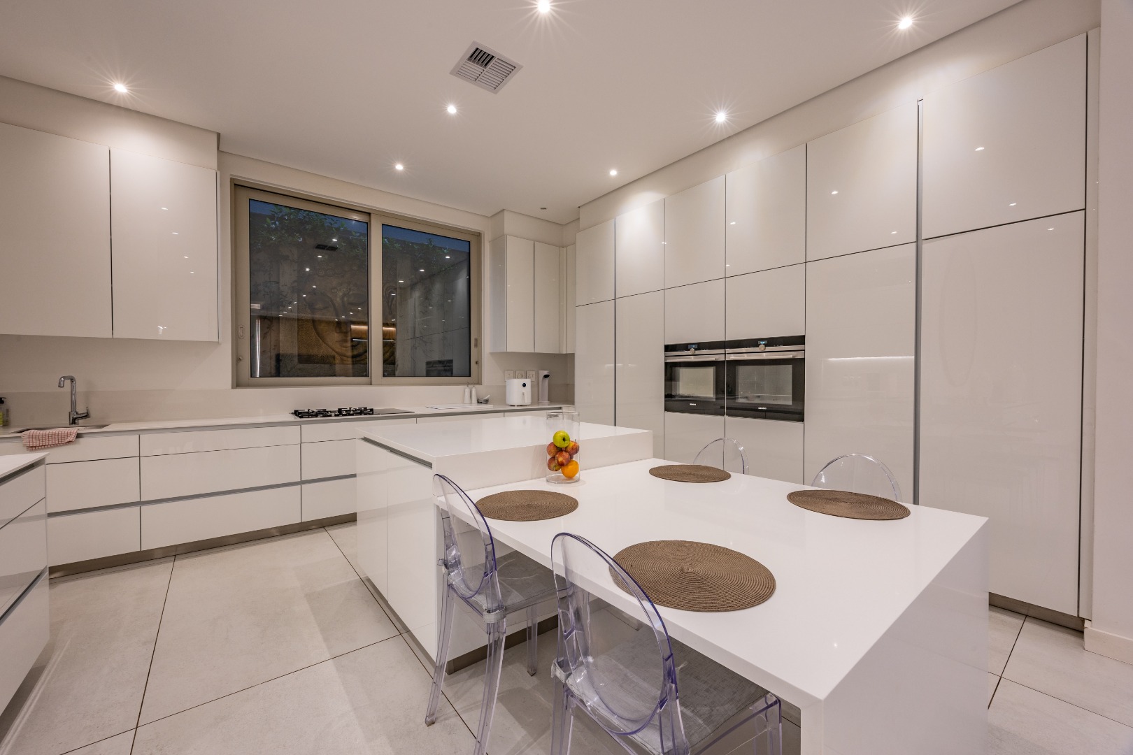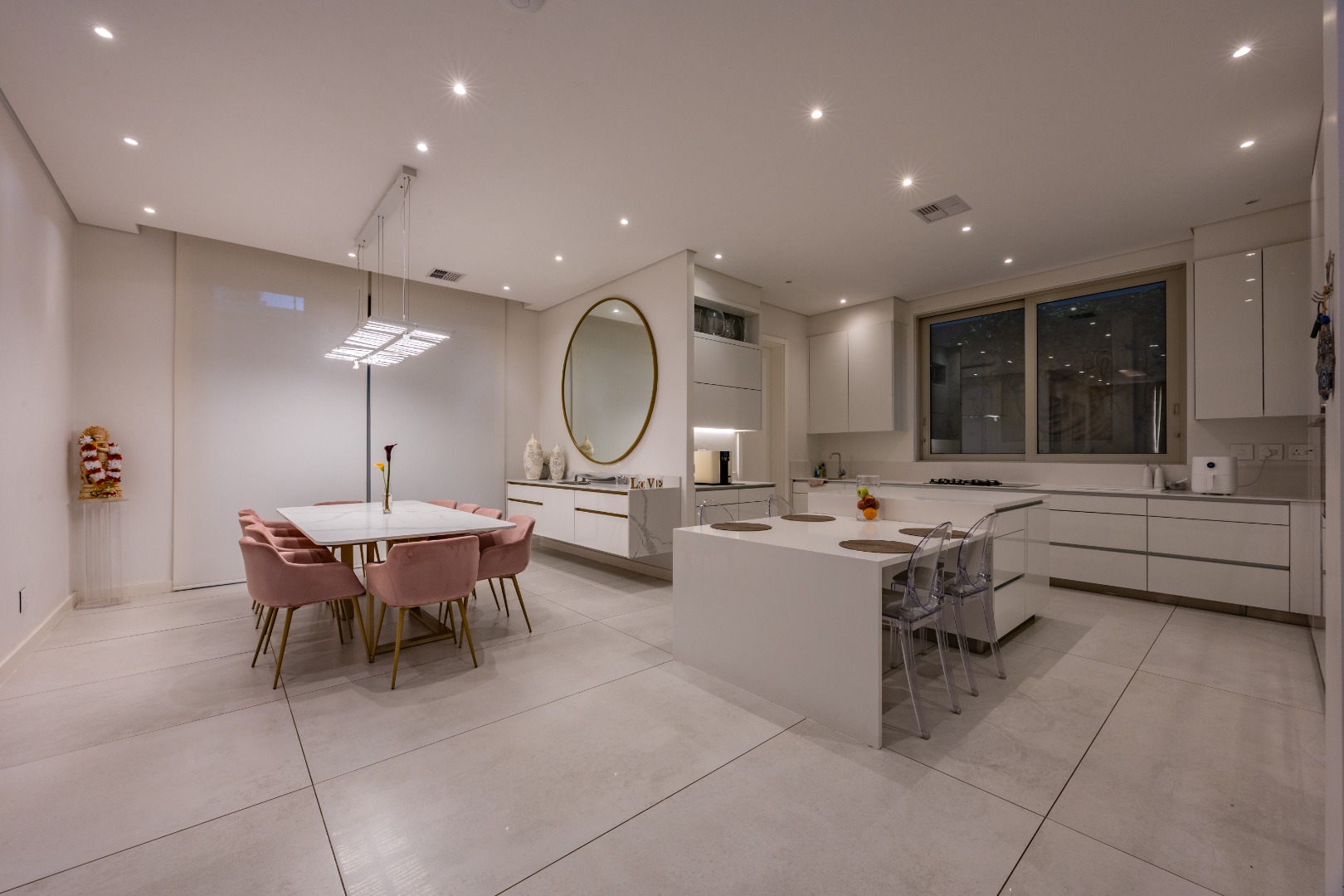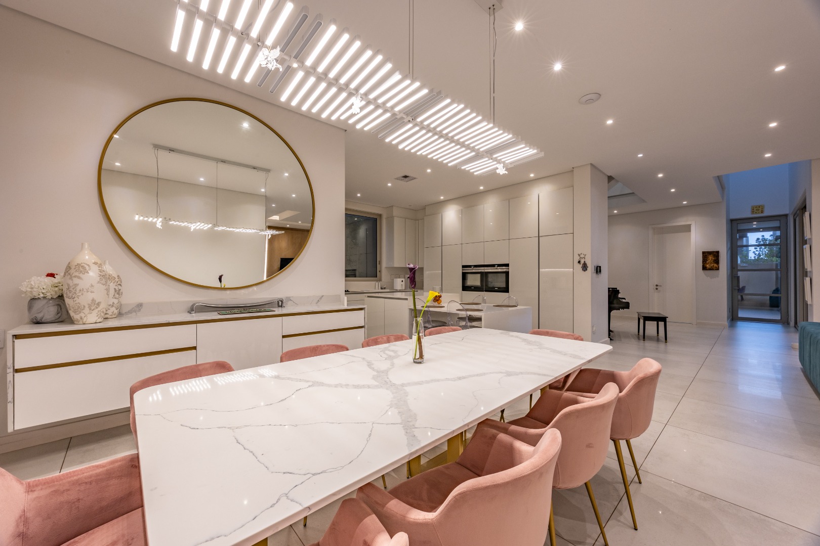 At the centre of the home lies a designer chef’s kitchen, a true showpiece finished in sleek white cabinetry with a large central island and premium fittings throughout. The space combines form and function effortlessly, enhanced by a separate scullery that ensures discretion and convenience.
