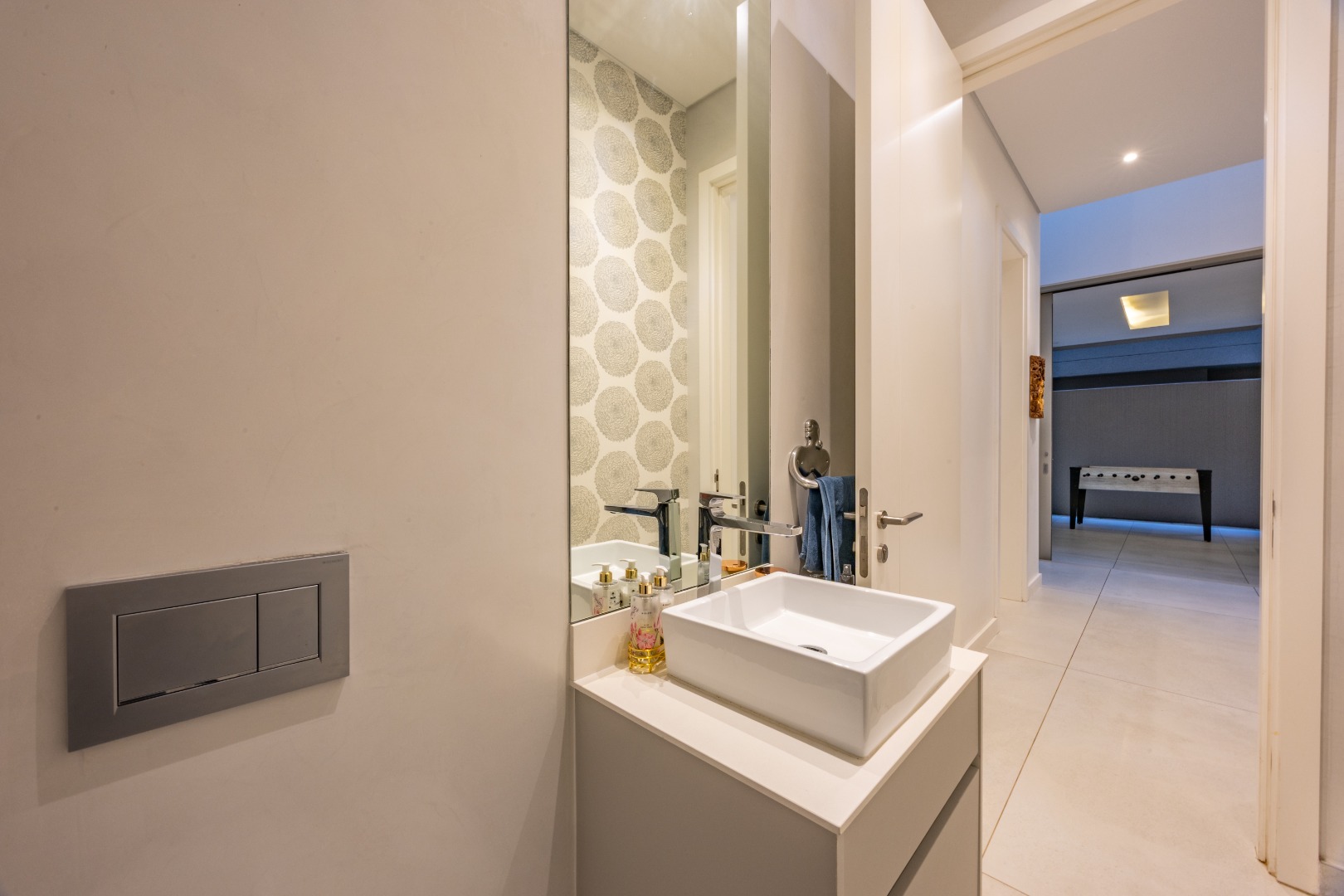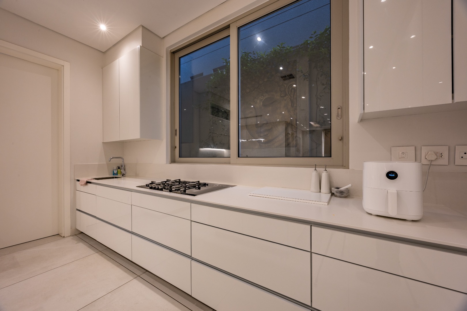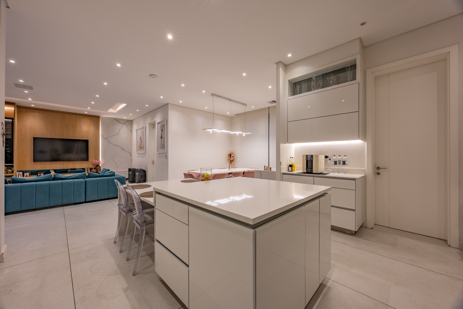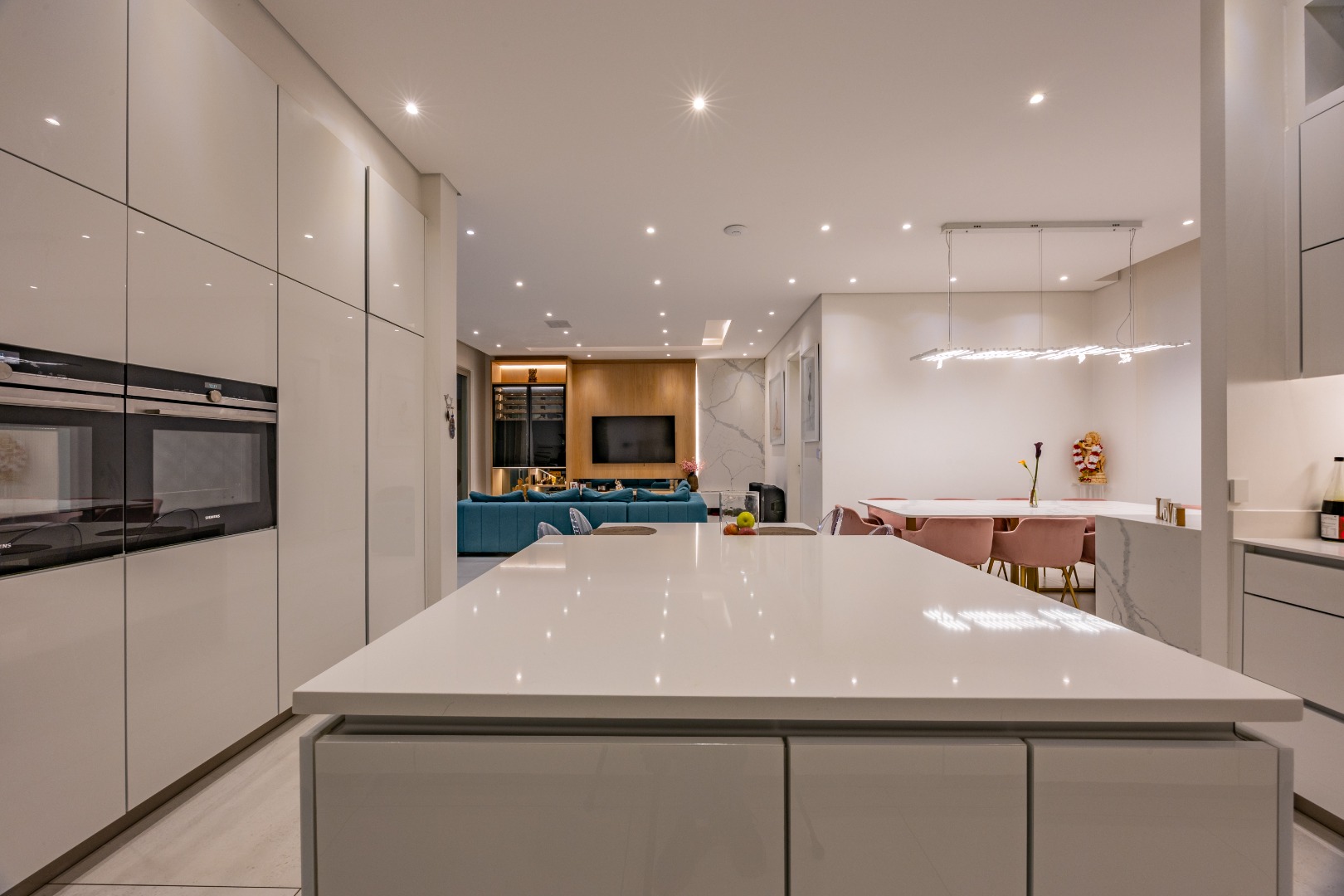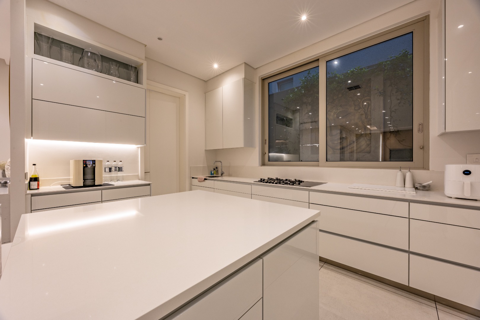 At the centre of the home lies a designer chef’s kitchen, a true showpiece finished in sleek white cabinetry with a large central island and premium fittings throughout. The space combines form and function effortlessly, enhanced by a separate scullery that ensures discretion and convenience.
