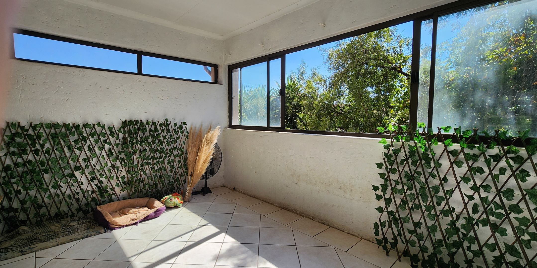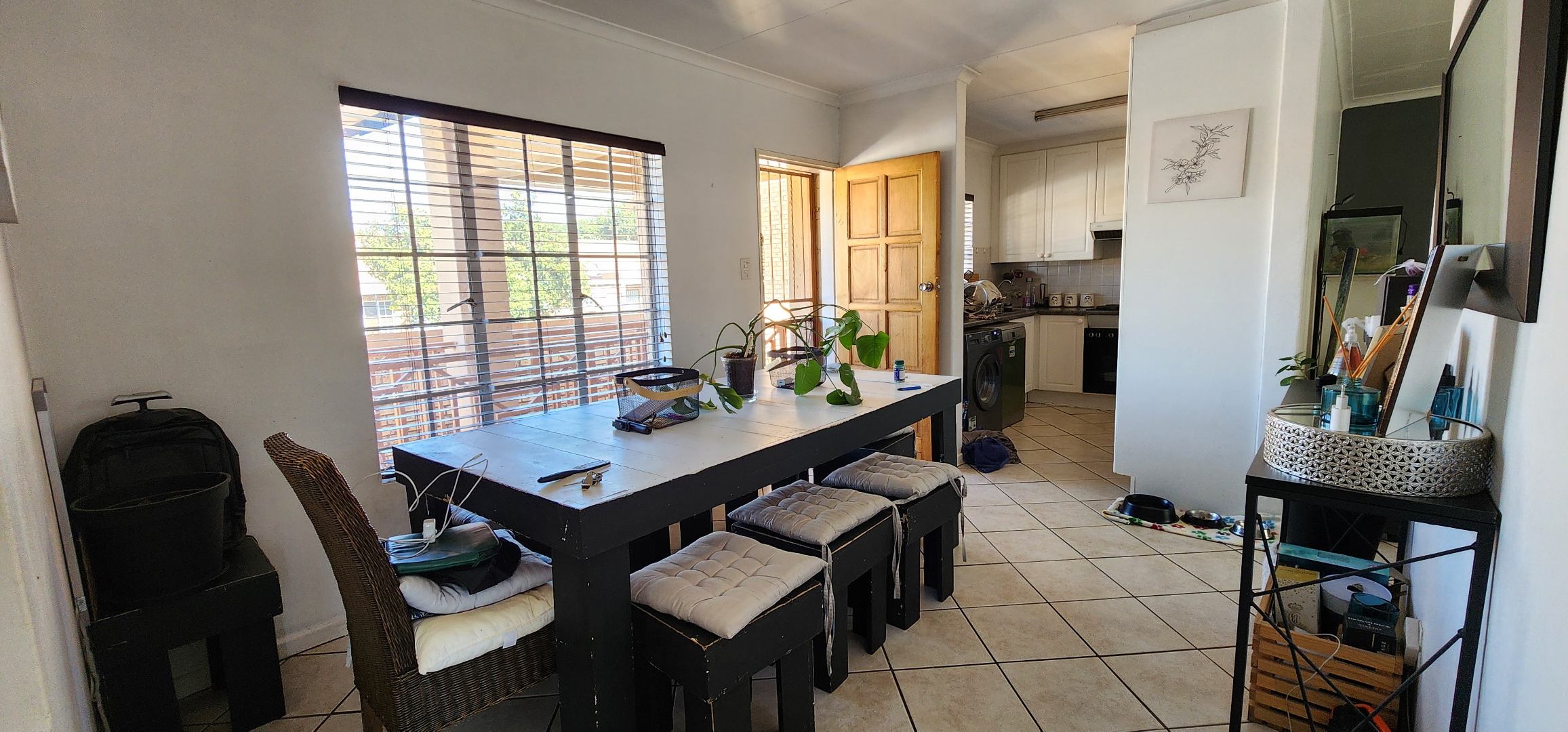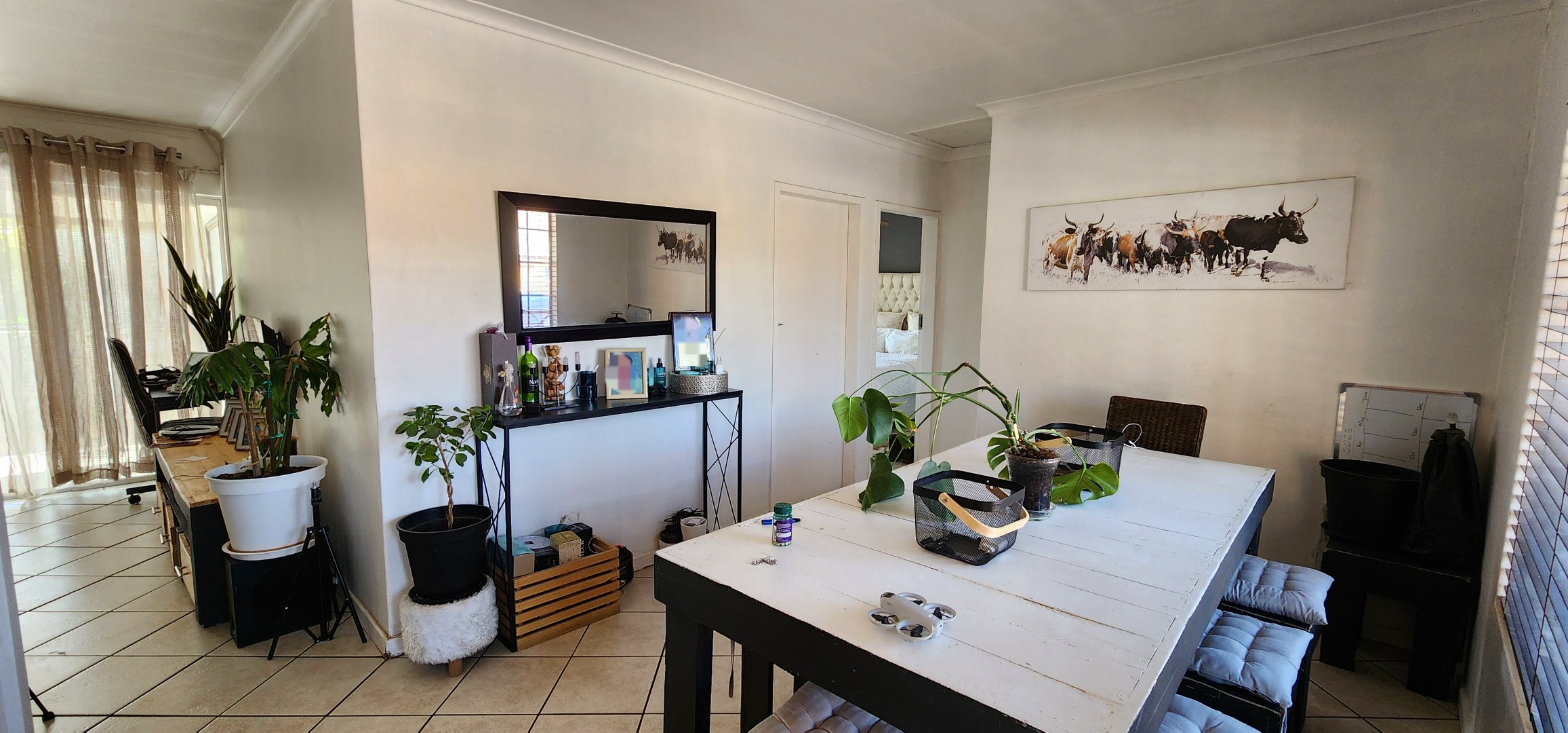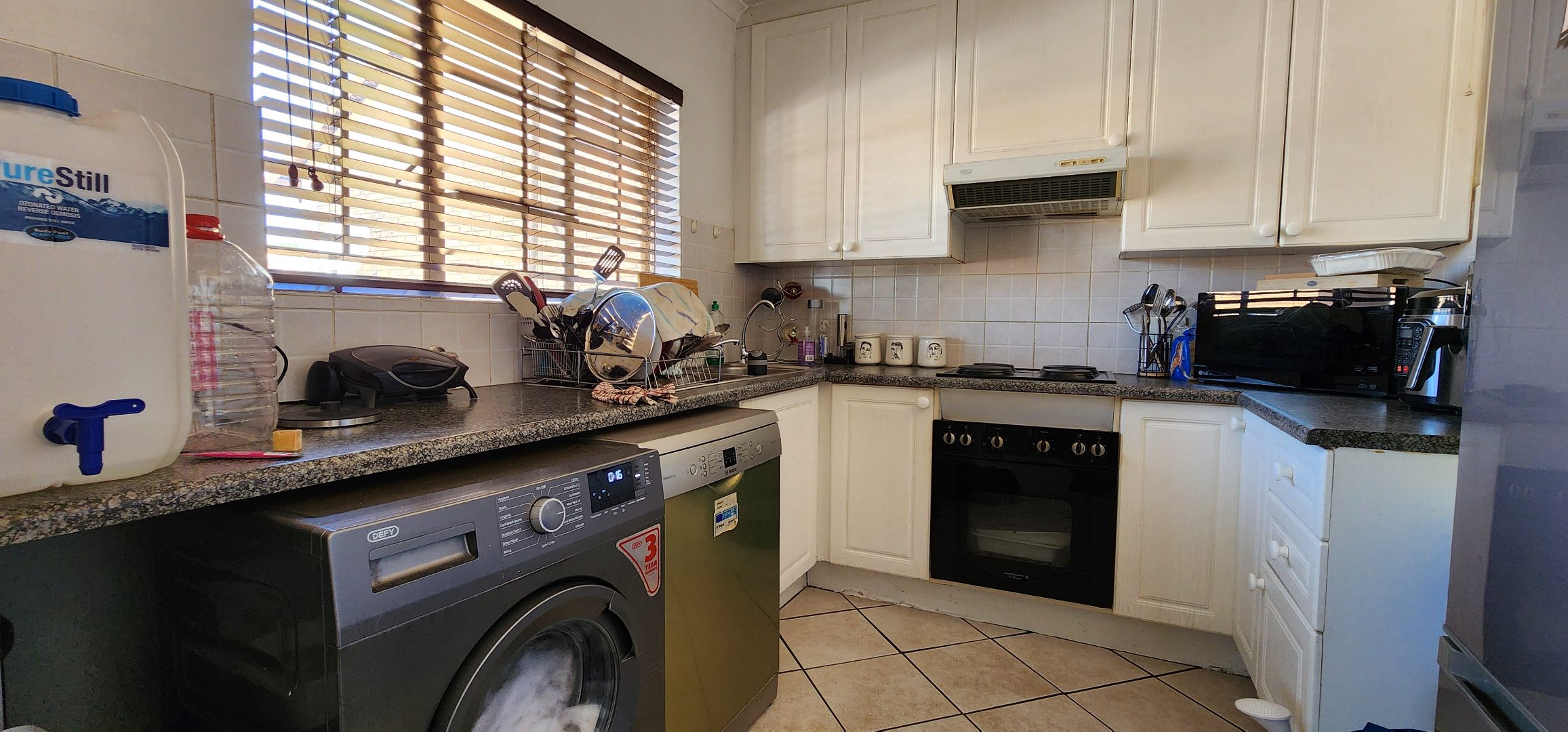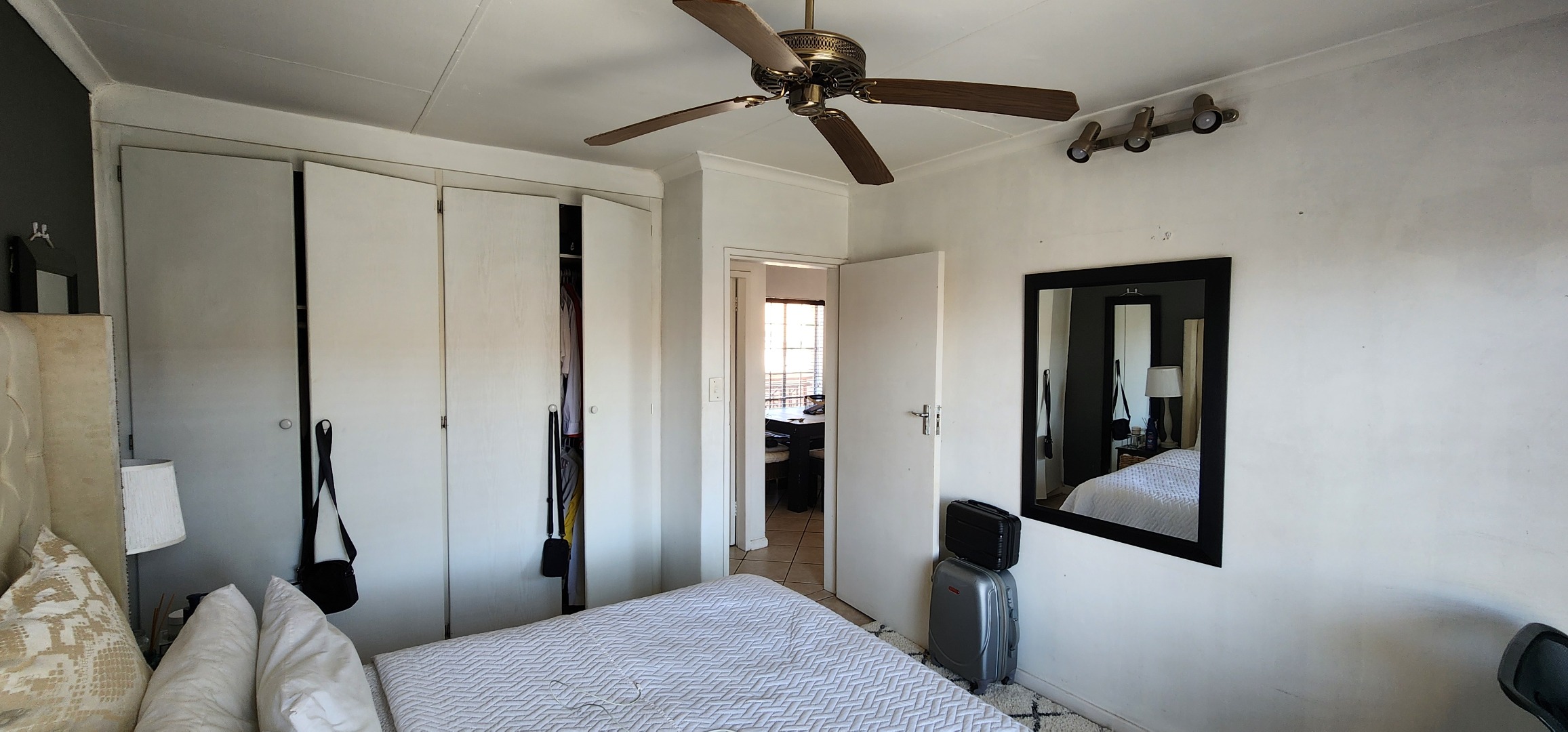 Welcome to this 2-bedroom, 1-bathroom first-floor apartment located in a secure complex. Step through the front door, complete with a security gate, into the dining area. To the left, the kitchen offers ample cupboard storage, a wash basin, space for a single-door fridge, and dedicated outlets for two appliances. Across from the kitchen, the comfortable TV lounge flows seamlessly onto a large, enclosed balcony with aluminum windows and a security gate.