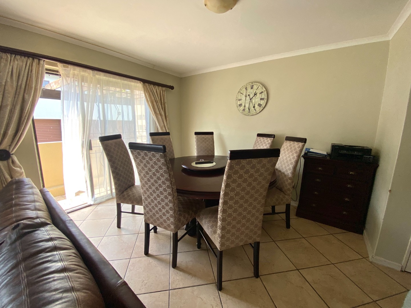 The living and dining areas flow freely, with high-quality tiles and neutral tones that create a modern yet inviting atmosphere. Large sliding doors lead out onto a covered balcony space, providing the perfect setting for weekend braais, morning coffee, or evening relaxation — all while enjoying the peaceful ambiance of the estate.