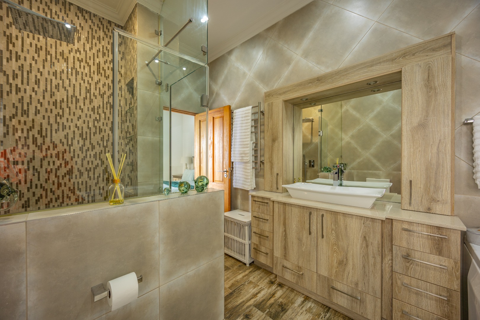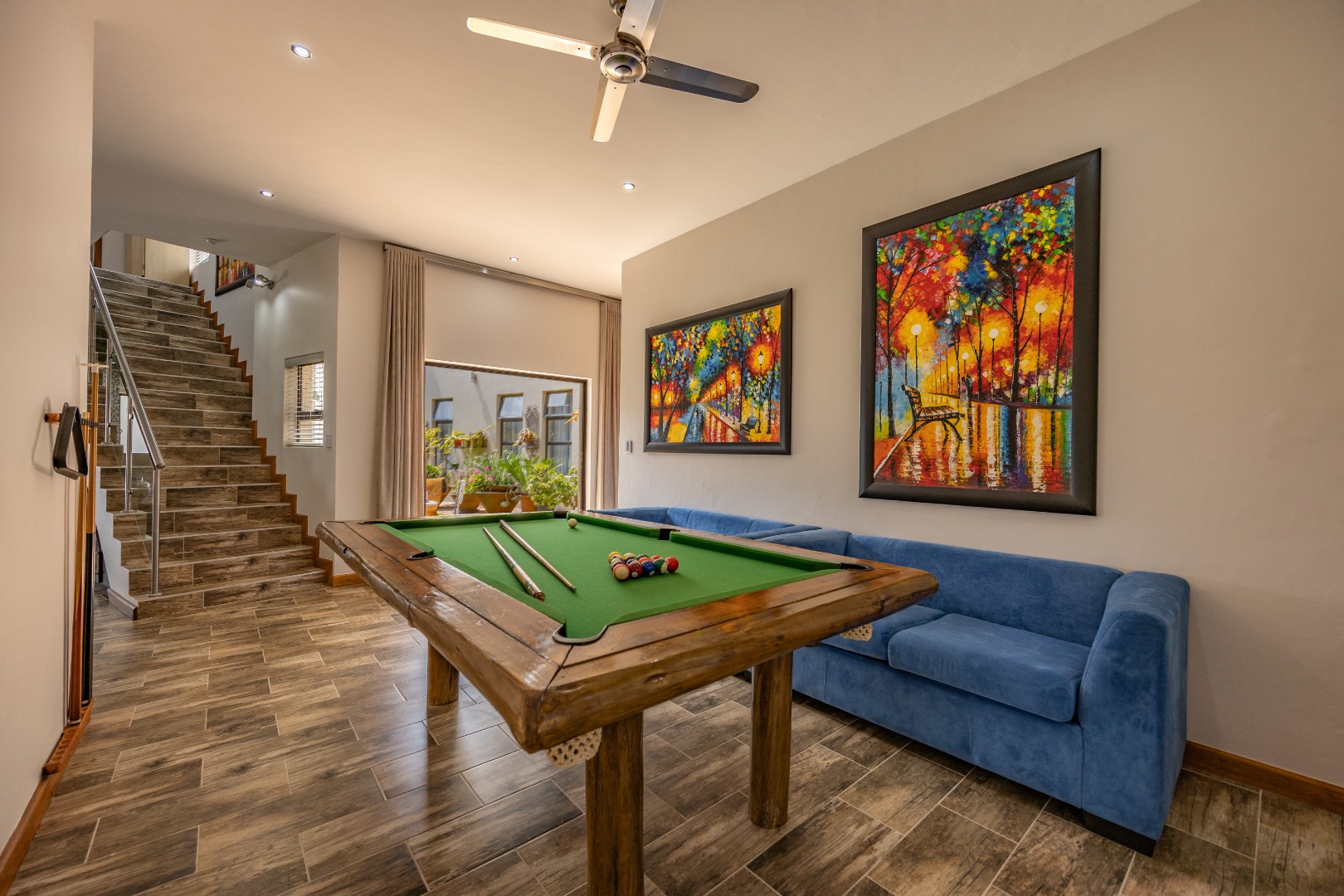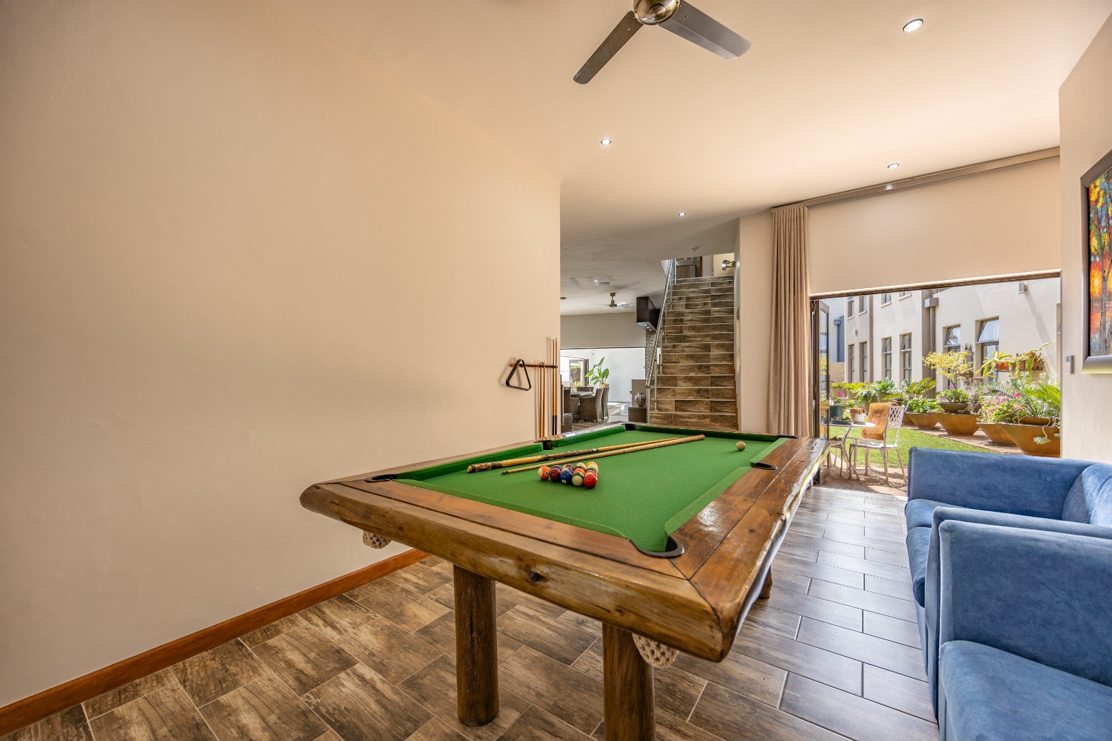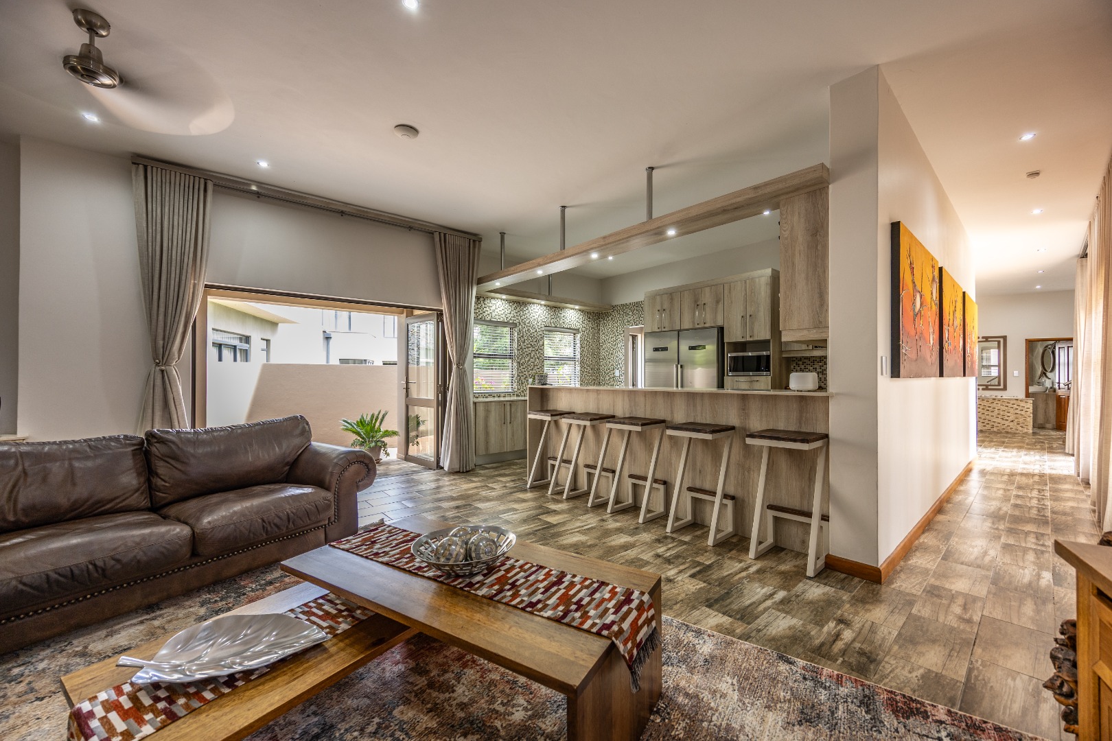 Experience unparalleled elegance in this remarkable 11-bedroom residence situated in the exclusive Copperleaf Golf & Country Estate. Overlooking the 12th and 13th holes of the Ernie Els-designed golf course and framed by the majestic Magaliesberg mountain range, this 1,200m² masterpiece redefines luxury living. Designed for multi-generational families, boutique guest accommodation, or discerning entertainers, the property spans four distinct homes that combine comfort, sophistication, and practicality. The main house boasts four expansive en-suite bedrooms with walk-in closets, including a grand master suite with air-conditioning and a double spa bath. The open-plan kitchen, complete with a scullery, pantry, and gas appliances, flows effortlessly into the lounge and dining areas, enhanced by a built-in gas heater and large stacking doors that frame breathtaking sunset views across the fairways.
