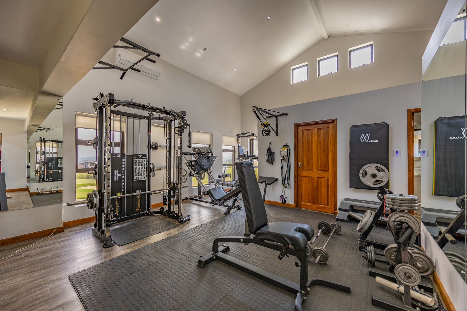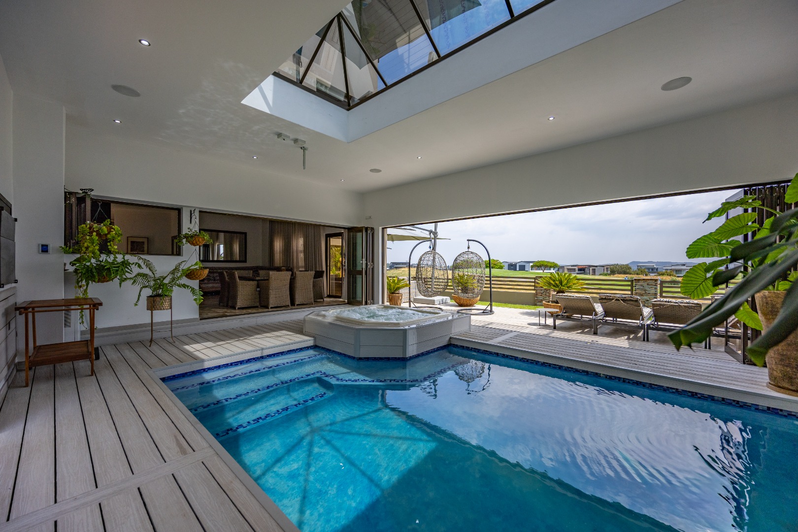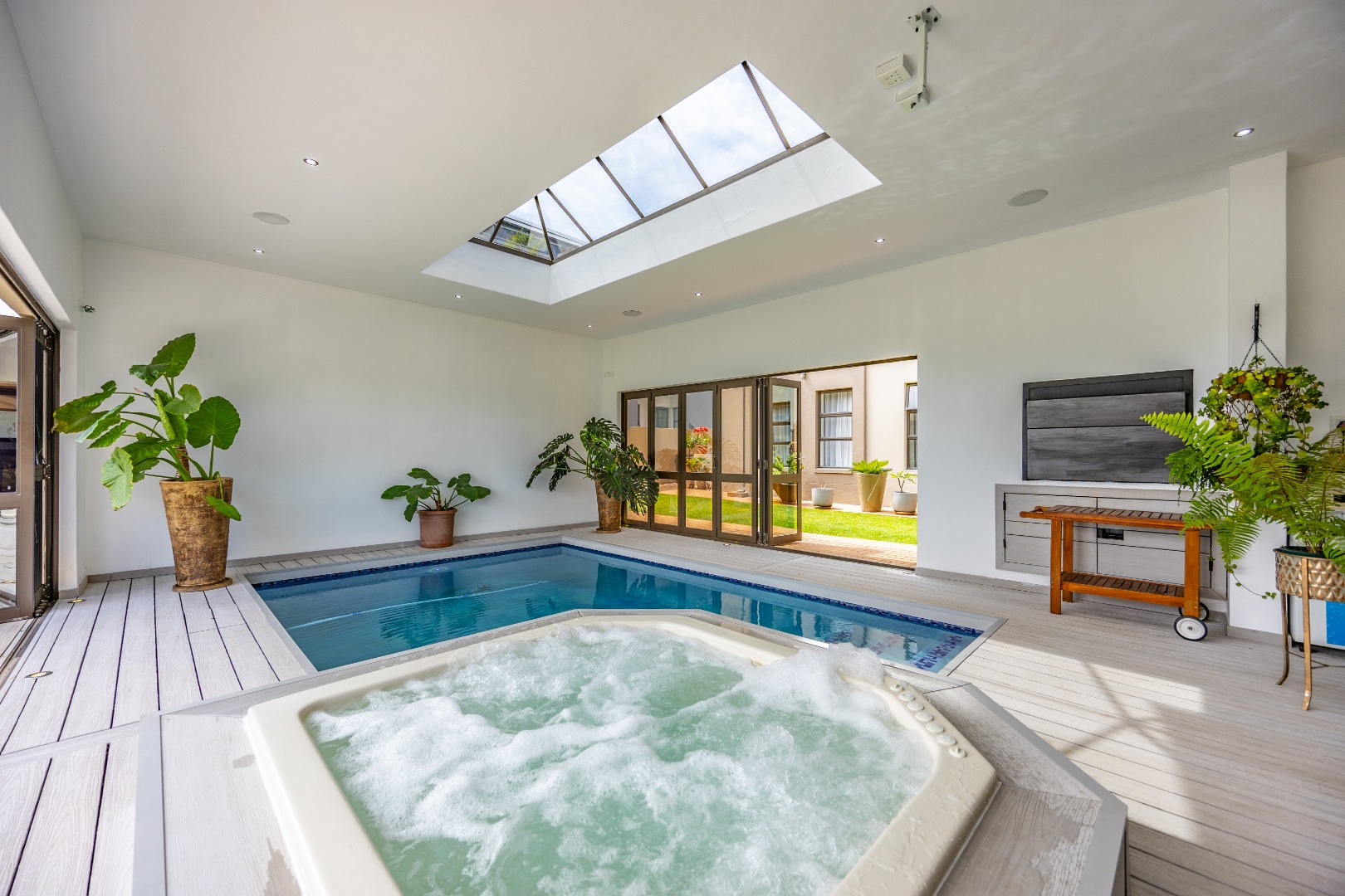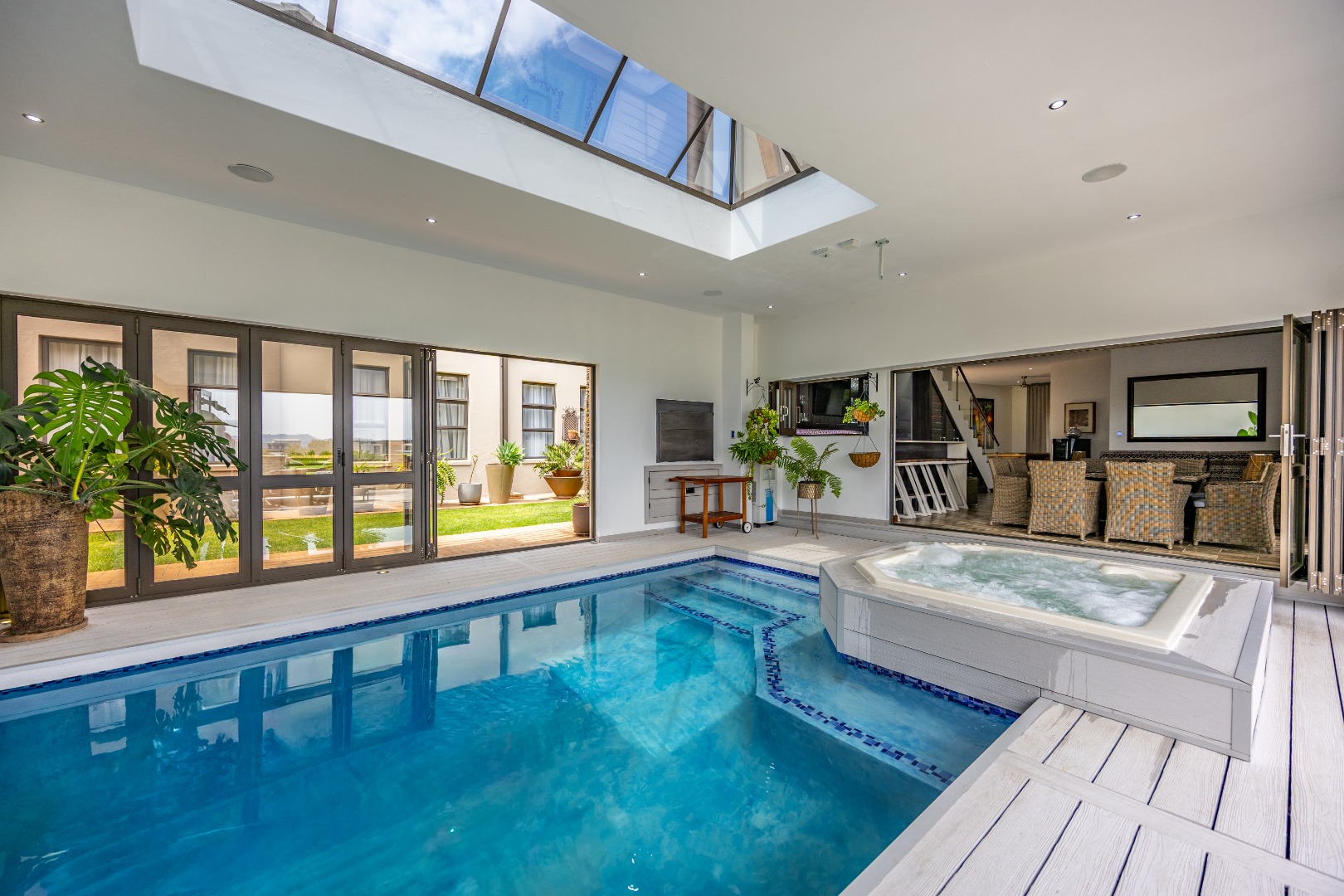 The entertainment complex is designed for unforgettable gatherings, featuring a built-in bar, cool room, games area, and an air-conditioned entertainment lounge that opens seamlessly onto a deck overlooking the golf course. At its heart lies an indoor heated saltwater pool and an 8-seater Jacuzzi under a stunning pyramid skylight, creating a private oasis for year-round relaxation. A spacious office suite includes a large open-plan workspace, boardroom, salon/office, kitchenette, and a private bathroom with shower — ideal for those working from home. Fitness enthusiasts will appreciate the fully air-conditioned gym with panoramic golf course views, an indoor squash court that doubles as a golf simulator, and an upper balcony fitted with a gas braai. The home also features six garages (including a golf cart garage), a linen room, pantry storage, and separate staff accommodation for convenience.