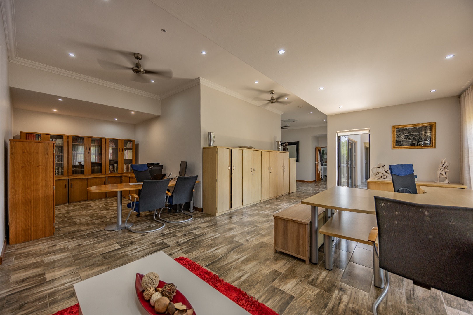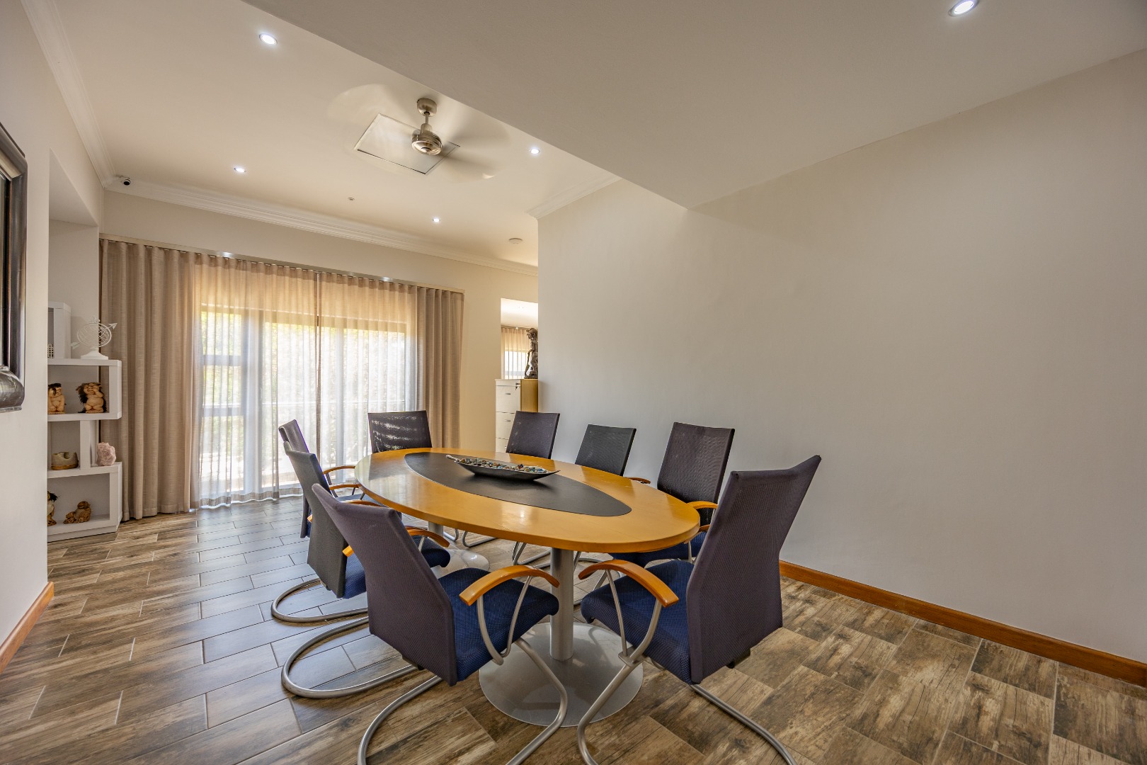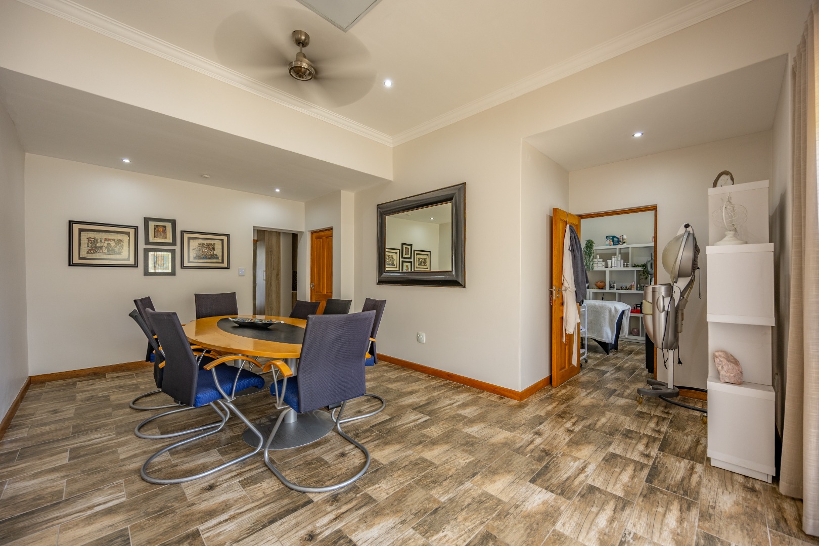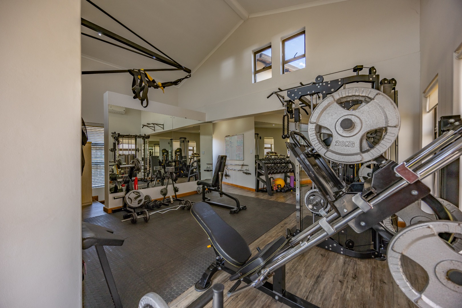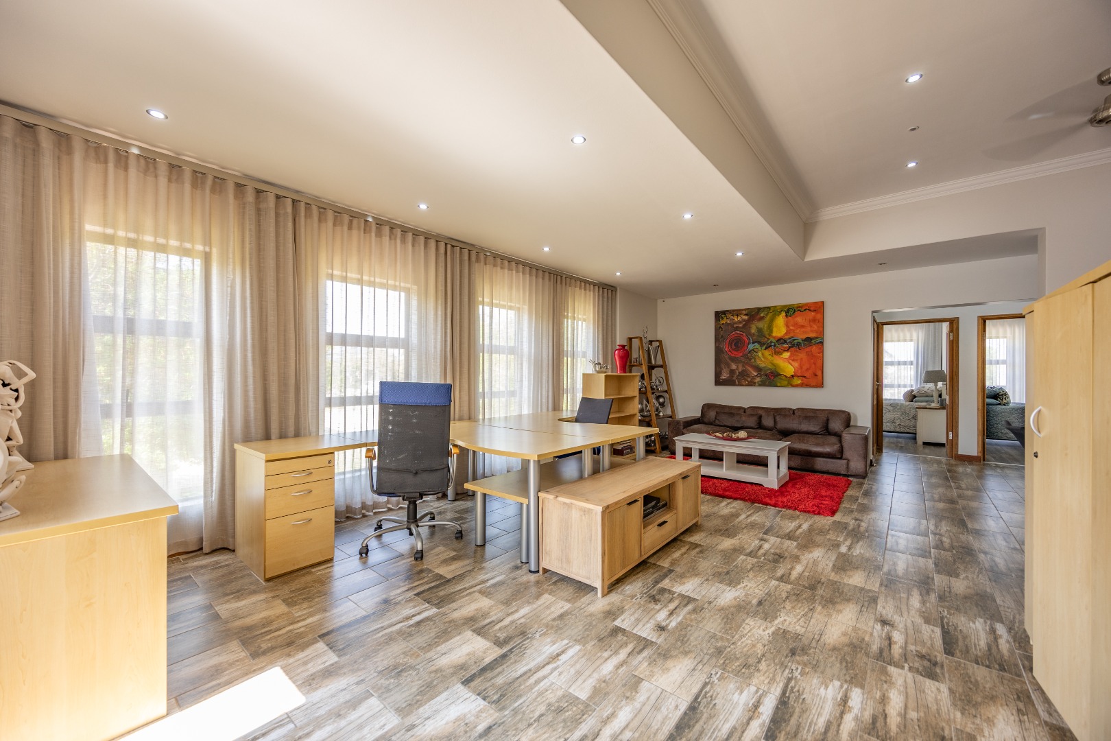 The entertainment complex is designed for unforgettable gatherings, featuring a built-in bar, cool room, games area, and an air-conditioned entertainment lounge that opens seamlessly onto a deck overlooking the golf course. At its heart lies an indoor heated saltwater pool and an 8-seater Jacuzzi under a stunning pyramid skylight, creating a private oasis for year-round relaxation. A spacious office suite includes a large open-plan workspace, boardroom, salon/office, kitchenette, and a private bathroom with shower — ideal for those working from home. Fitness enthusiasts will appreciate the fully air-conditioned gym with panoramic golf course views, an indoor squash court that doubles as a golf simulator, and an upper balcony fitted with a gas braai. The home also features six garages (including a golf cart garage), a linen room, pantry storage, and separate staff accommodation for convenience.