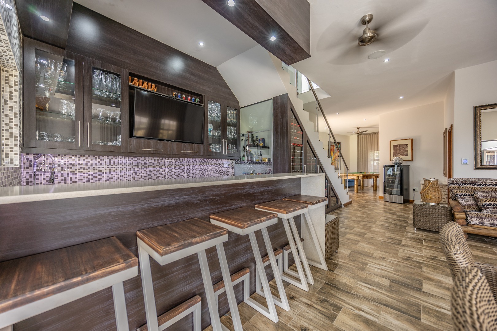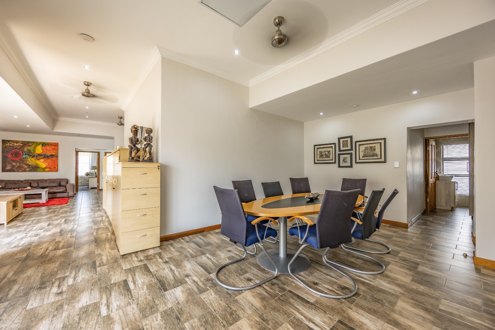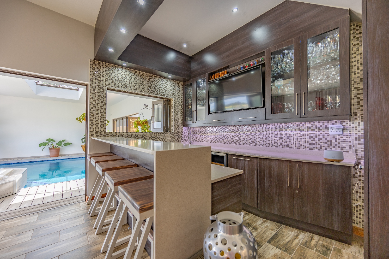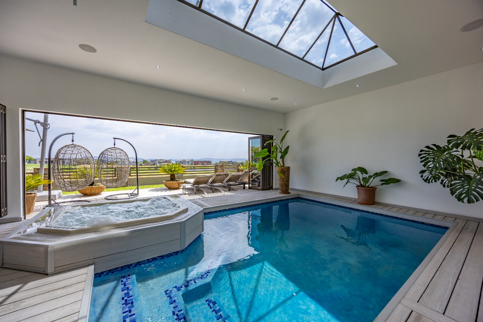 The entertainment complex is designed for unforgettable gatherings, featuring a built-in bar, cool room, games area, and an air-conditioned entertainment lounge that opens seamlessly onto a deck overlooking the golf course. At its heart lies an indoor heated saltwater pool and an 8-seater Jacuzzi under a stunning pyramid skylight, creating a private oasis for year-round relaxation. A spacious office suite includes a large open-plan workspace, boardroom, salon/office, kitchenette, and a private bathroom with shower — ideal for those working from home. Fitness enthusiasts will appreciate the fully air-conditioned gym with panoramic golf course views, an indoor squash court that doubles as a golf simulator, and an upper balcony fitted with a gas braai. The home also features six garages (including a golf cart garage), a linen room, pantry storage, and separate staff accommodation for convenience.