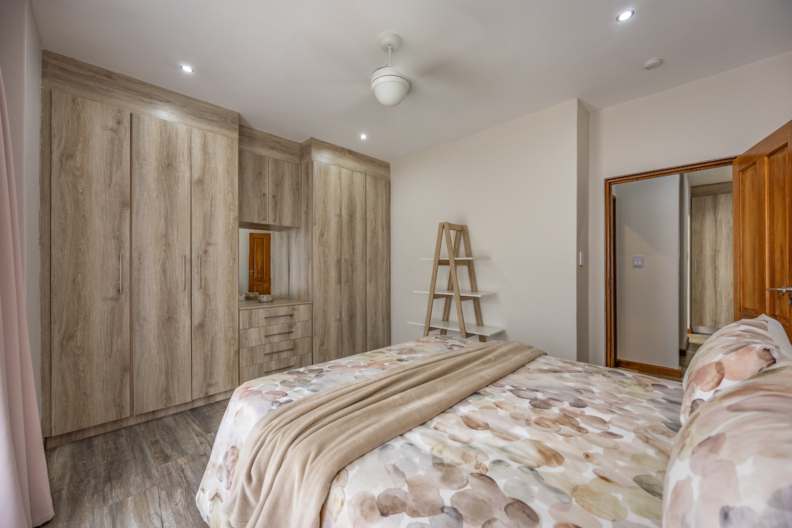 - Flat 2: Offers two bedrooms (main with a walk-in closet), a full bathroom, an open-plan lounge and dining area, a kitchen with a scullery, two garages, and a private patio.