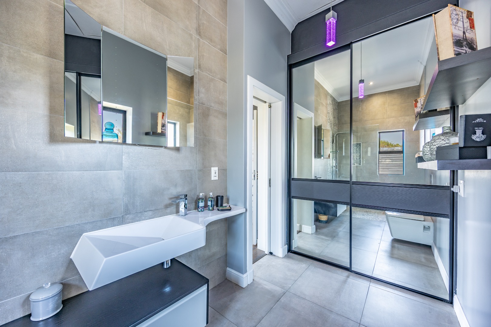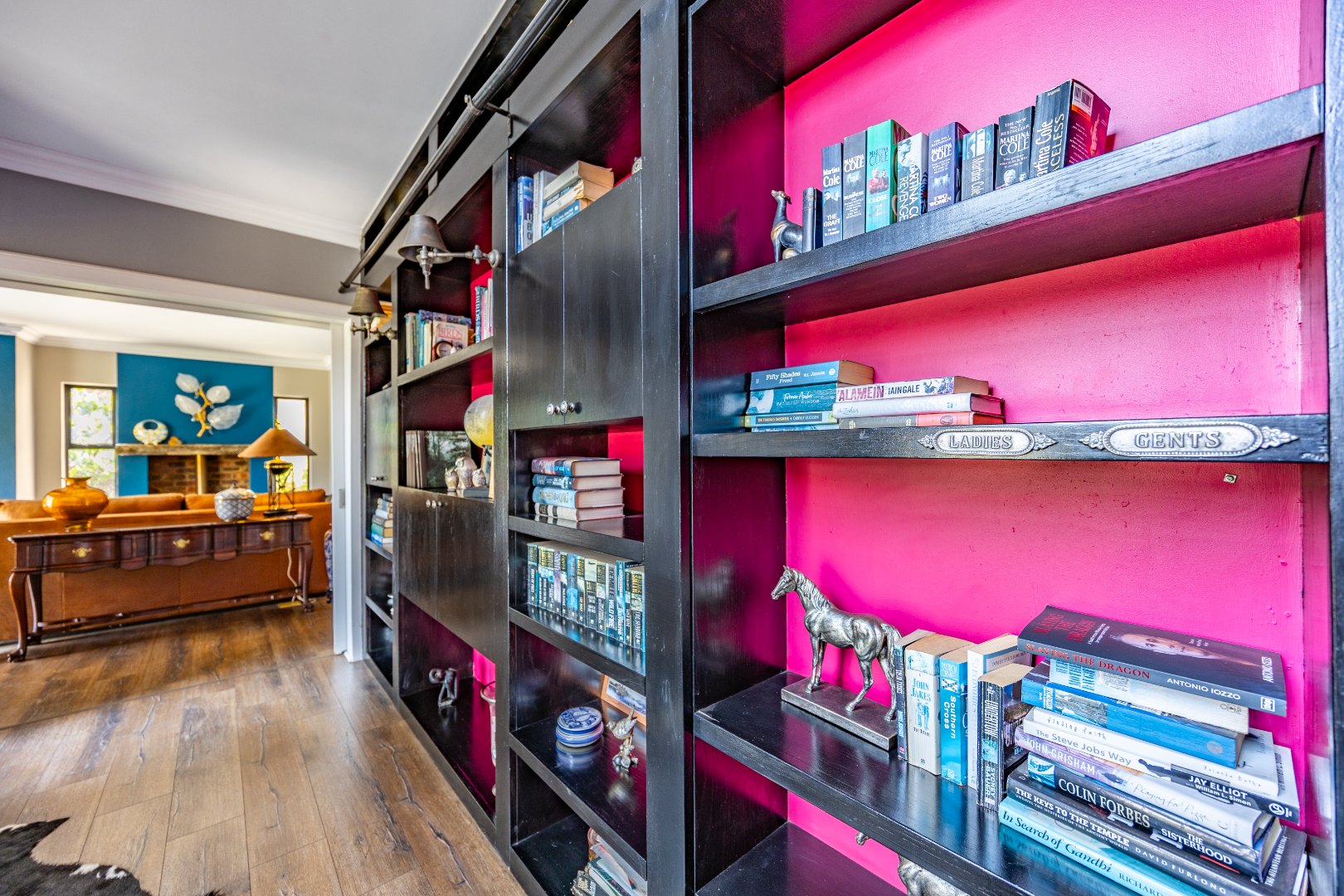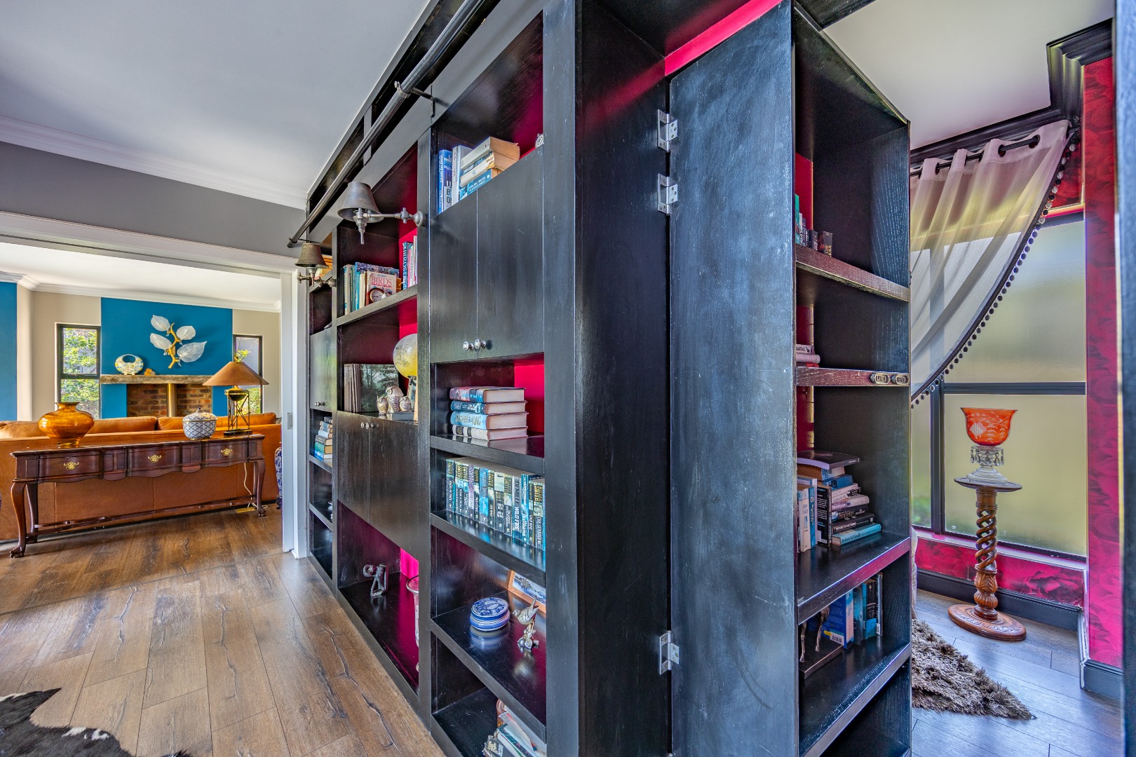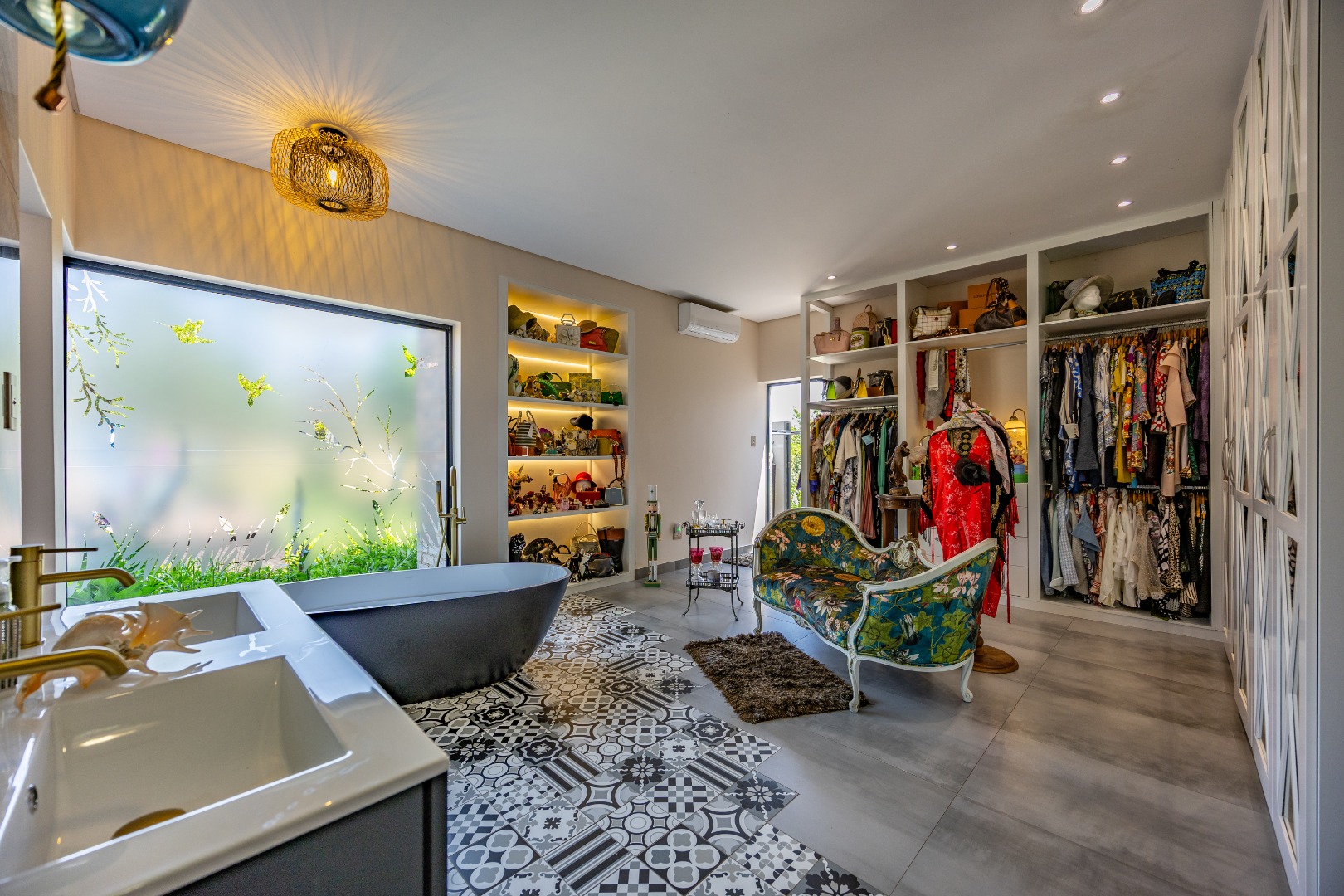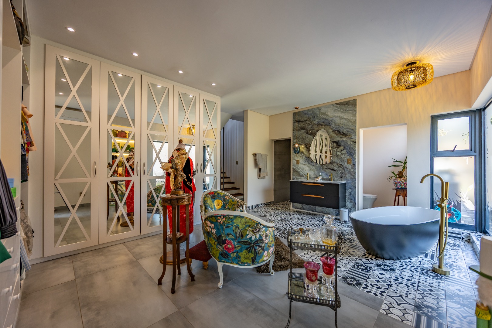 Here's where it gets even better: sustainability is built right in. With a full Sunsynk 8.8kVA solar system, 12 solar panels, and dual water tanks, you're looking at eco-conscious, near off-grid living without sacrificing an ounce of comfort. The library design with a hidden bathroom and a study nook tucked beneath a wrought-iron staircase add delightful surprises around every corner. The main suit is luxury at its finest, with high ceilings, panoramic windows, a walk-in dressing room, and an opulent en-suite that overlooks the garden.