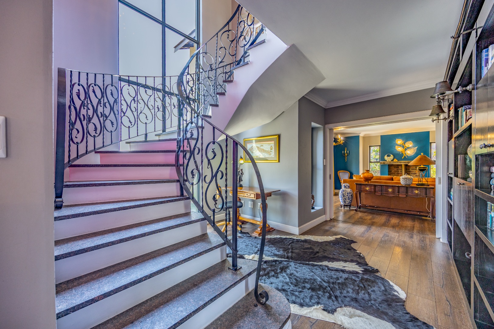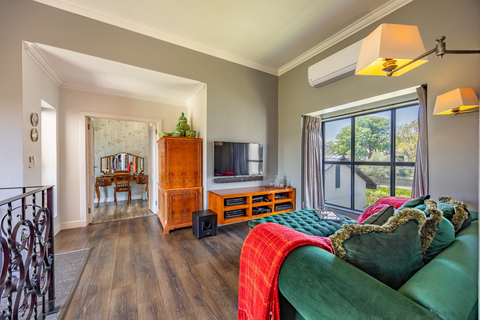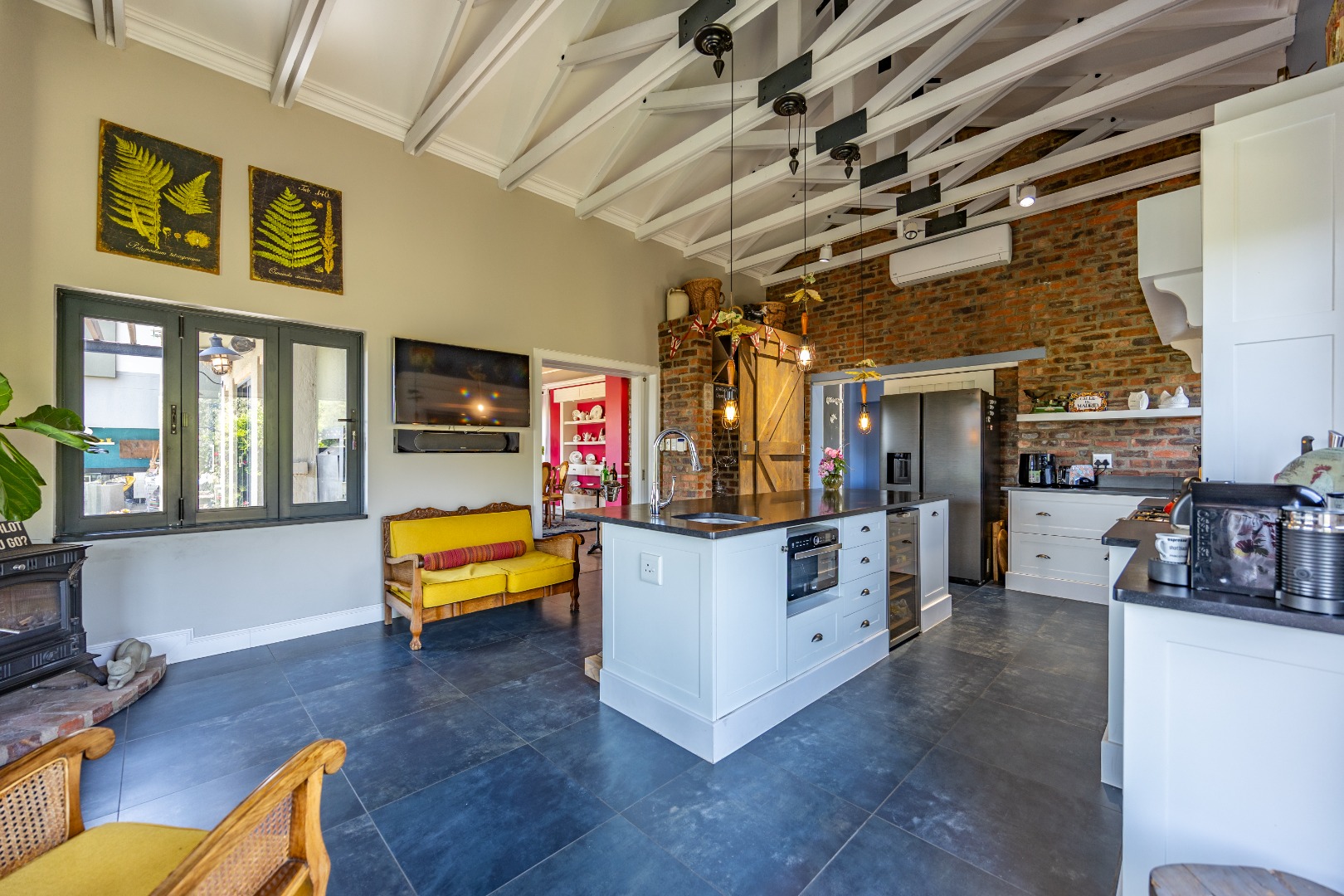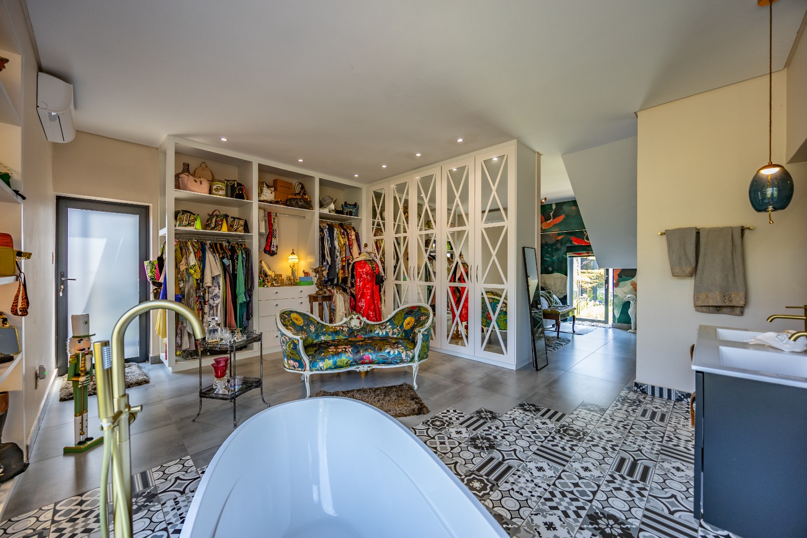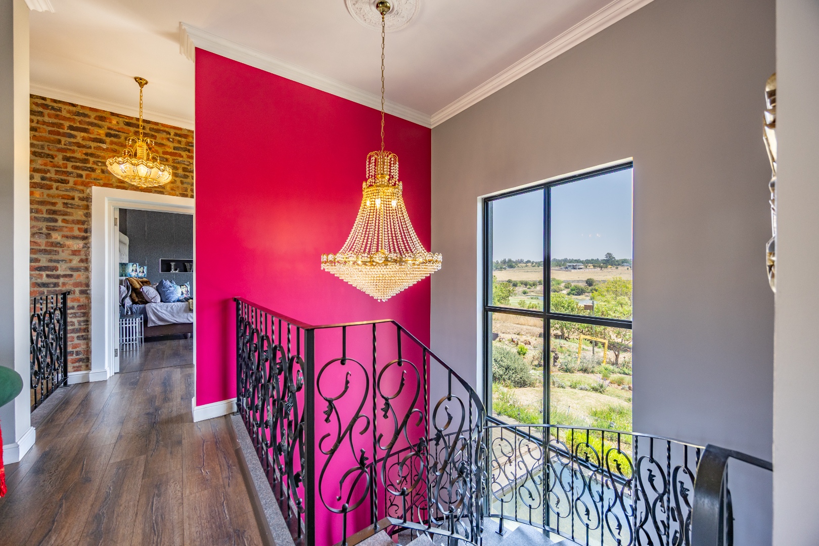 Here's where it gets even better: sustainability is built right in. With a full Sunsynk 8.8kVA solar system, 12 solar panels, and dual water tanks, you're looking at eco-conscious, near off-grid living without sacrificing an ounce of comfort. The library design with a hidden bathroom and a study nook tucked beneath a wrought-iron staircase add delightful surprises around every corner. The main suit is luxury at its finest, with high ceilings, panoramic windows, a walk-in dressing room, and an opulent en-suite that overlooks the garden.