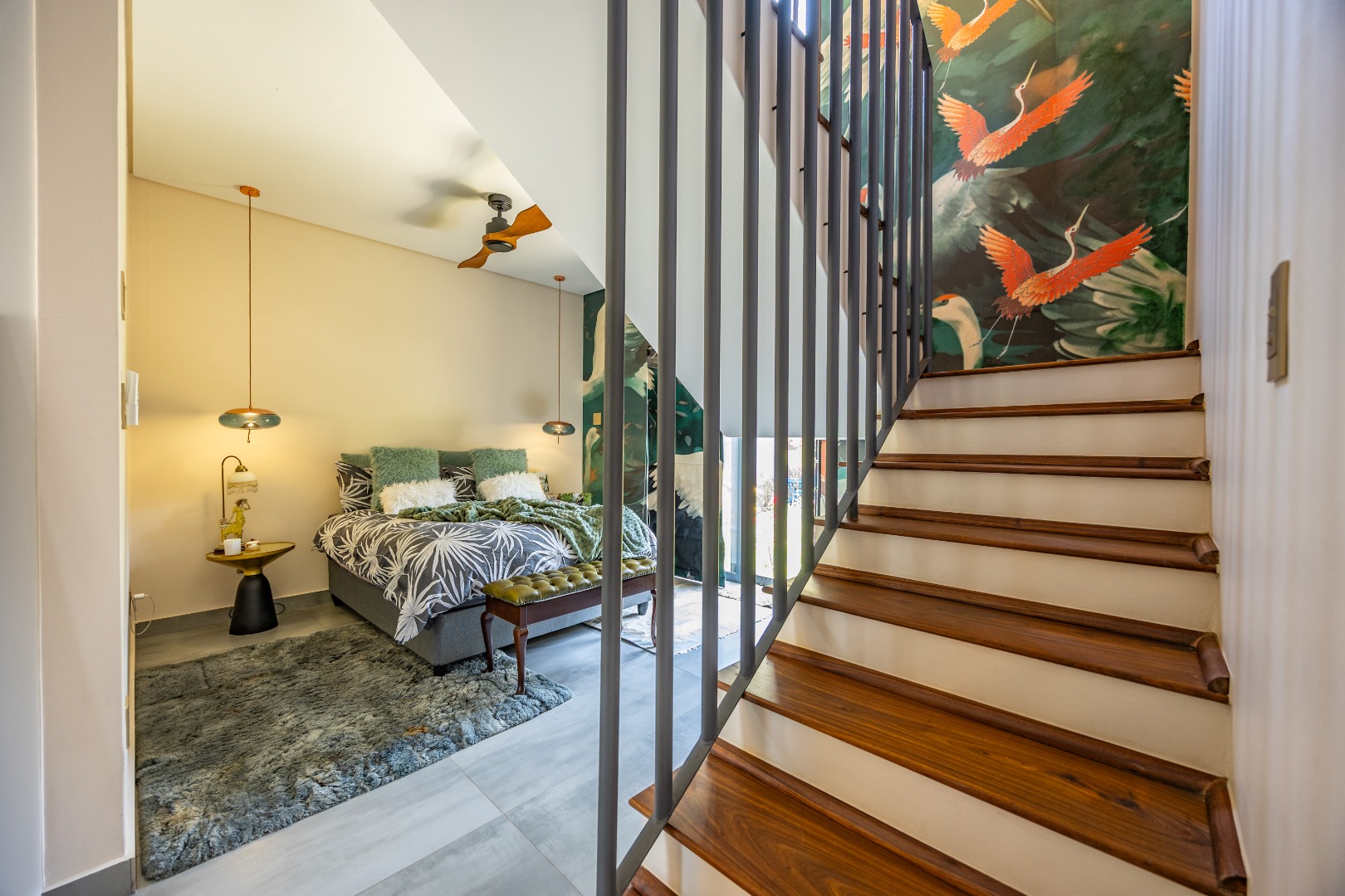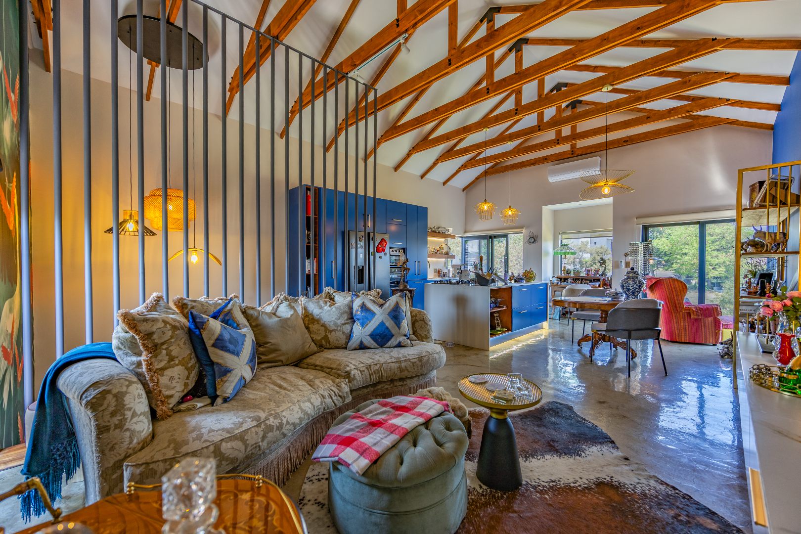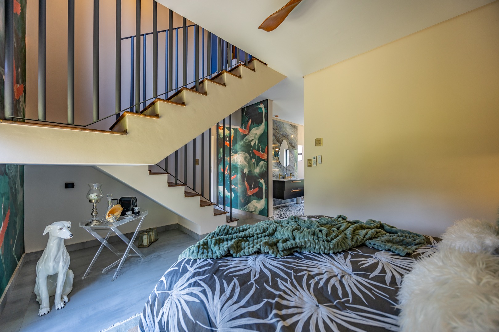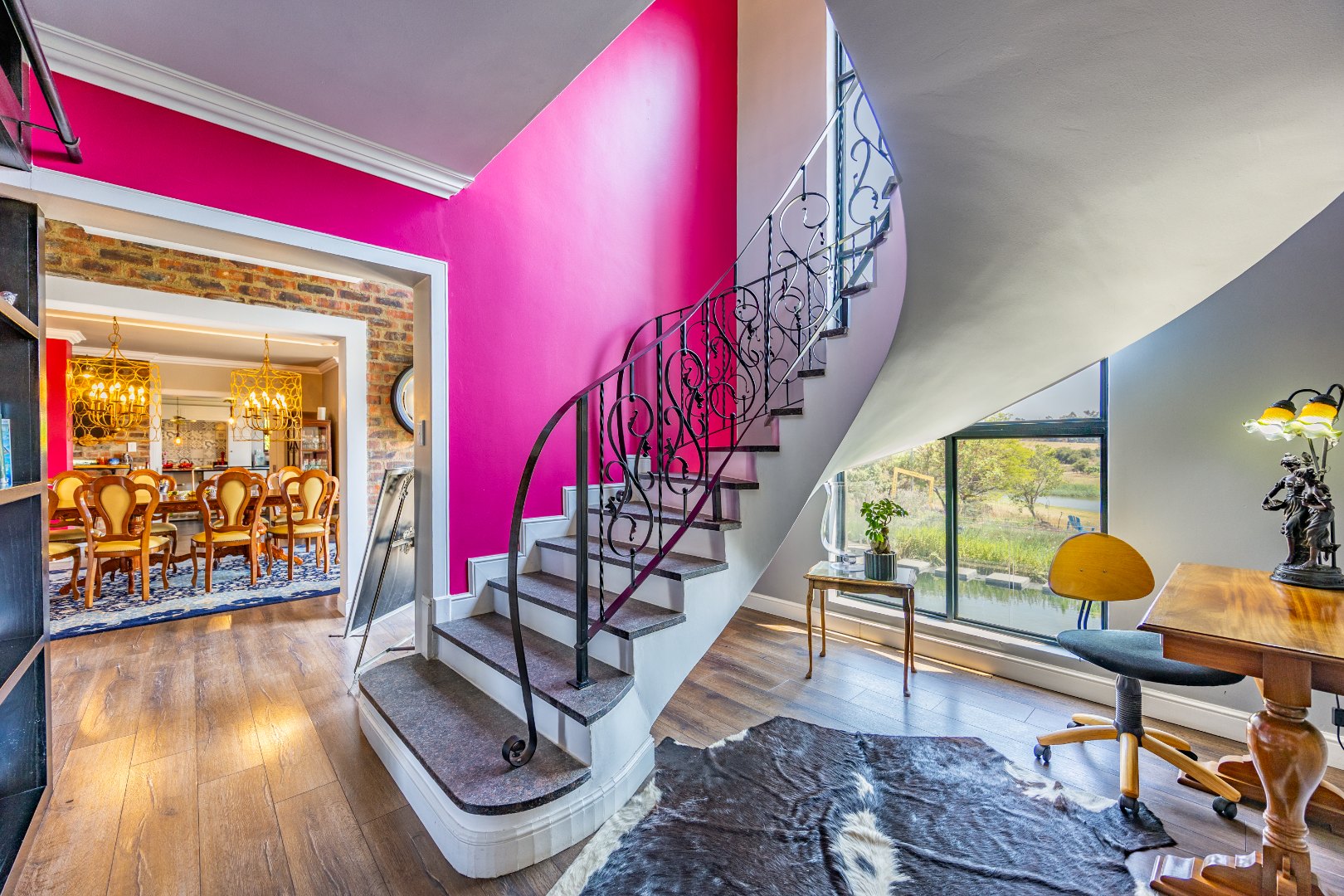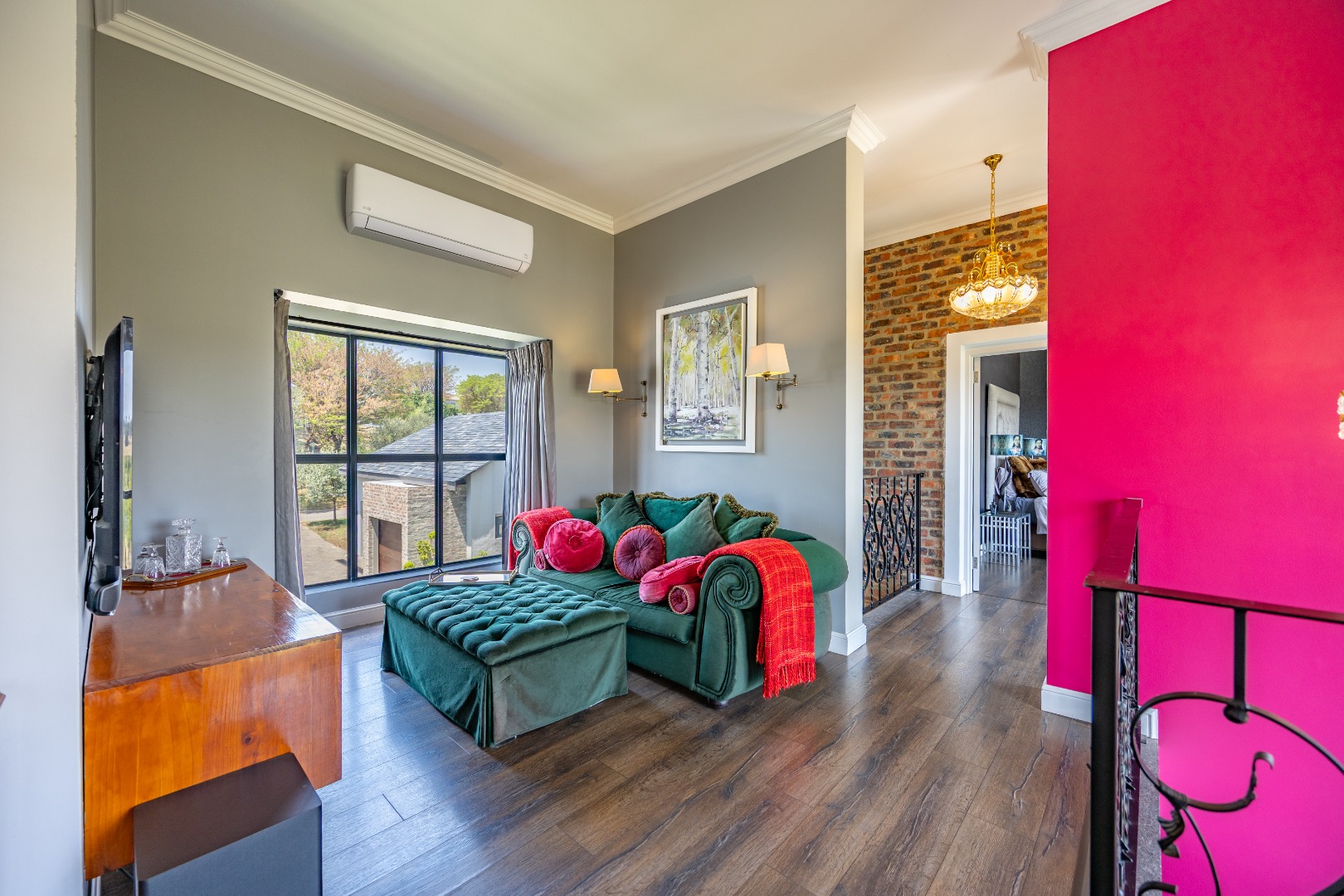 Here's where it gets even better: sustainability is built right in. With a full Sunsynk 8.8kVA solar system, 12 solar panels, and dual water tanks, you're looking at eco-conscious, near off-grid living without sacrificing an ounce of comfort. The library design with a hidden bathroom and a study nook tucked beneath a wrought-iron staircase add delightful surprises around every corner. The main suit is luxury at its finest, with high ceilings, panoramic windows, a walk-in dressing room, and an opulent en-suite that overlooks the garden.