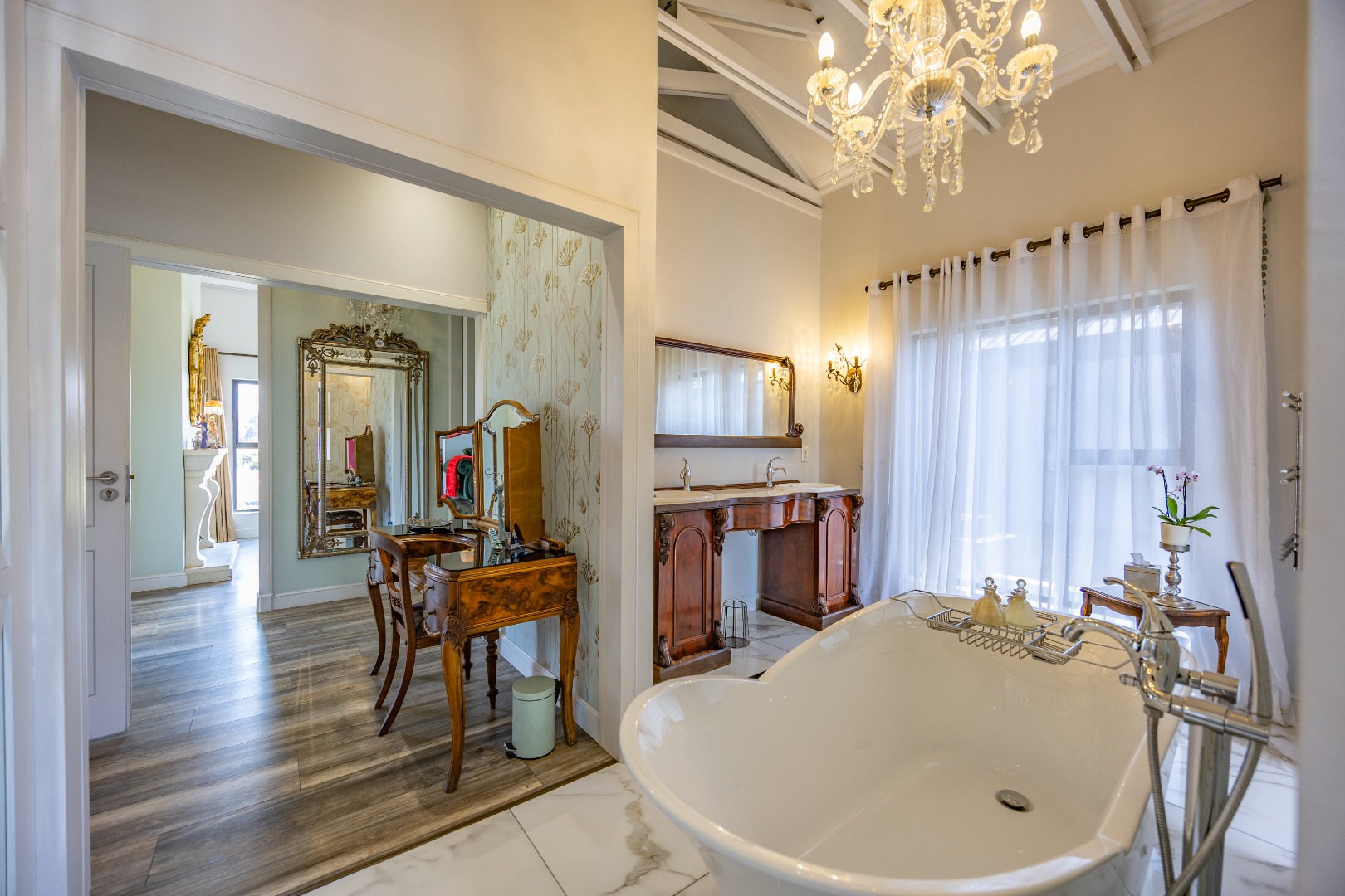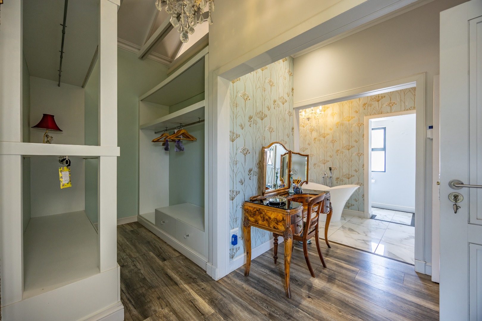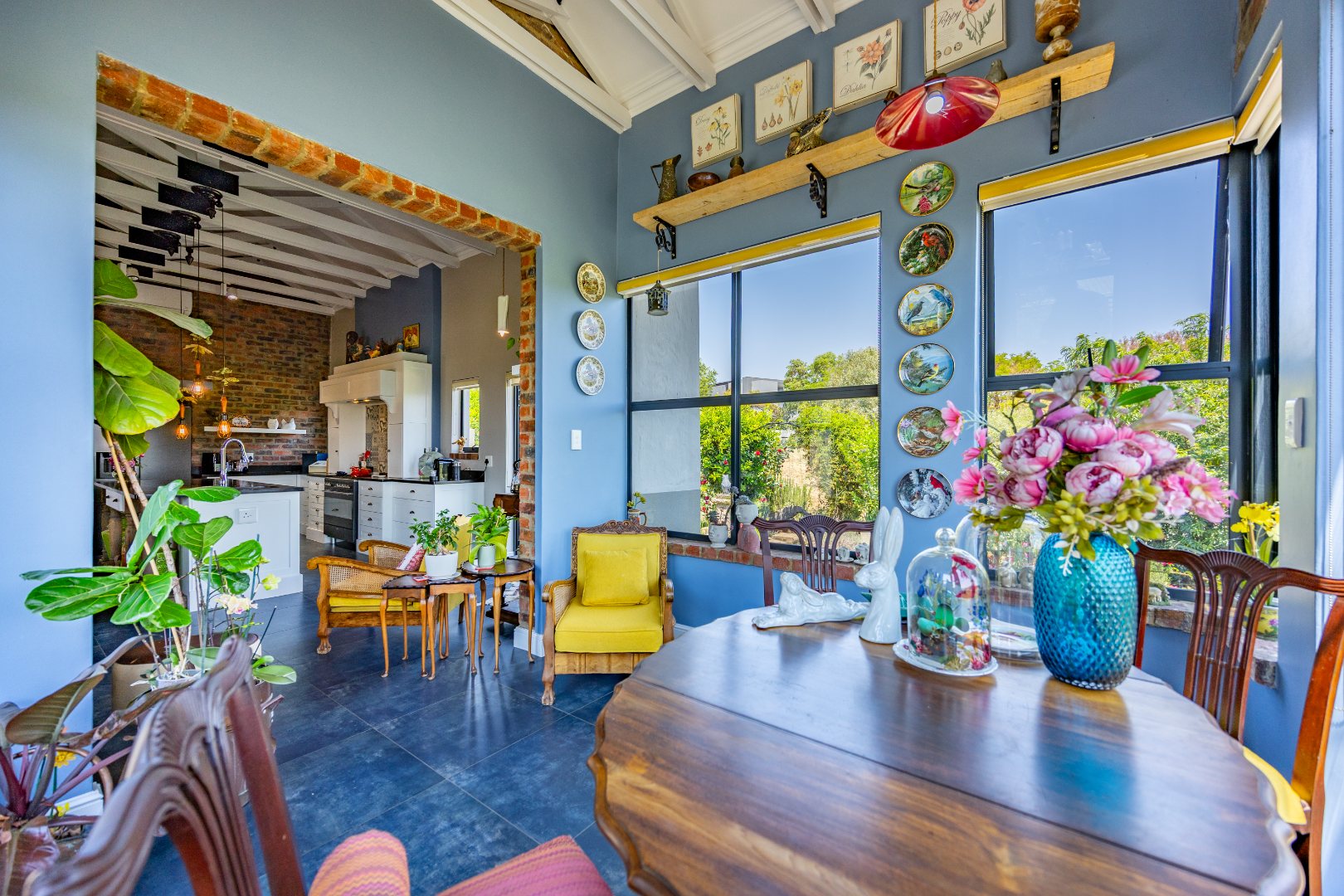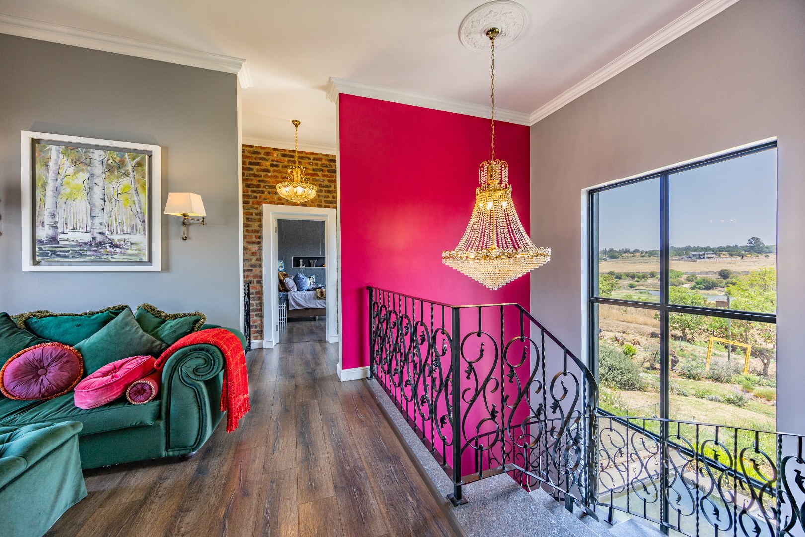 Here's where it gets even better: sustainability is built right in. With a full Sunsynk 8.8kVA solar system, 12 solar panels, and dual water tanks, you're looking at eco-conscious, near off-grid living without sacrificing an ounce of comfort. The library design with a hidden bathroom and a study nook tucked beneath a wrought-iron staircase add delightful surprises around every corner. The main suit is luxury at its finest, with high ceilings, panoramic windows, a walk-in dressing room, and an opulent en-suite that overlooks the garden.