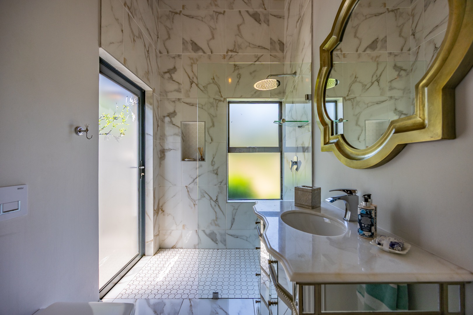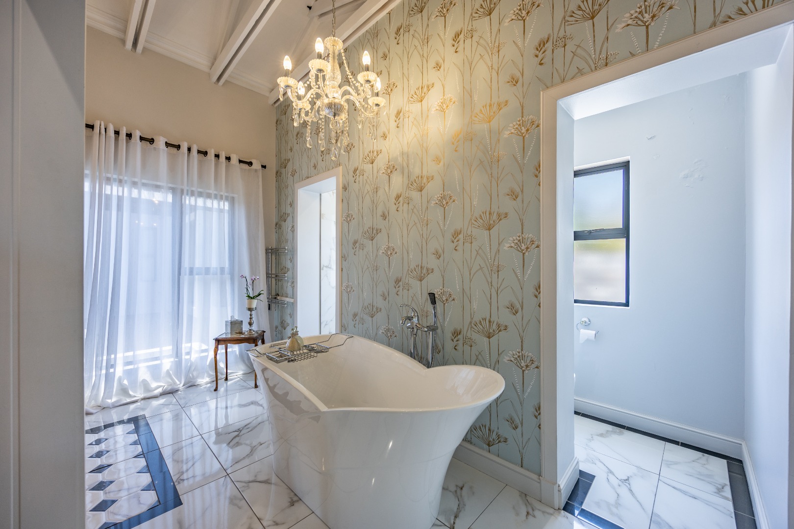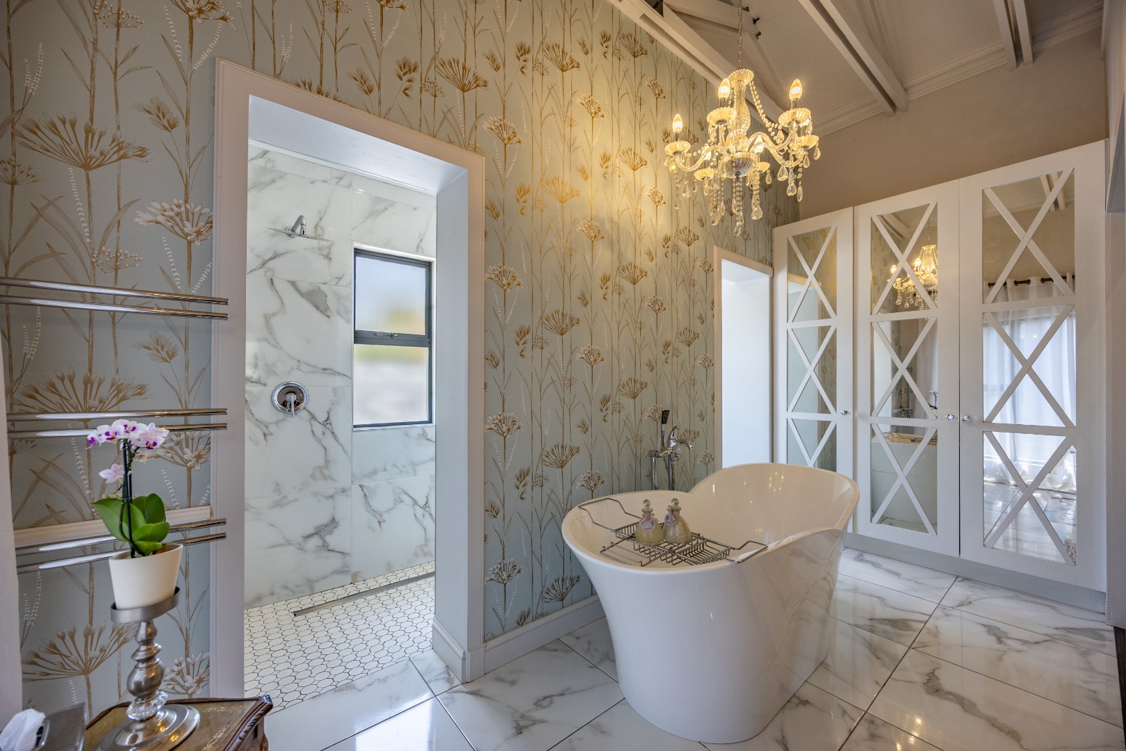 The moment you step inside, you're in for a treat. The home welcomes you with light-filled spaces that feel artistic and alive with personality. Picture yourself unwinding in spa-style bathrooms that feel like your own private sanctuary. We're talking about a stunning Victoria & Albert freestanding bath, natural stone finishes, and custom vanities that'll make every morning feel special. The interior is pure magic: designer wallpaper, bespoke lighting, gallery-style shelving, and hand-picked finishes that create an effortlessly sophisticated atmosphere.