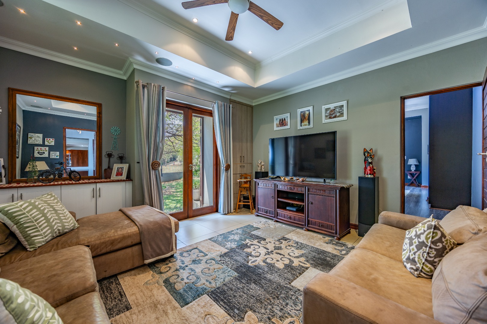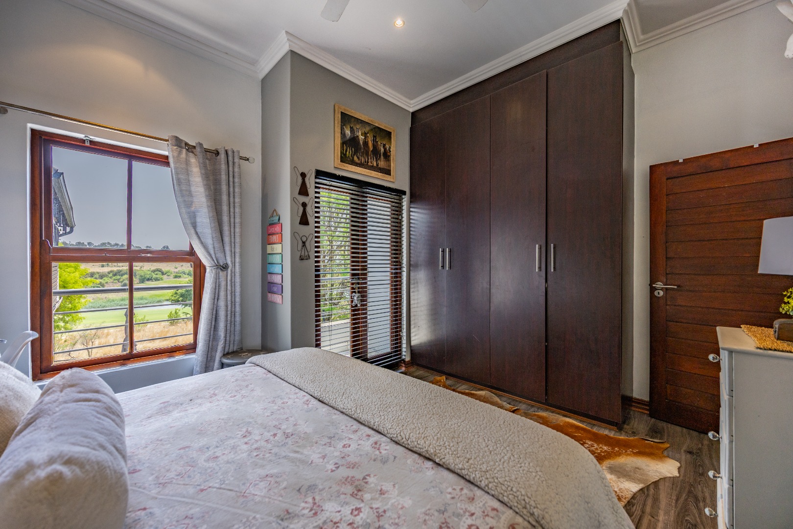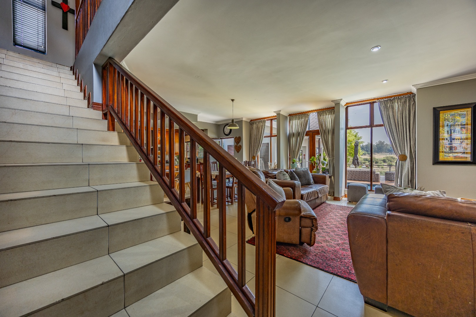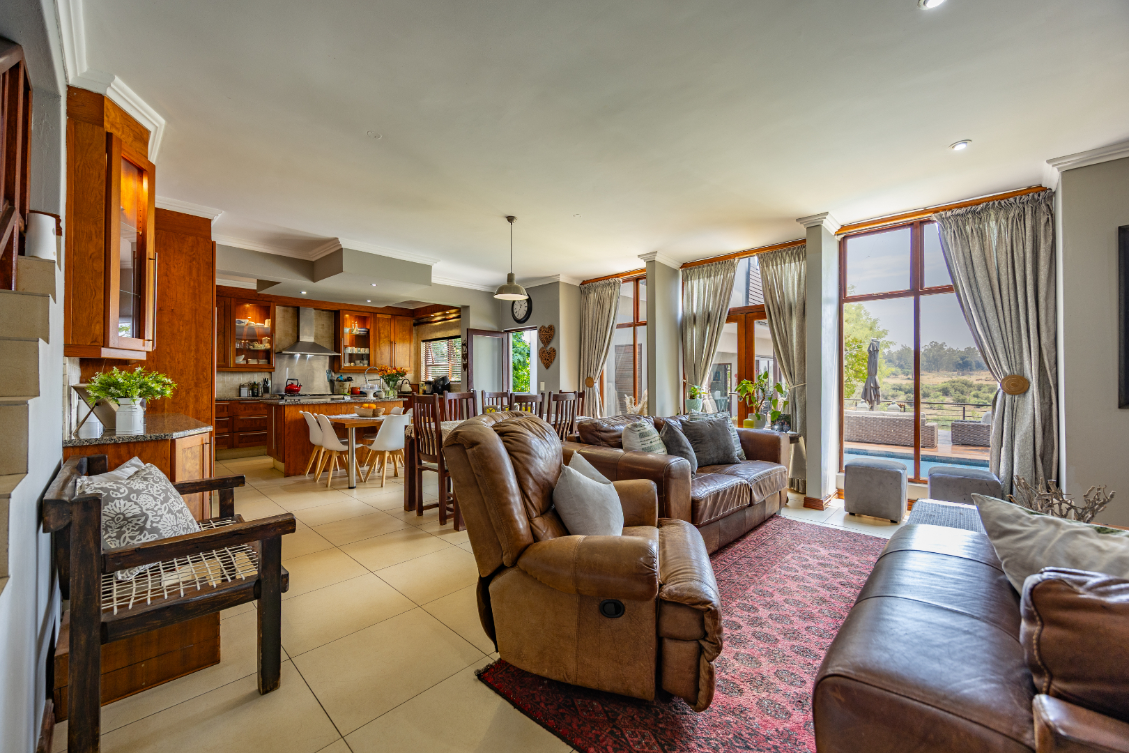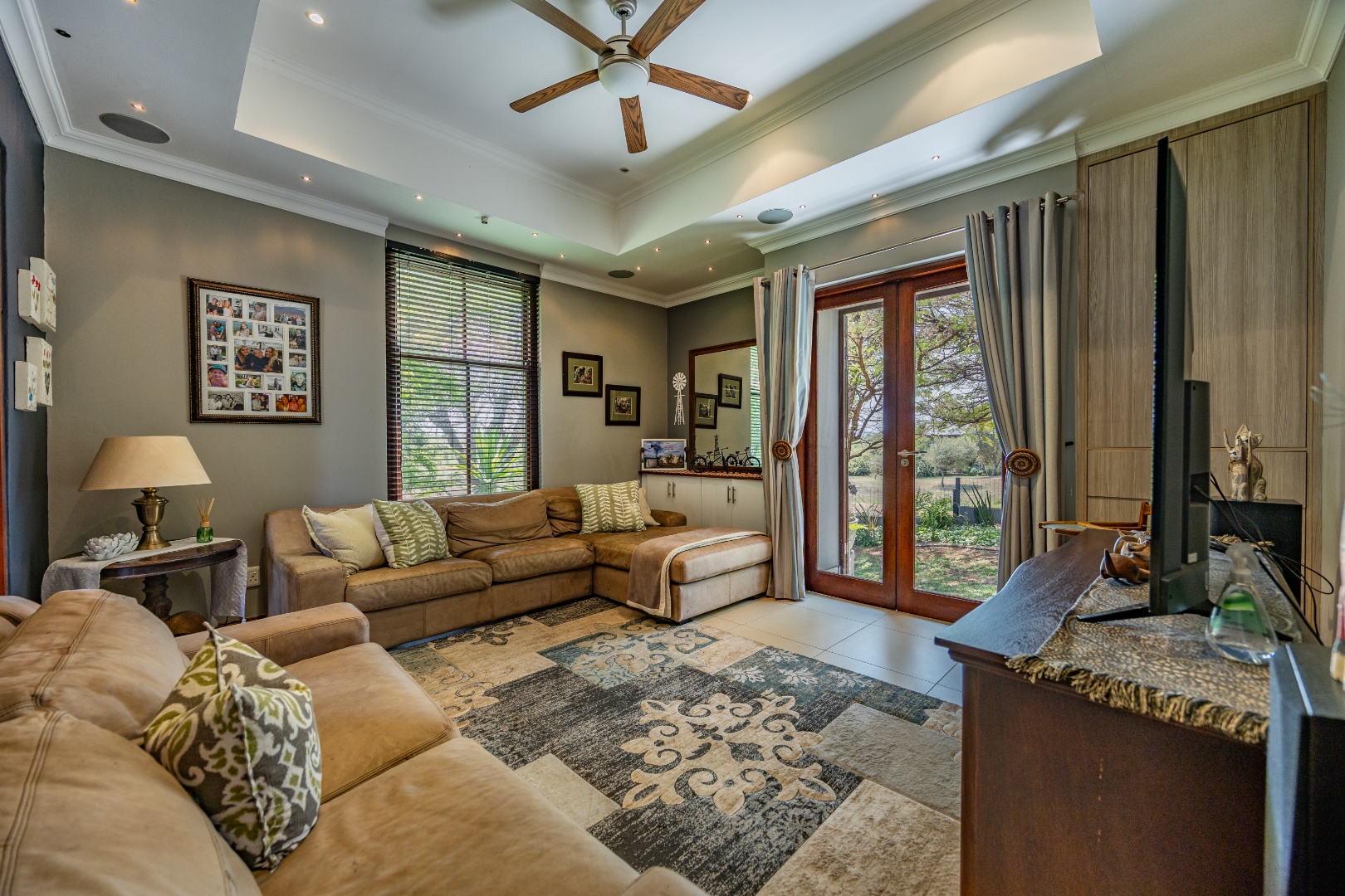 The upper level offers four additional bedrooms, each designed with comfort and privacy in mind. The main suite is a true retreat, boasting a fireplace, walk-in closet, and spa-inspired en-suite bathroom, while its private balcony captures breathtaking views over the Ernie Els Signature Golf Course and the Magaliesberg Mountains. Two more bedrooms also open onto the balcony, while the remaining room can serve as a study or children’s room. Multiple lounges throughout the home—one featuring surround sound and another with a ceiling fan and garden access—create versatile family spaces suited to both relaxation and entertainment.