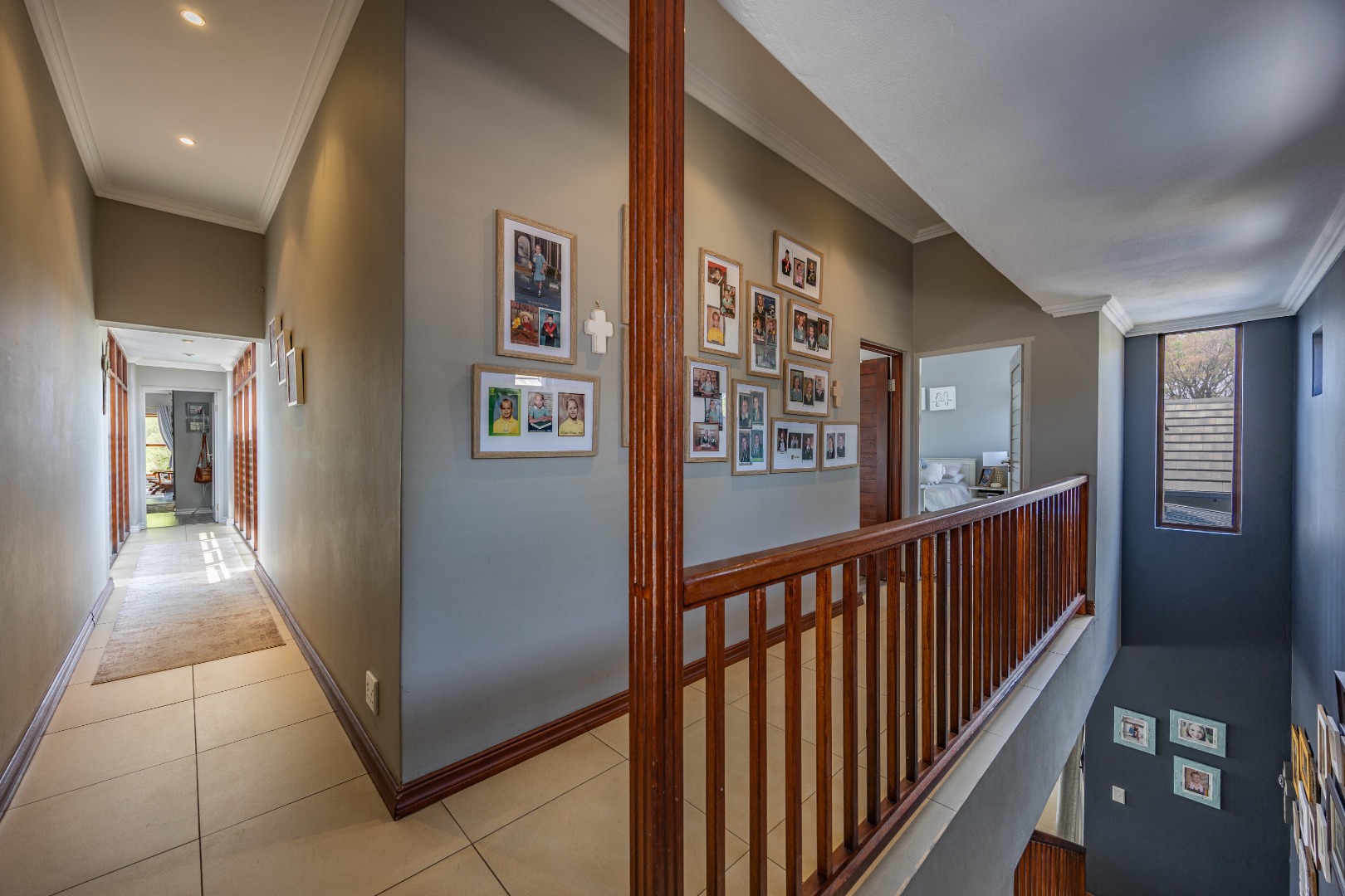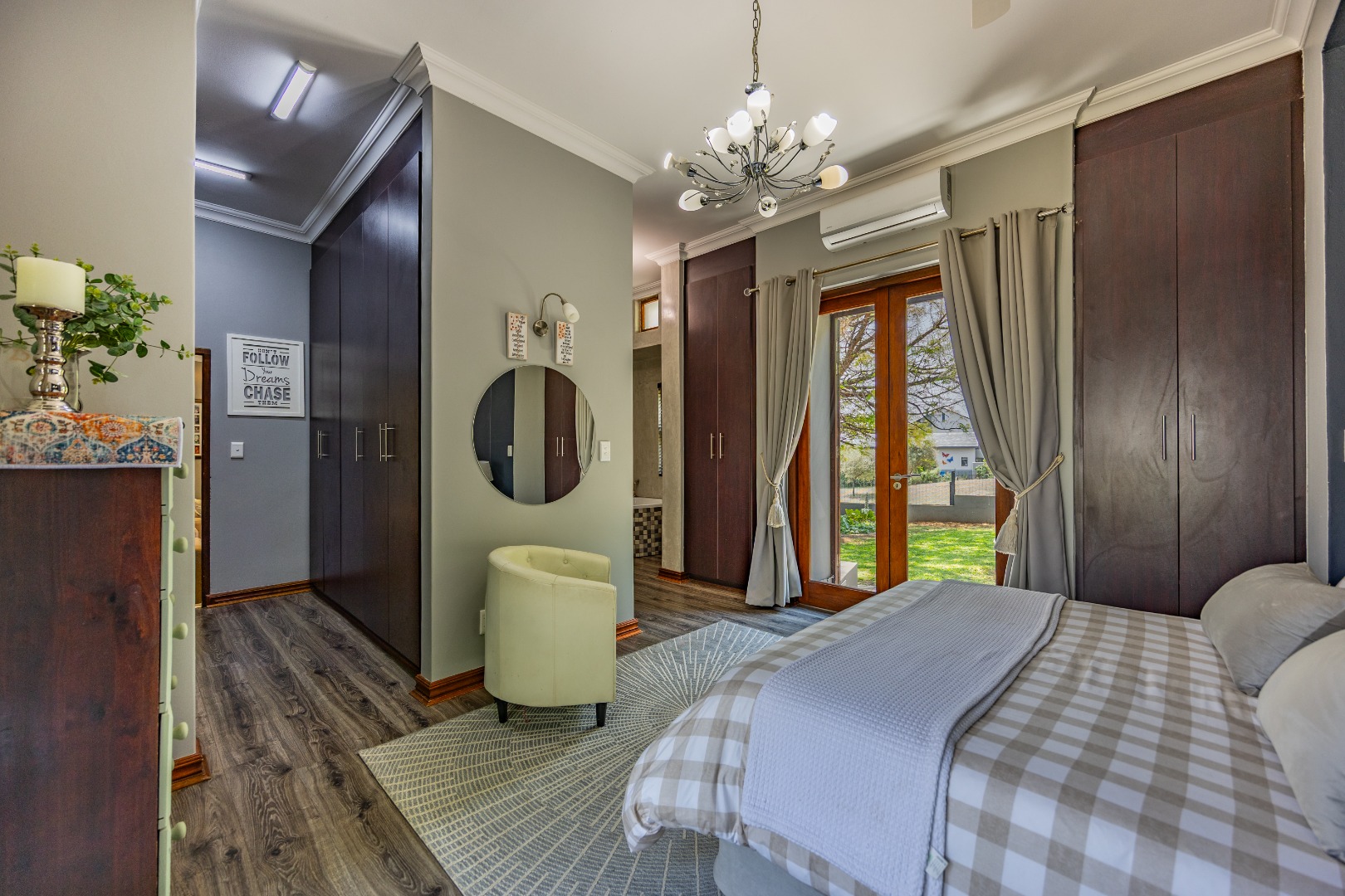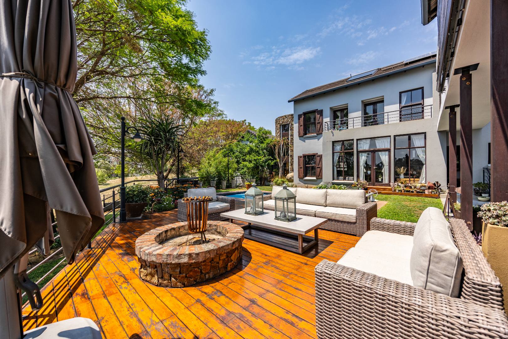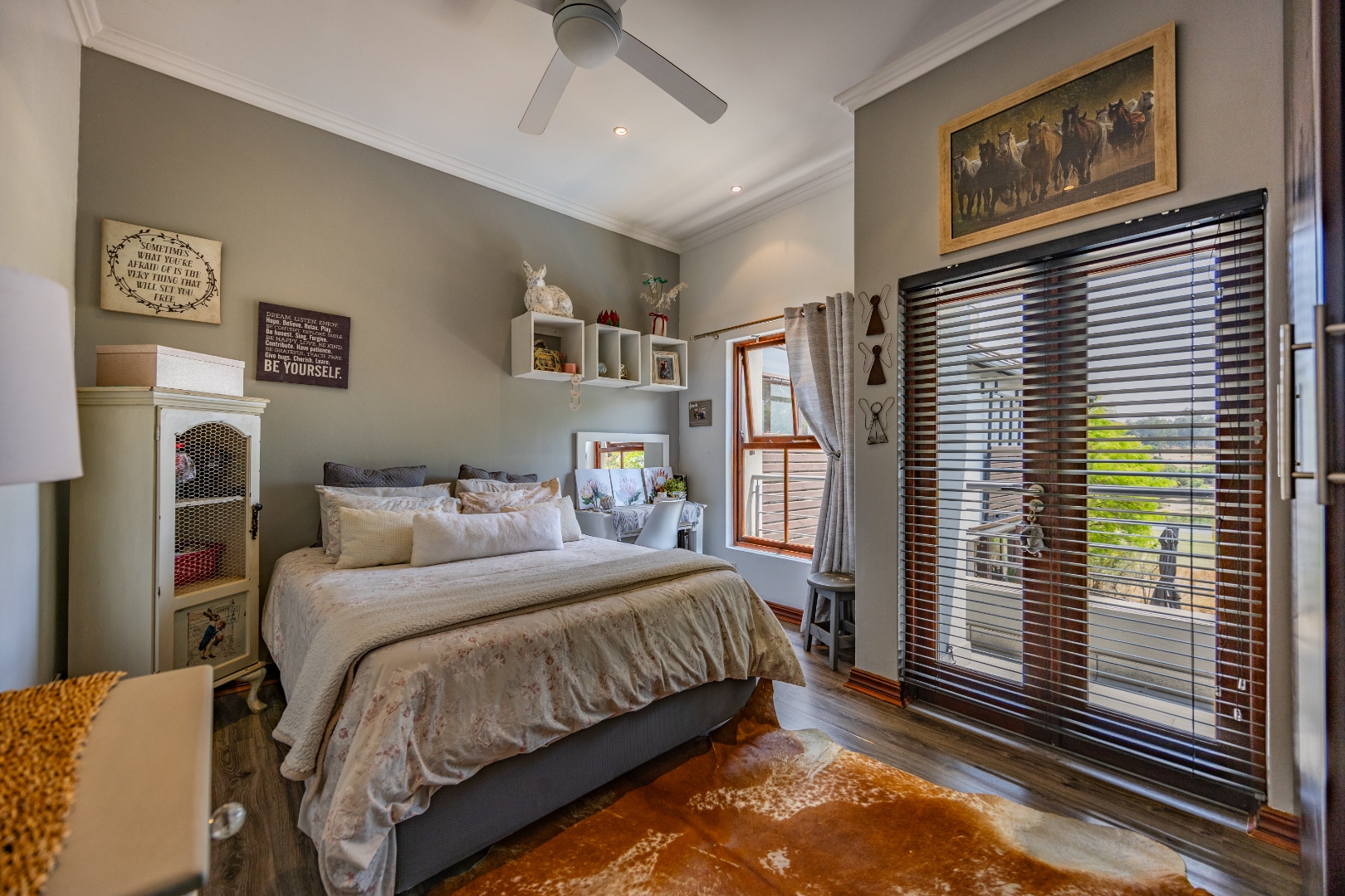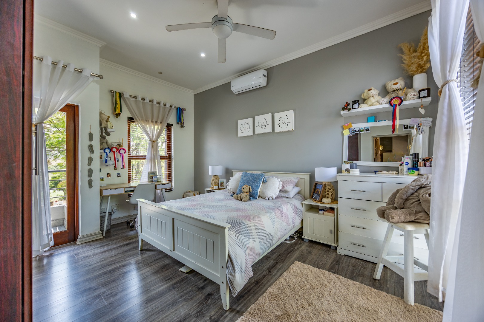 The upper level offers four additional bedrooms, each designed with comfort and privacy in mind. The main suite is a true retreat, boasting a fireplace, walk-in closet, and spa-inspired en-suite bathroom, while its private balcony captures breathtaking views over the Ernie Els Signature Golf Course and the Magaliesberg Mountains. Two more bedrooms also open onto the balcony, while the remaining room can serve as a study or children’s room. Multiple lounges throughout the home—one featuring surround sound and another with a ceiling fan and garden access—create versatile family spaces suited to both relaxation and entertainment.