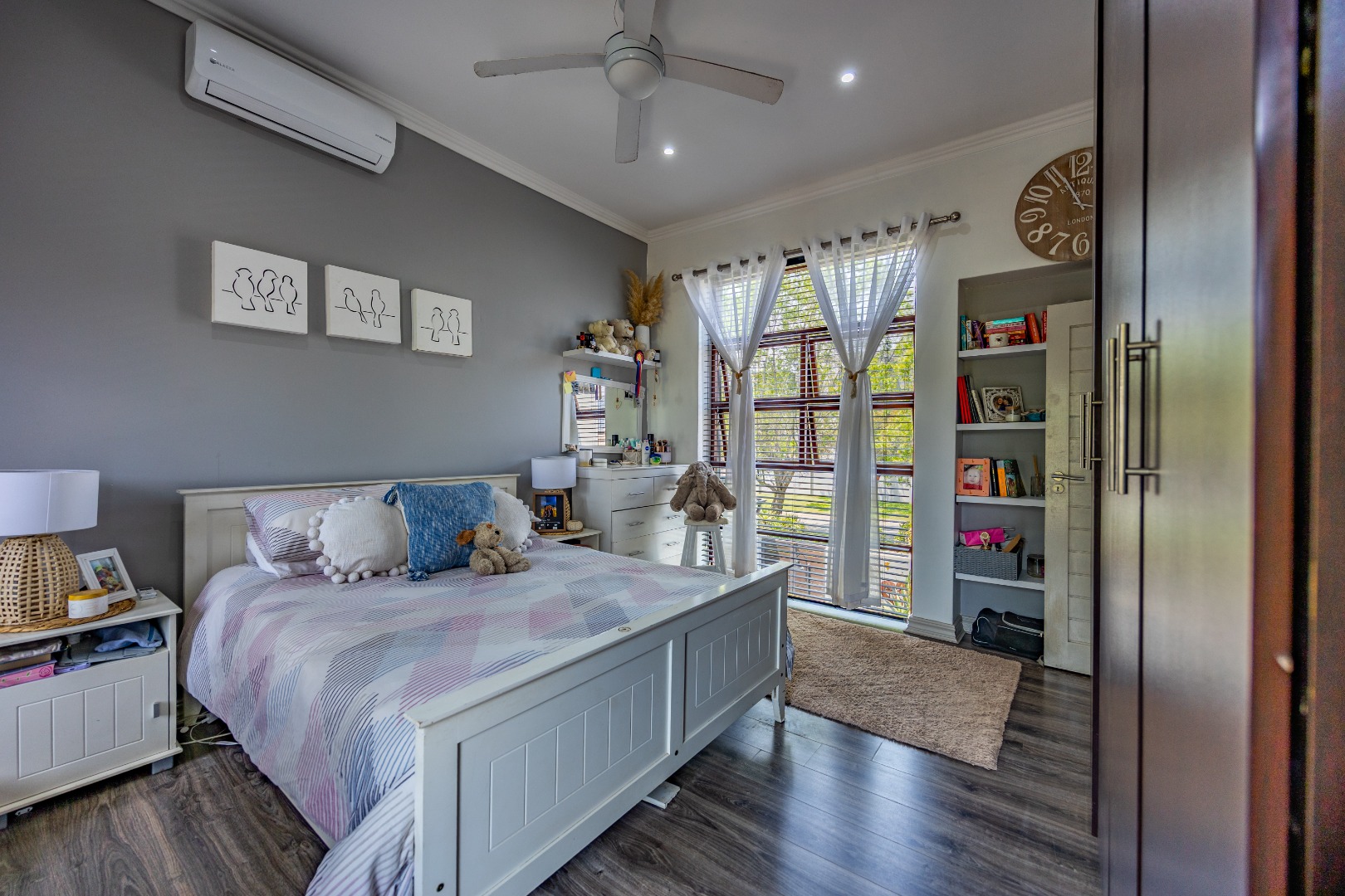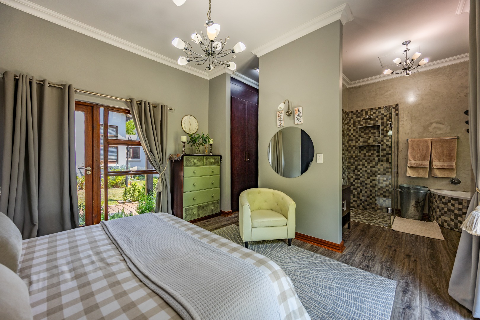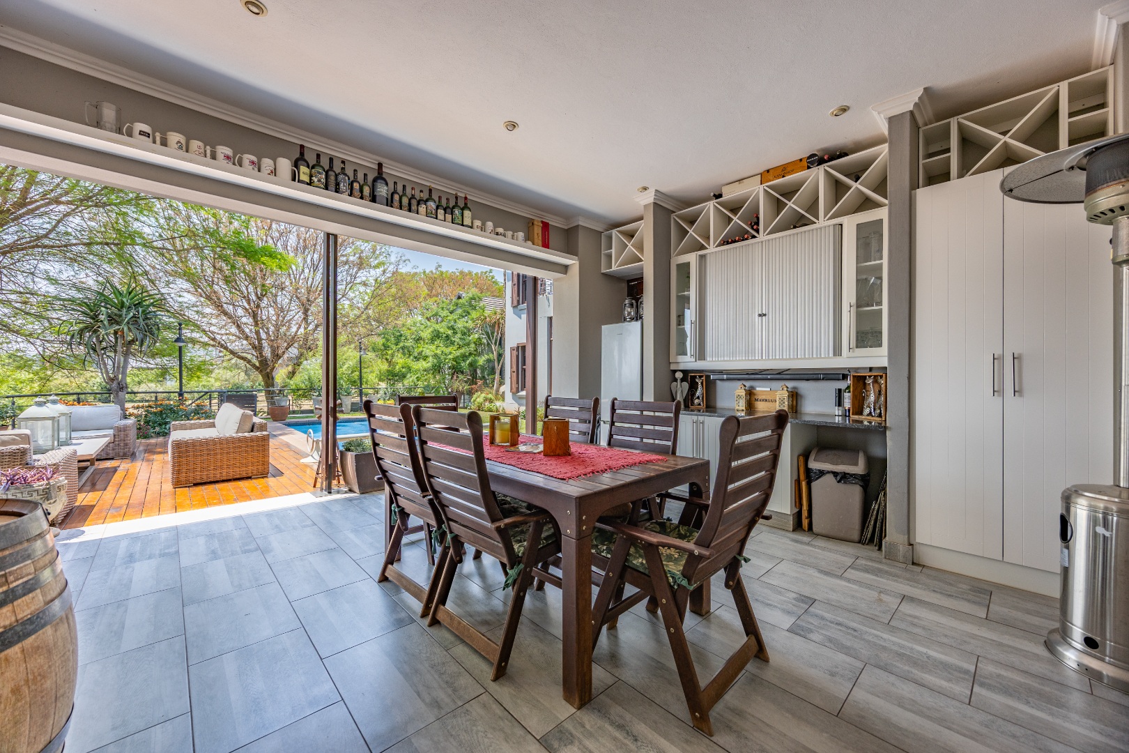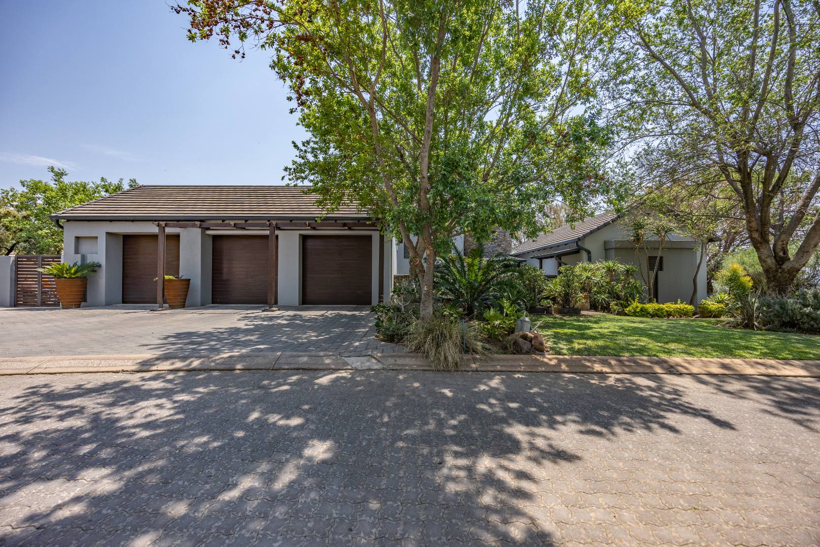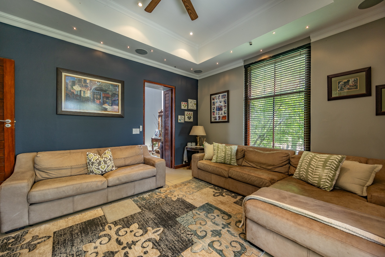 The upper level offers four additional bedrooms, each designed with comfort and privacy in mind. The main suite is a true retreat, boasting a fireplace, walk-in closet, and spa-inspired en-suite bathroom, while its private balcony captures breathtaking views over the Ernie Els Signature Golf Course and the Magaliesberg Mountains. Two more bedrooms also open onto the balcony, while the remaining room can serve as a study or children’s room. Multiple lounges throughout the home—one featuring surround sound and another with a ceiling fan and garden access—create versatile family spaces suited to both relaxation and entertainment.