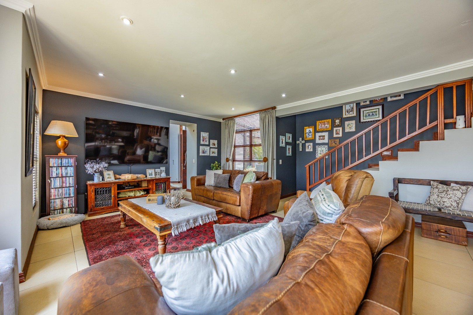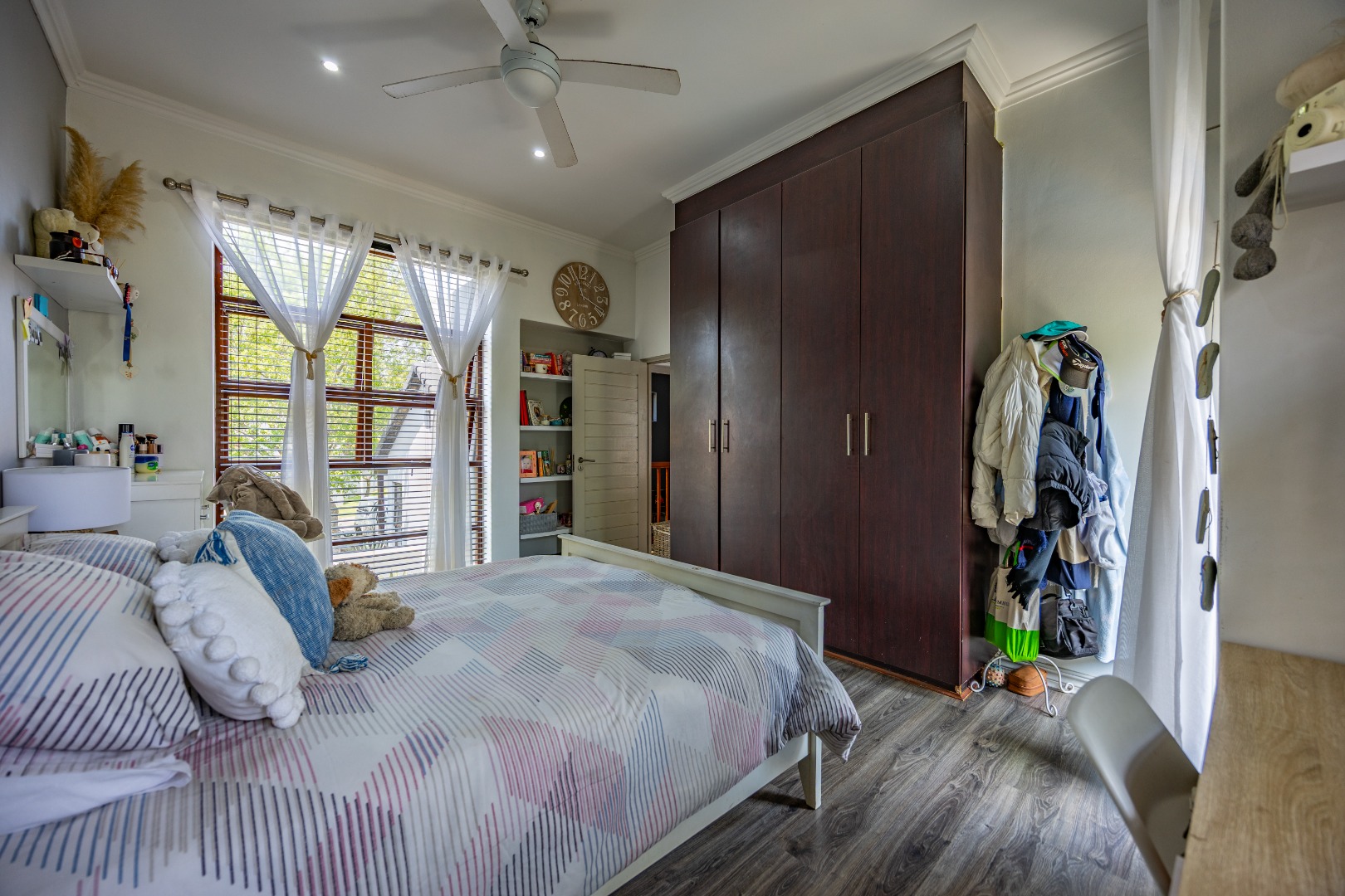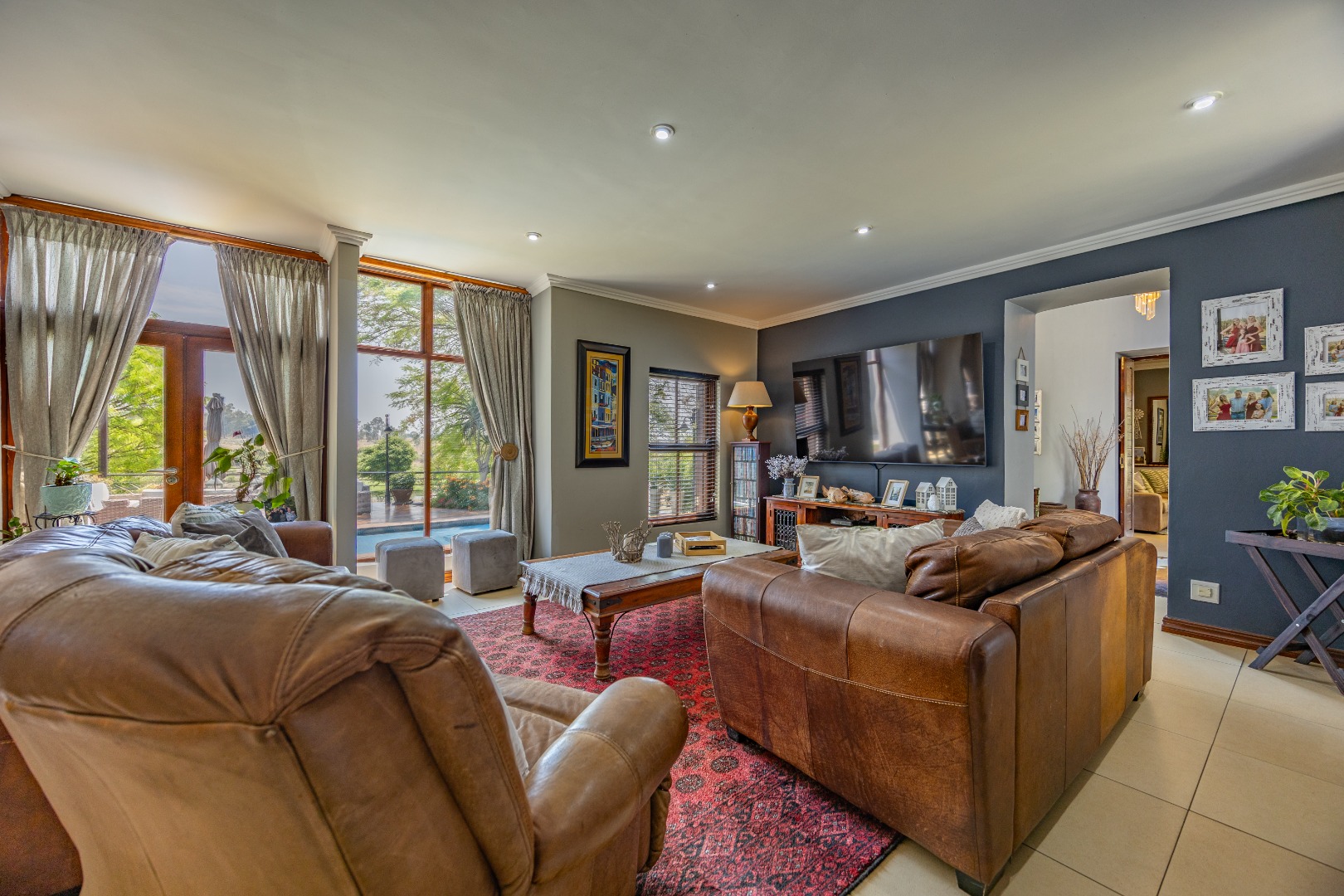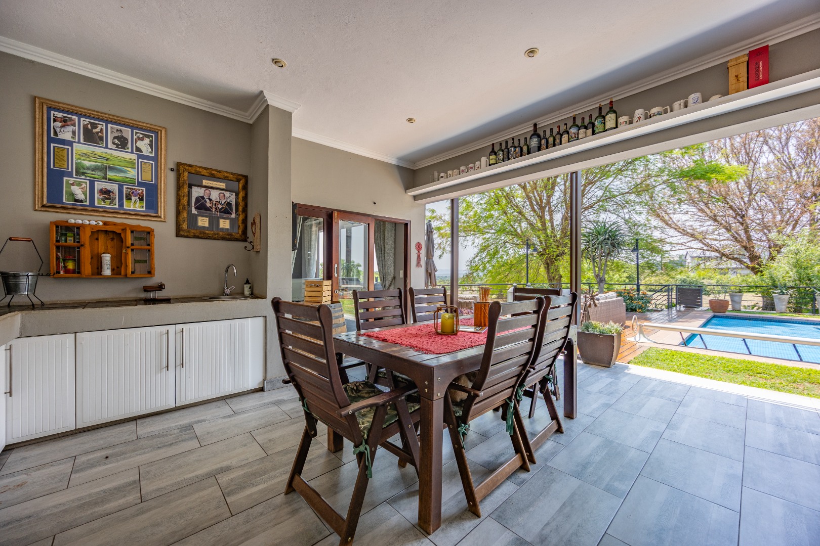 The upper level offers four additional bedrooms, each designed with comfort and privacy in mind. The main suite is a true retreat, boasting a fireplace, walk-in closet, and spa-inspired en-suite bathroom, while its private balcony captures breathtaking views over the Ernie Els Signature Golf Course and the Magaliesberg Mountains. Two more bedrooms also open onto the balcony, while the remaining room can serve as a study or children’s room. Multiple lounges throughout the home—one featuring surround sound and another with a ceiling fan and garden access—create versatile family spaces suited to both relaxation and entertainment.