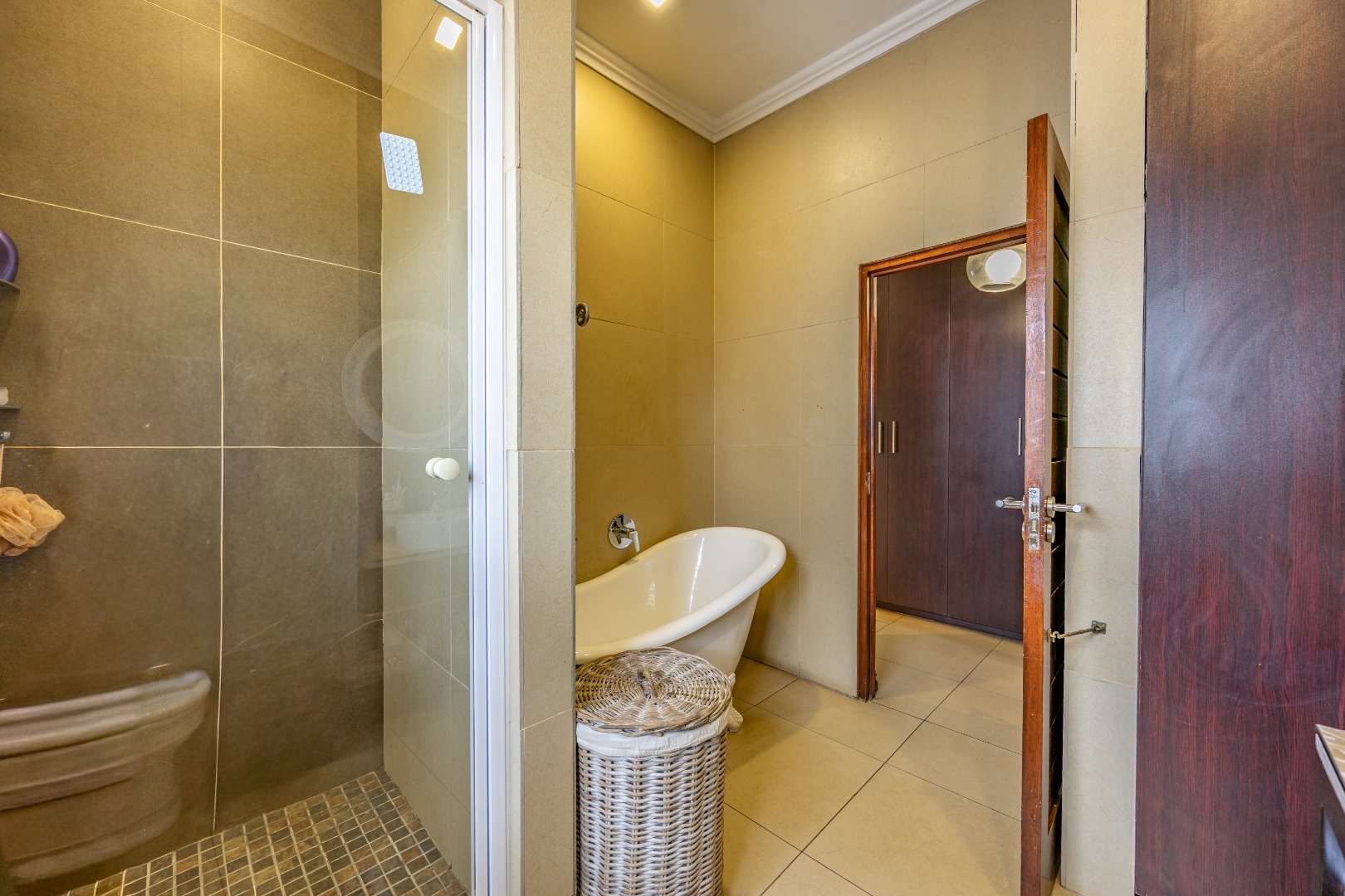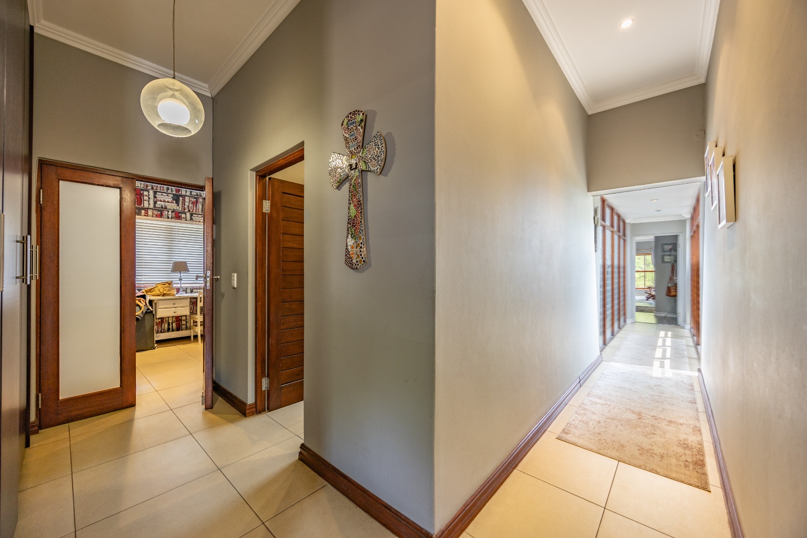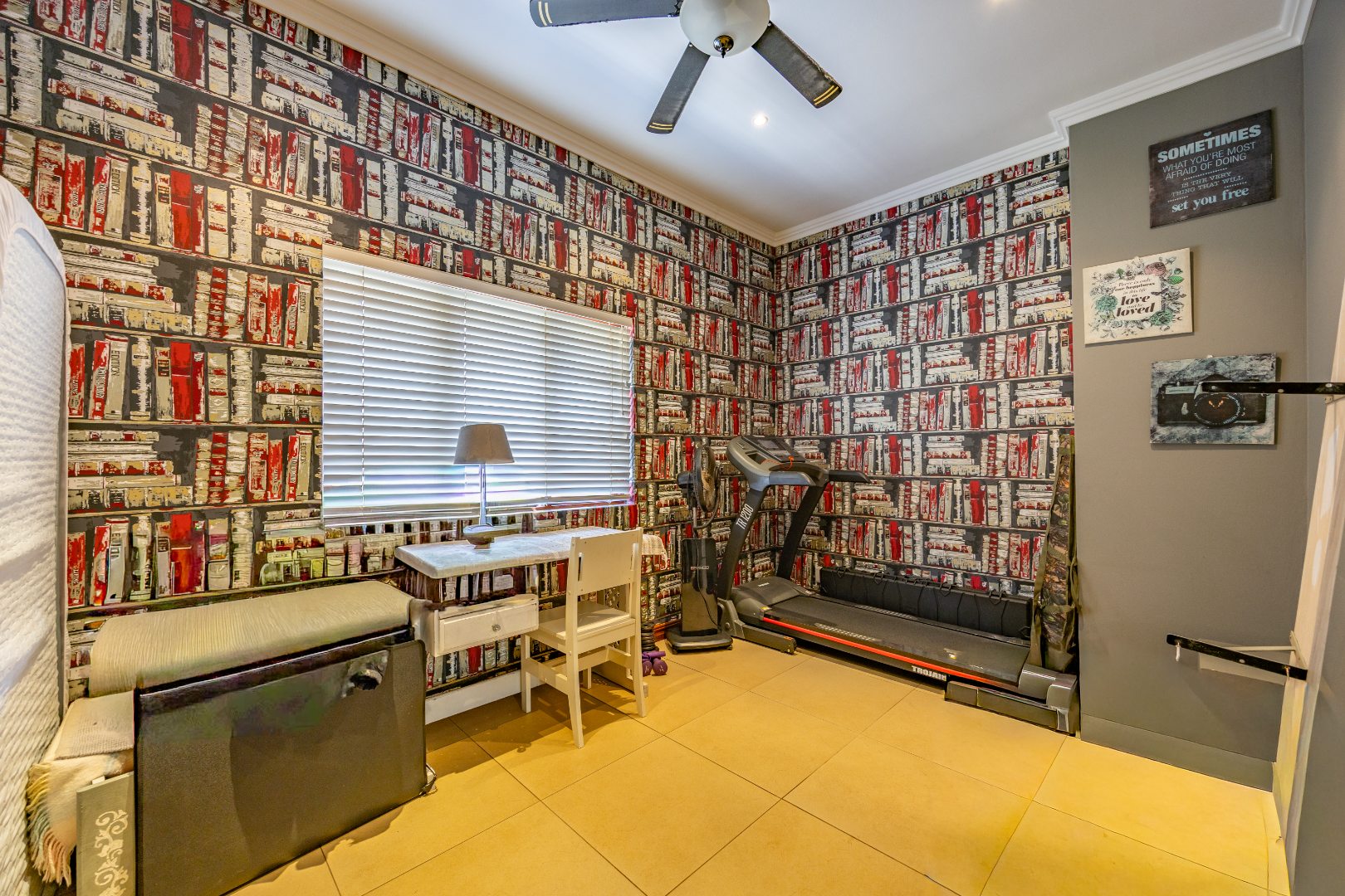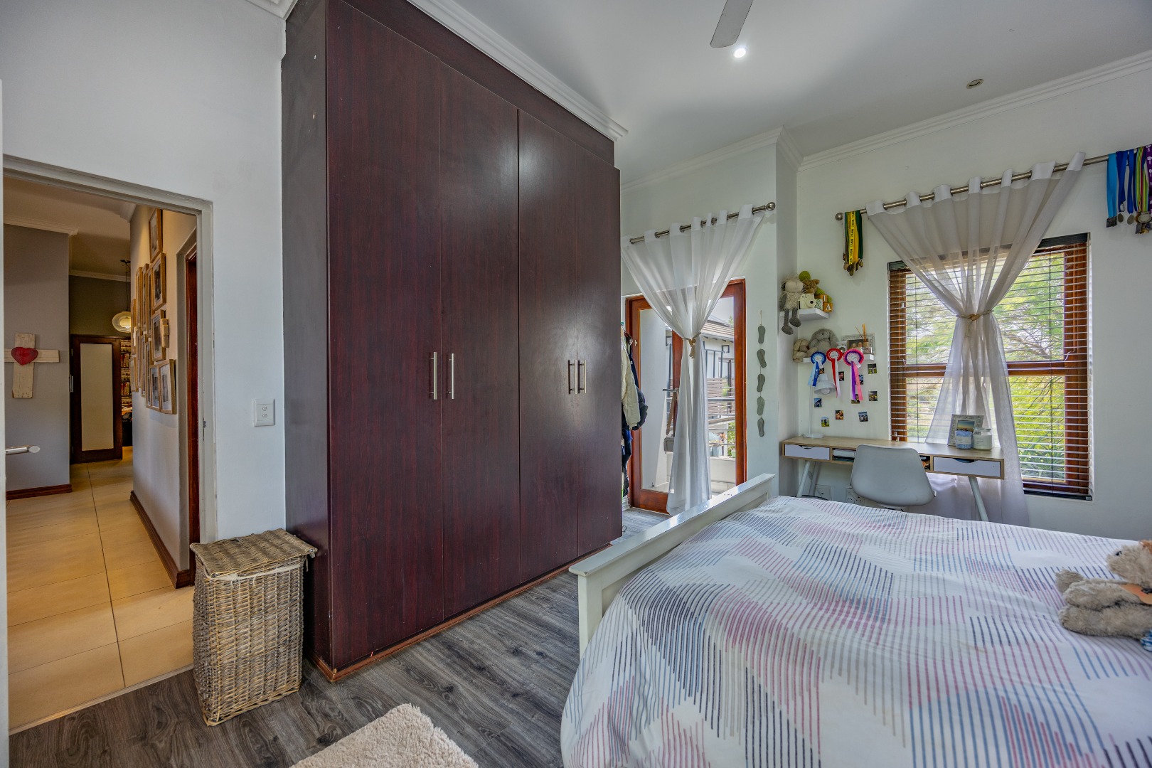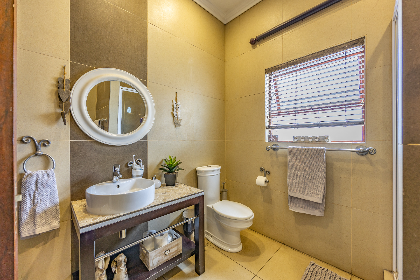 The upper level offers four additional bedrooms, each designed with comfort and privacy in mind. The main suite is a true retreat, boasting a fireplace, walk-in closet, and spa-inspired en-suite bathroom, while its private balcony captures breathtaking views over the Ernie Els Signature Golf Course and the Magaliesberg Mountains. Two more bedrooms also open onto the balcony, while the remaining room can serve as a study or children’s room. Multiple lounges throughout the home—one featuring surround sound and another with a ceiling fan and garden access—create versatile family spaces suited to both relaxation and entertainment.