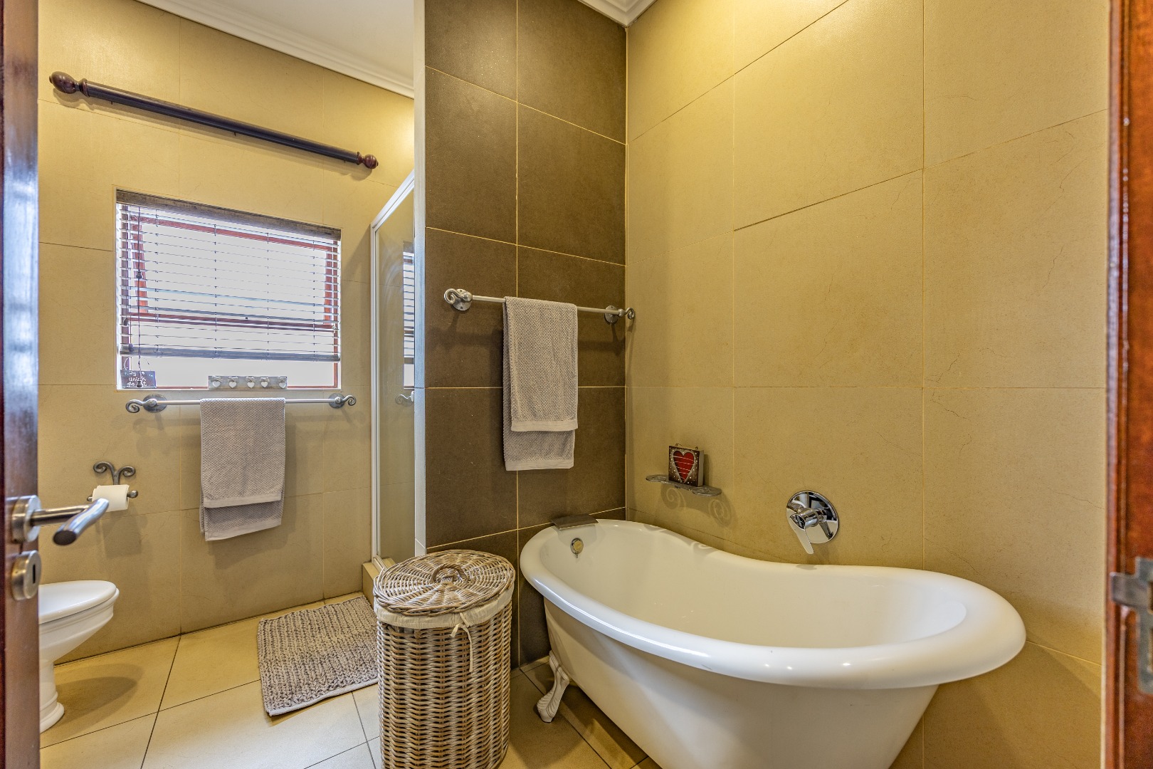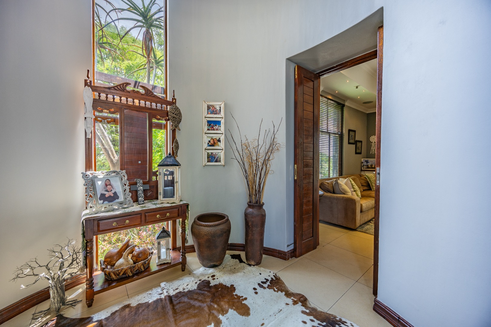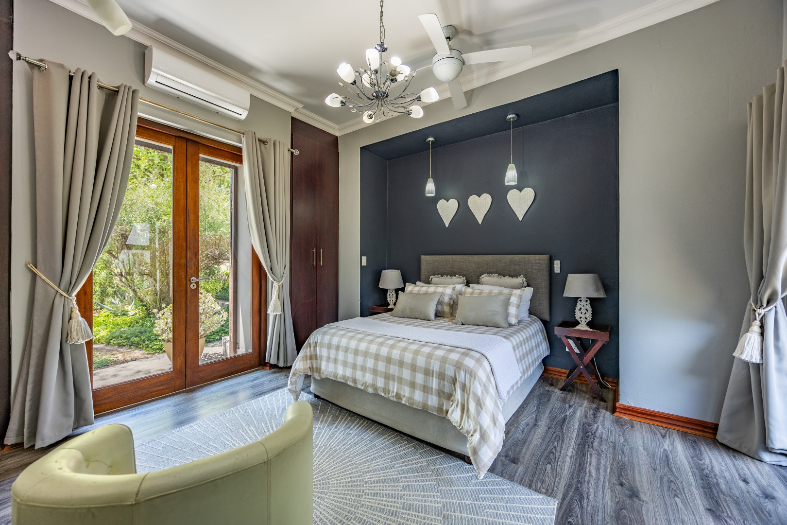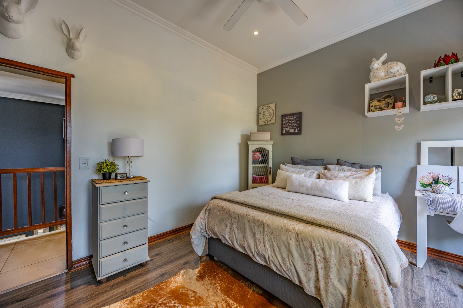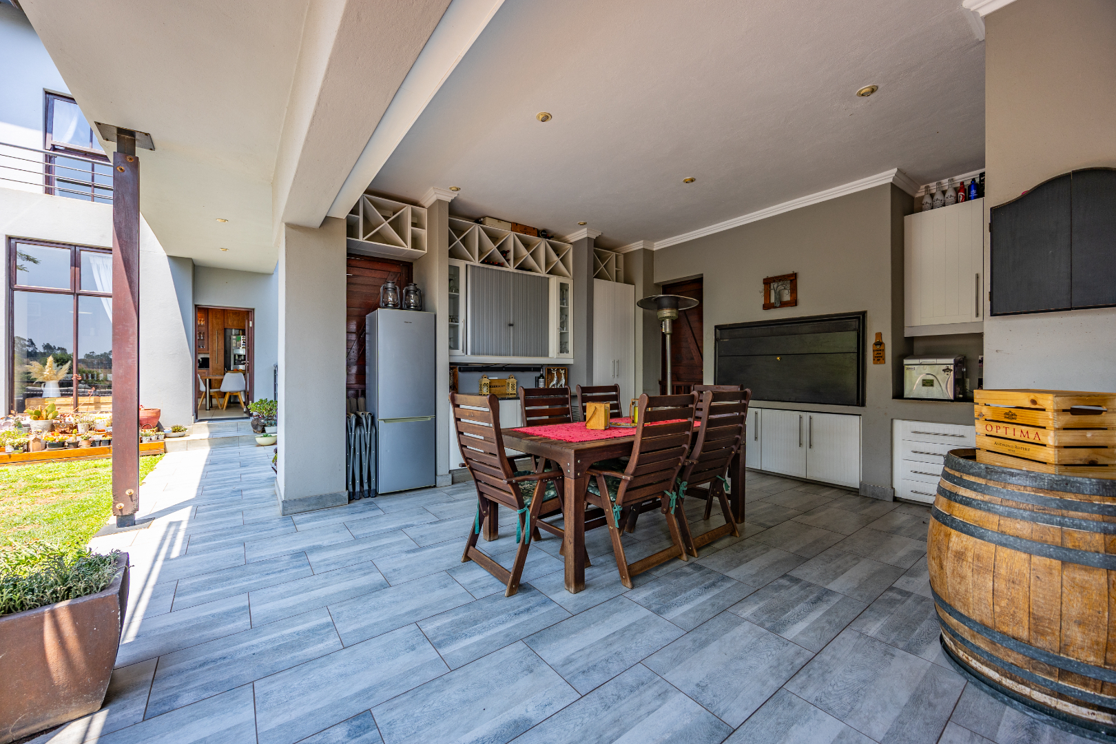 The upper level offers four additional bedrooms, each designed with comfort and privacy in mind. The main suite is a true retreat, boasting a fireplace, walk-in closet, and spa-inspired en-suite bathroom, while its private balcony captures breathtaking views over the Ernie Els Signature Golf Course and the Magaliesberg Mountains. Two more bedrooms also open onto the balcony, while the remaining room can serve as a study or children’s room. Multiple lounges throughout the home—one featuring surround sound and another with a ceiling fan and garden access—create versatile family spaces suited to both relaxation and entertainment.