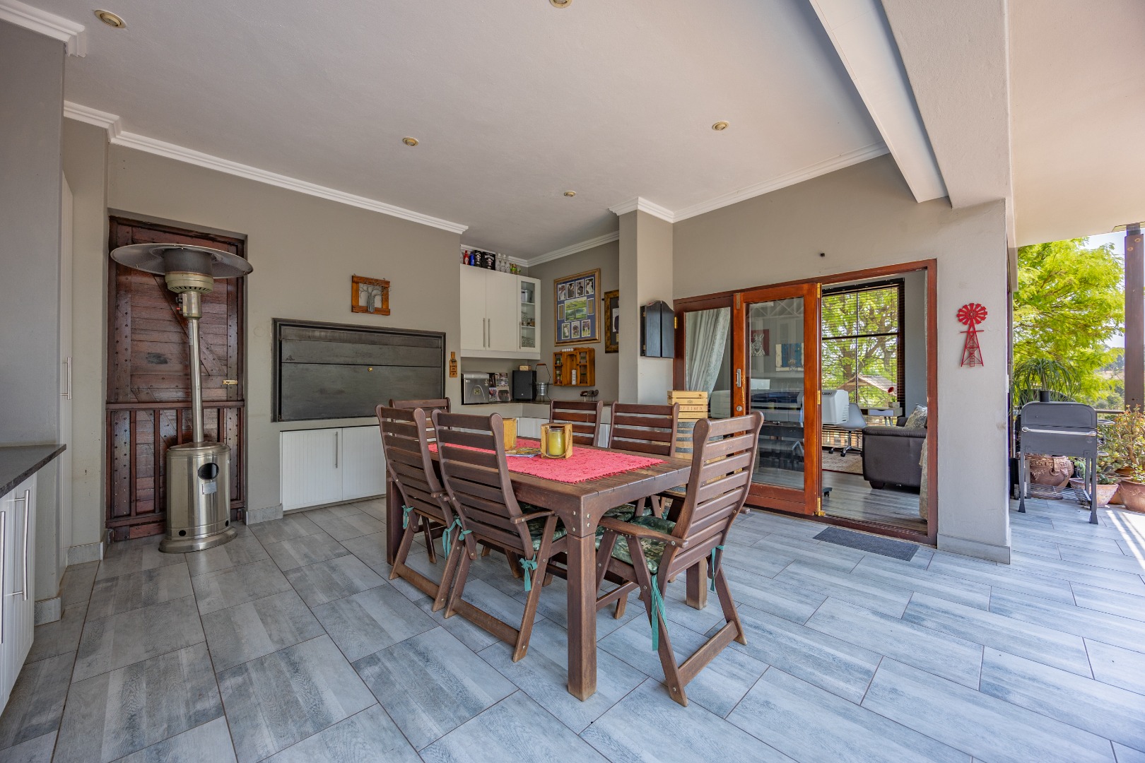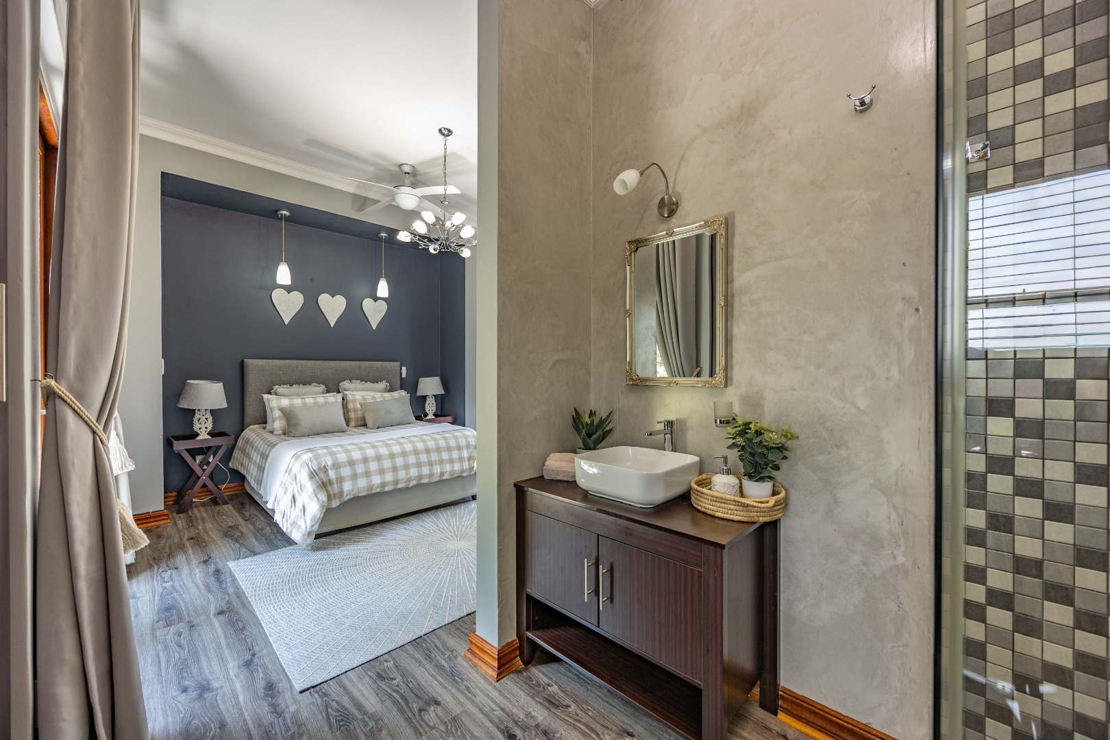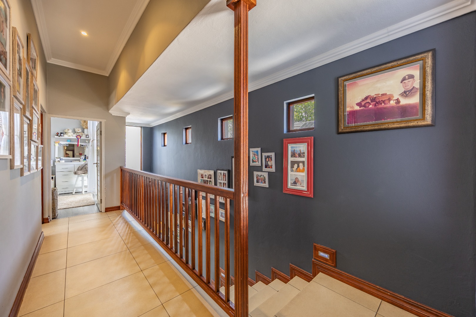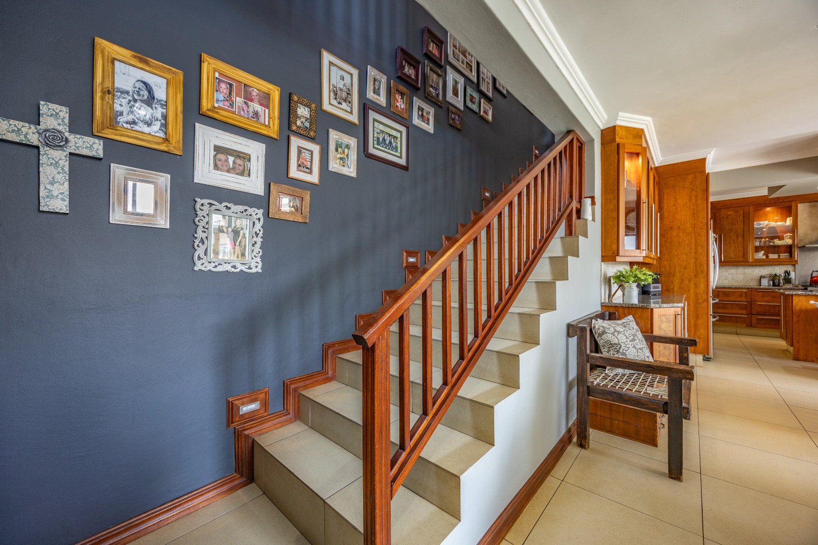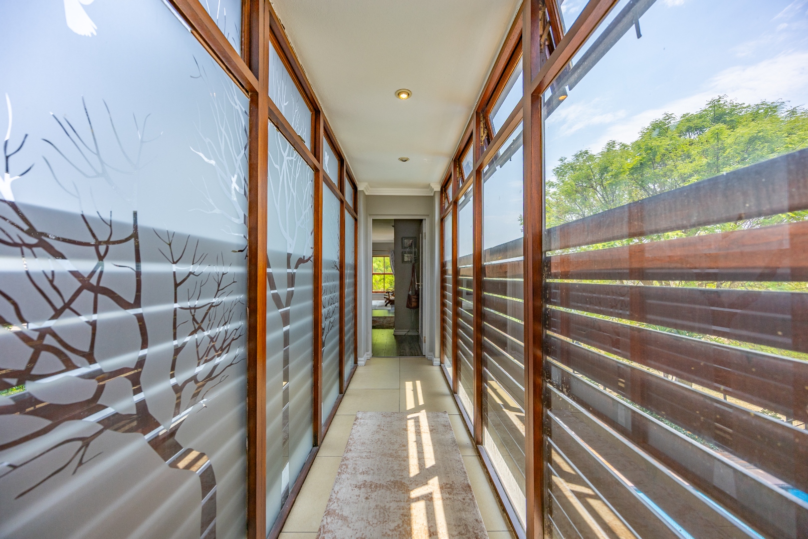 The upper level offers four additional bedrooms, each designed with comfort and privacy in mind. The main suite is a true retreat, boasting a fireplace, walk-in closet, and spa-inspired en-suite bathroom, while its private balcony captures breathtaking views over the Ernie Els Signature Golf Course and the Magaliesberg Mountains. Two more bedrooms also open onto the balcony, while the remaining room can serve as a study or children’s room. Multiple lounges throughout the home—one featuring surround sound and another with a ceiling fan and garden access—create versatile family spaces suited to both relaxation and entertainment.