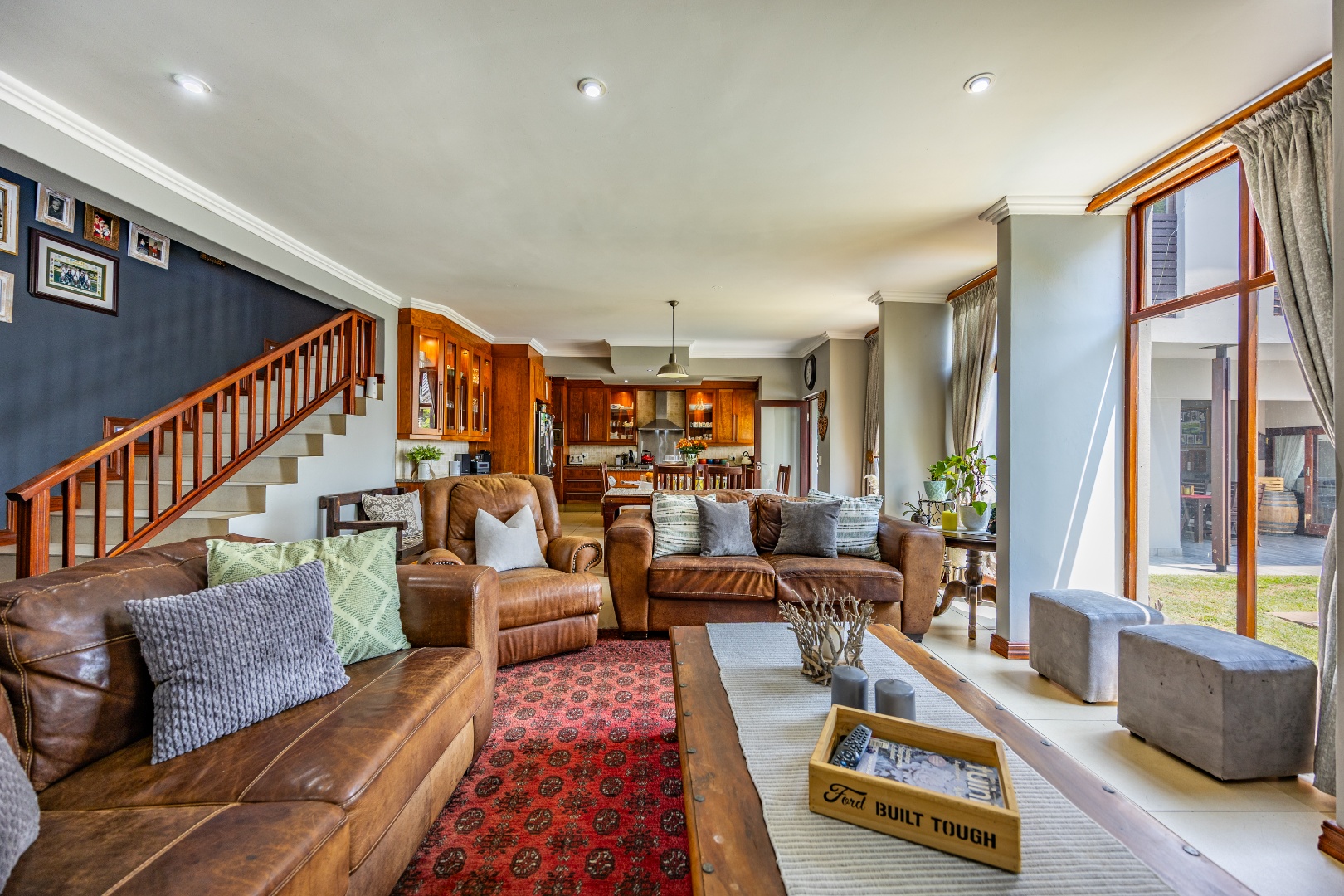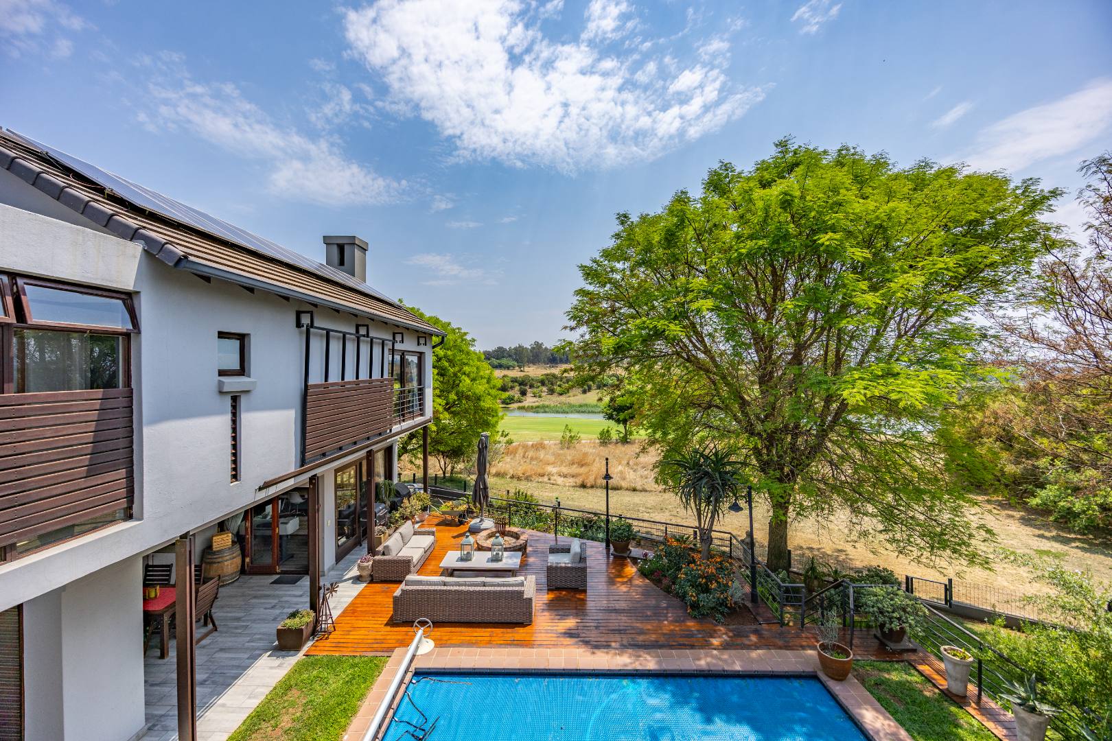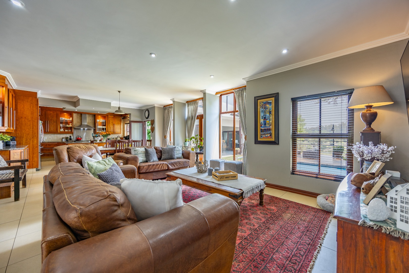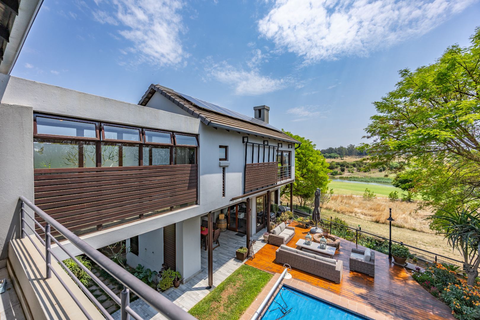 Nestled in the prestigious Copperleaf Golf and Country Estate, this luxurious five-bedroom residence epitomizes refined family living, seamlessly blending sophistication, comfort, and sustainability. From the moment you step through the double-volume entrance hall, the home welcomes you with open-plan living spaces that flow effortlessly between the lounge, dining area, and gourmet kitchen. The kitchen, designed with both elegance and functionality in mind, features a large centre island, premium finishes, built-in appliances, and a generous scullery with space for multiple appliances. Large sliding doors open out to the entertainment patio, creating a perfect harmony between indoor and outdoor living. A guest suite with its own private lounge and en-suite bathroom completes the downstairs layout—ideal for visitors or extended family.