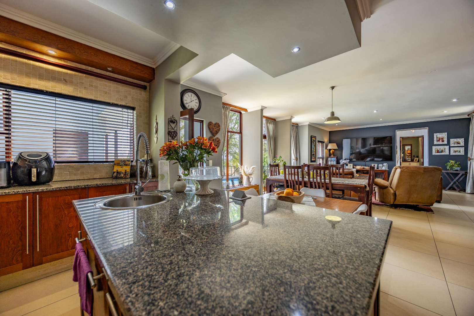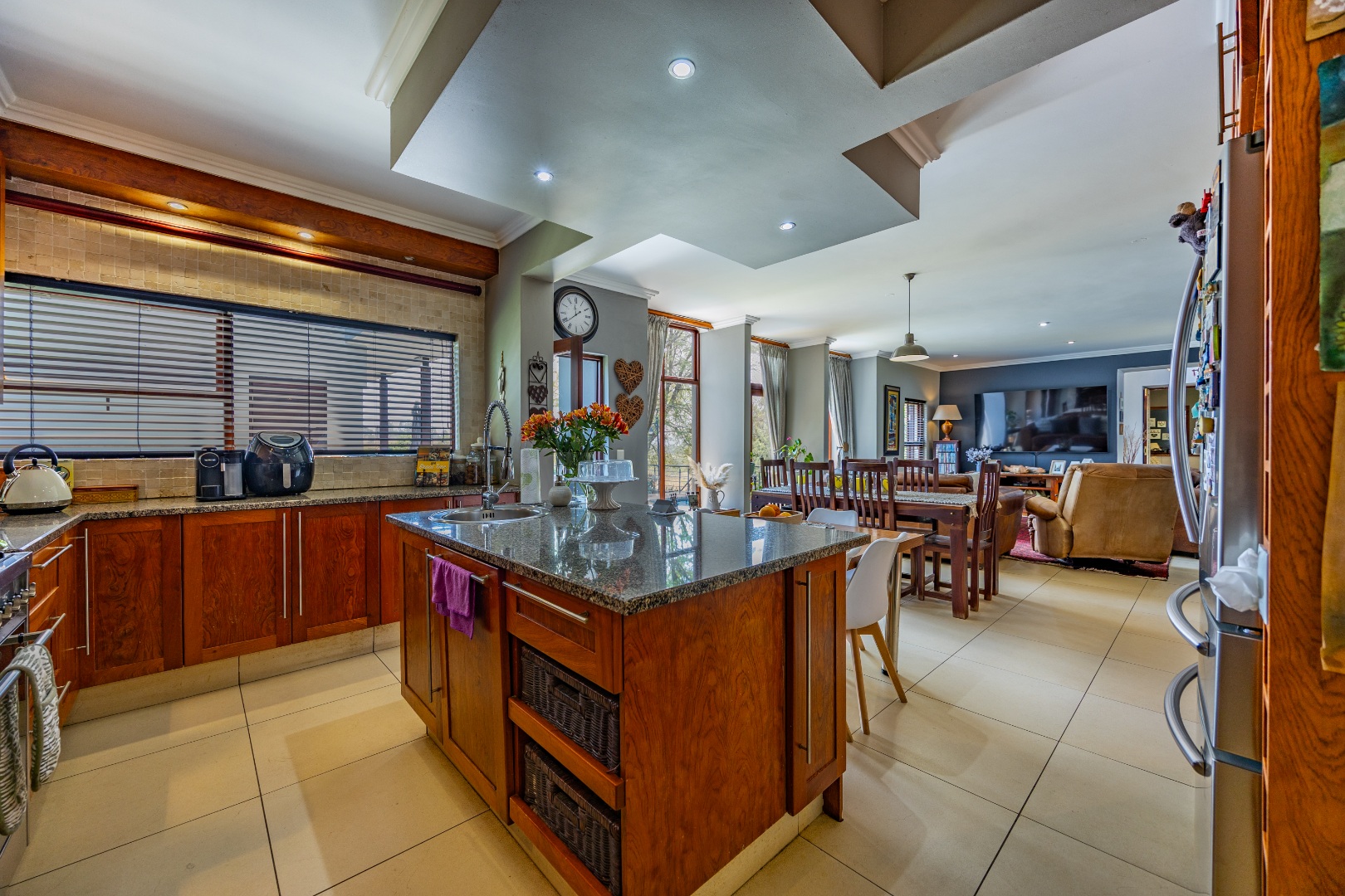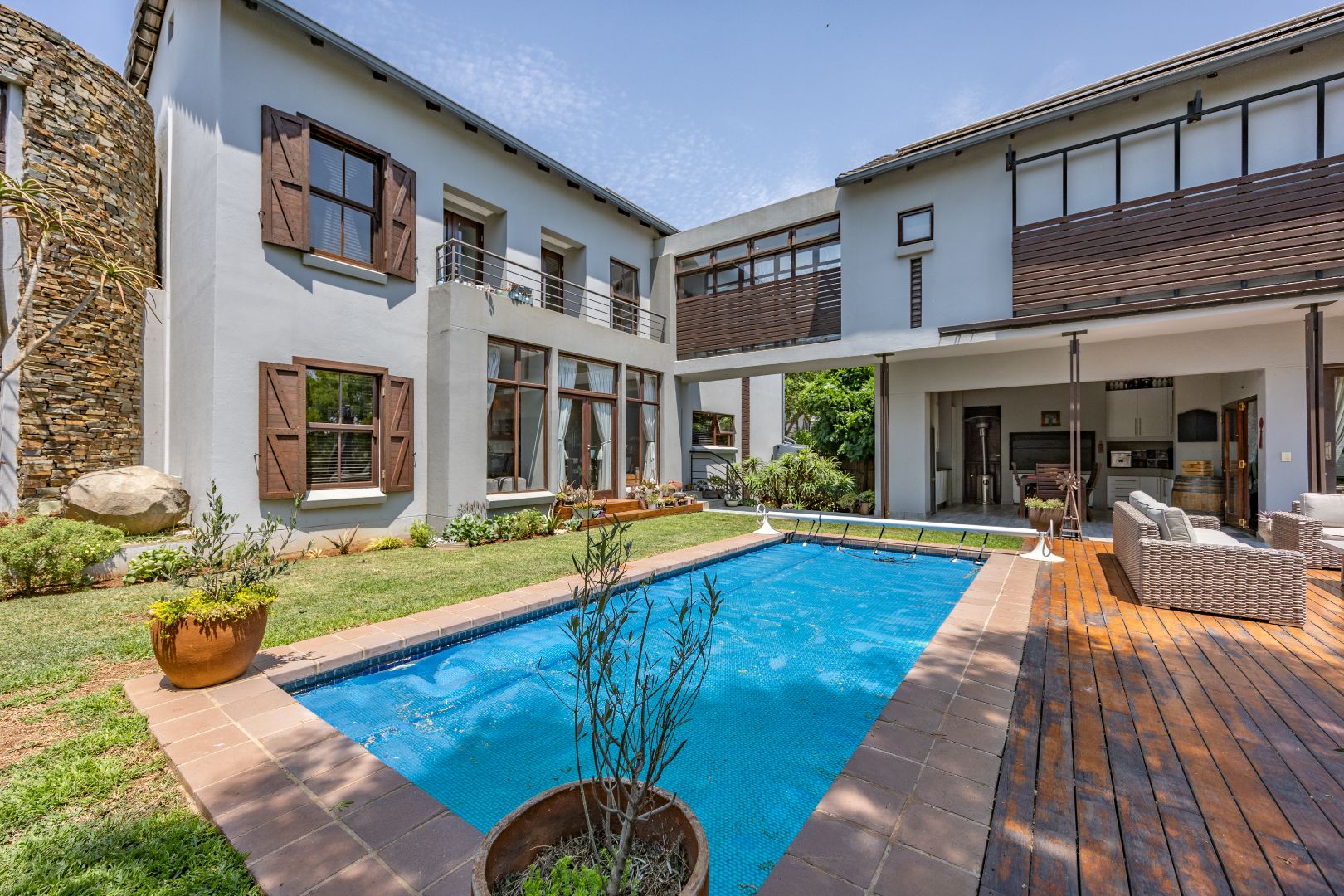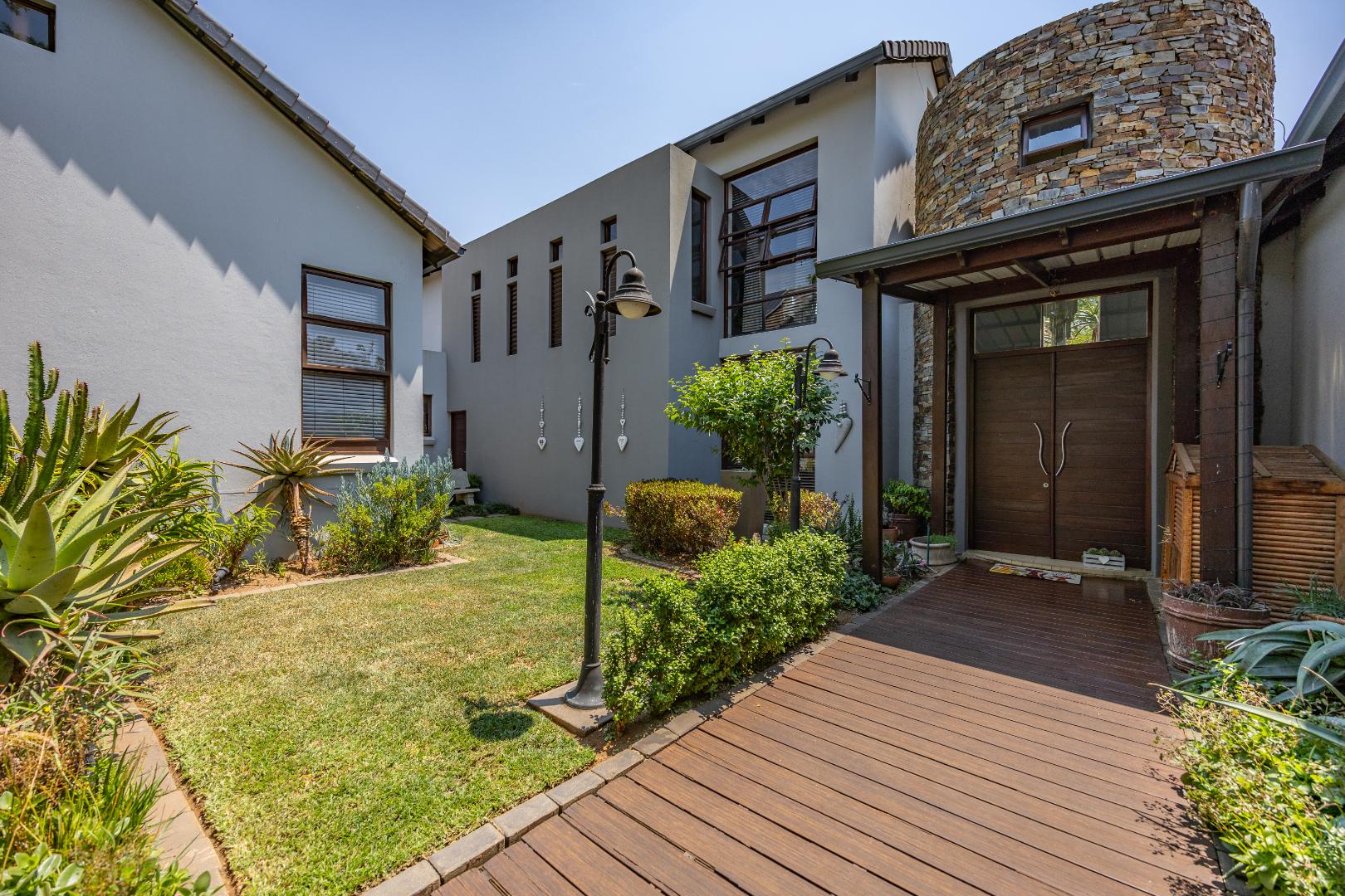 Nestled in the prestigious Copperleaf Golf and Country Estate, this luxurious five-bedroom residence epitomizes refined family living, seamlessly blending sophistication, comfort, and sustainability. From the moment you step through the double-volume entrance hall, the home welcomes you with open-plan living spaces that flow effortlessly between the lounge, dining area, and gourmet kitchen. The kitchen, designed with both elegance and functionality in mind, features a large centre island, premium finishes, built-in appliances, and a generous scullery with space for multiple appliances. Large sliding doors open out to the entertainment patio, creating a perfect harmony between indoor and outdoor living. A guest suite with its own private lounge and en-suite bathroom completes the downstairs layout—ideal for visitors or extended family.
