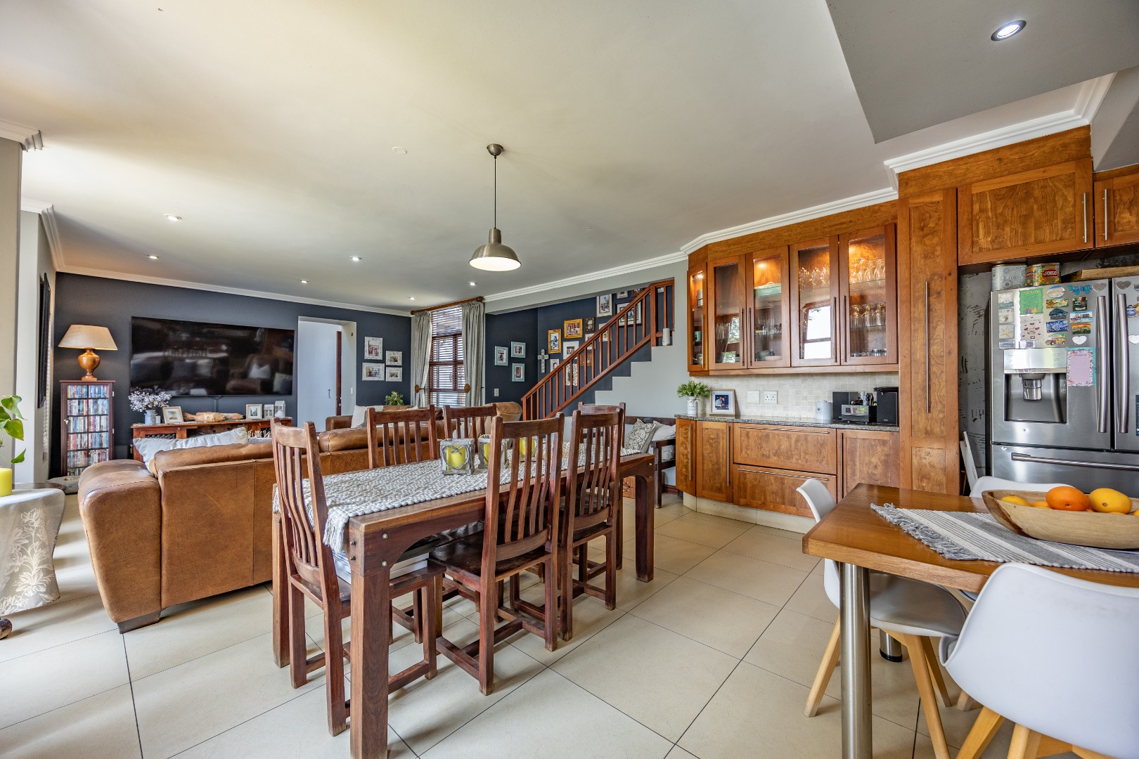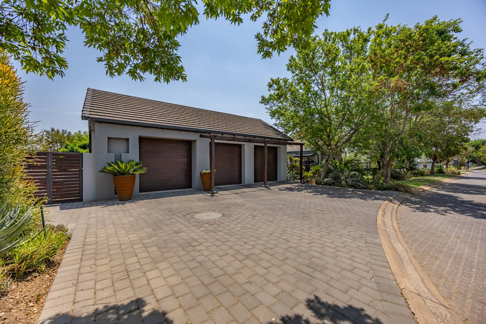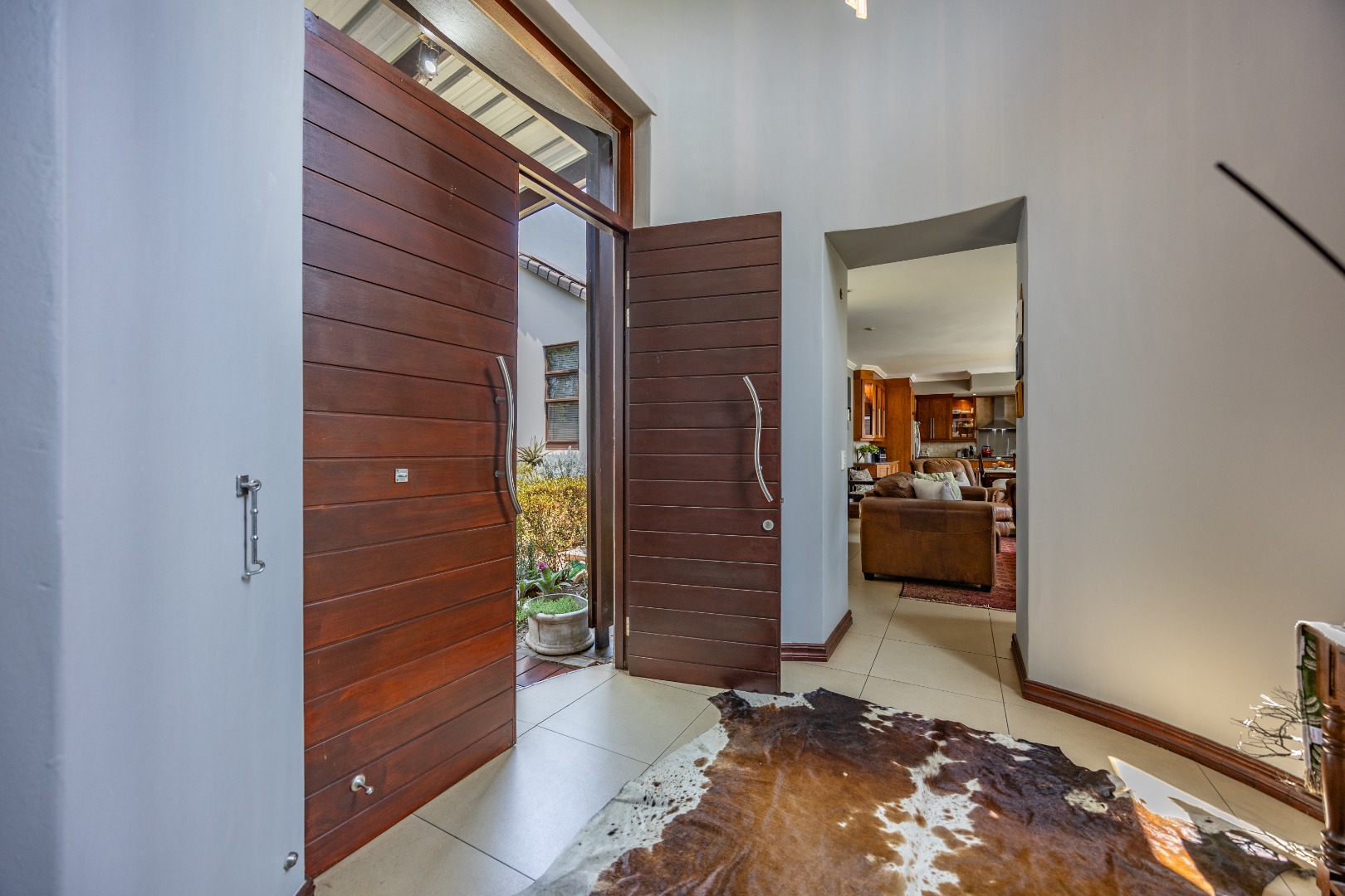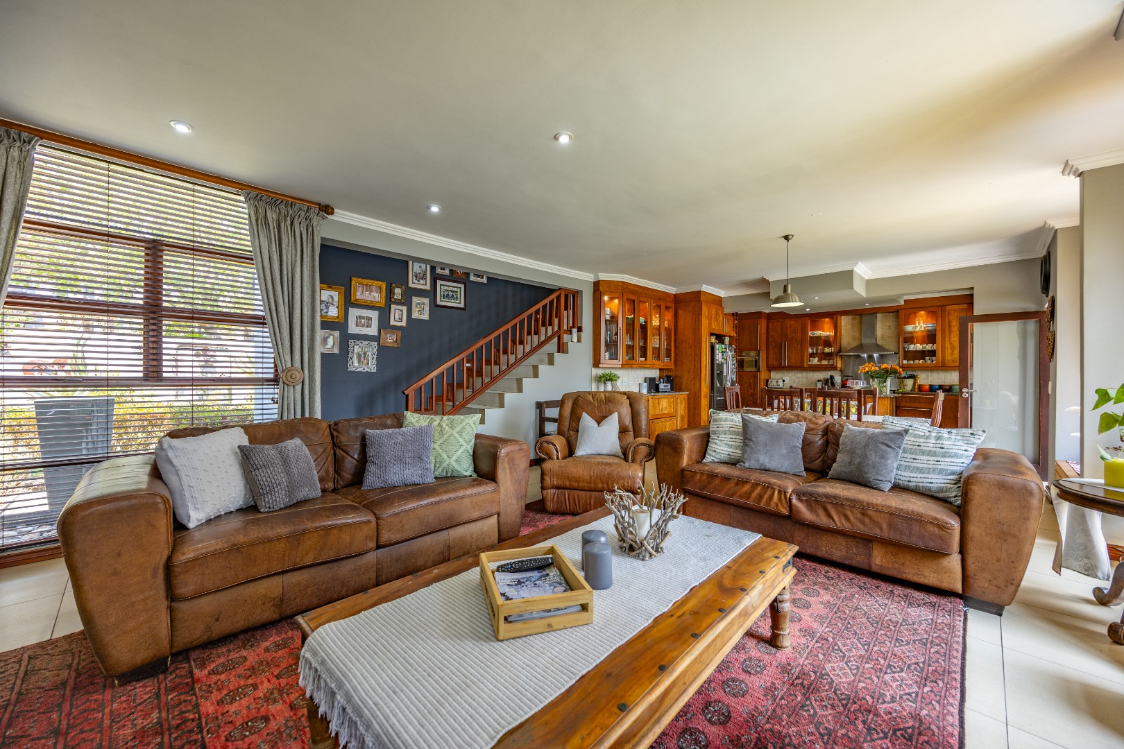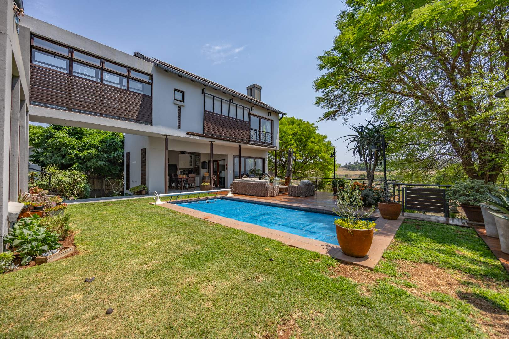Nestled in the prestigious Copperleaf Golf and Country Estate, this luxurious five-bedroom residence epitomizes refined family living, seamlessly blending sophistication, comfort, and sustainability. From the moment you step through the double-volume entrance hall, the home welcomes you with open-plan living spaces that flow effortlessly between the lounge, dining area, and gourmet kitchen. The kitchen, designed with both elegance and functionality in mind, features a large centre island, premium finishes, built-in appliances, and a generous scullery with space for multiple appliances. Large sliding doors open out to the entertainment patio, creating a perfect harmony between indoor and outdoor living. A guest suite with its own private lounge and en-suite bathroom completes the downstairs layout—ideal for visitors or extended family.