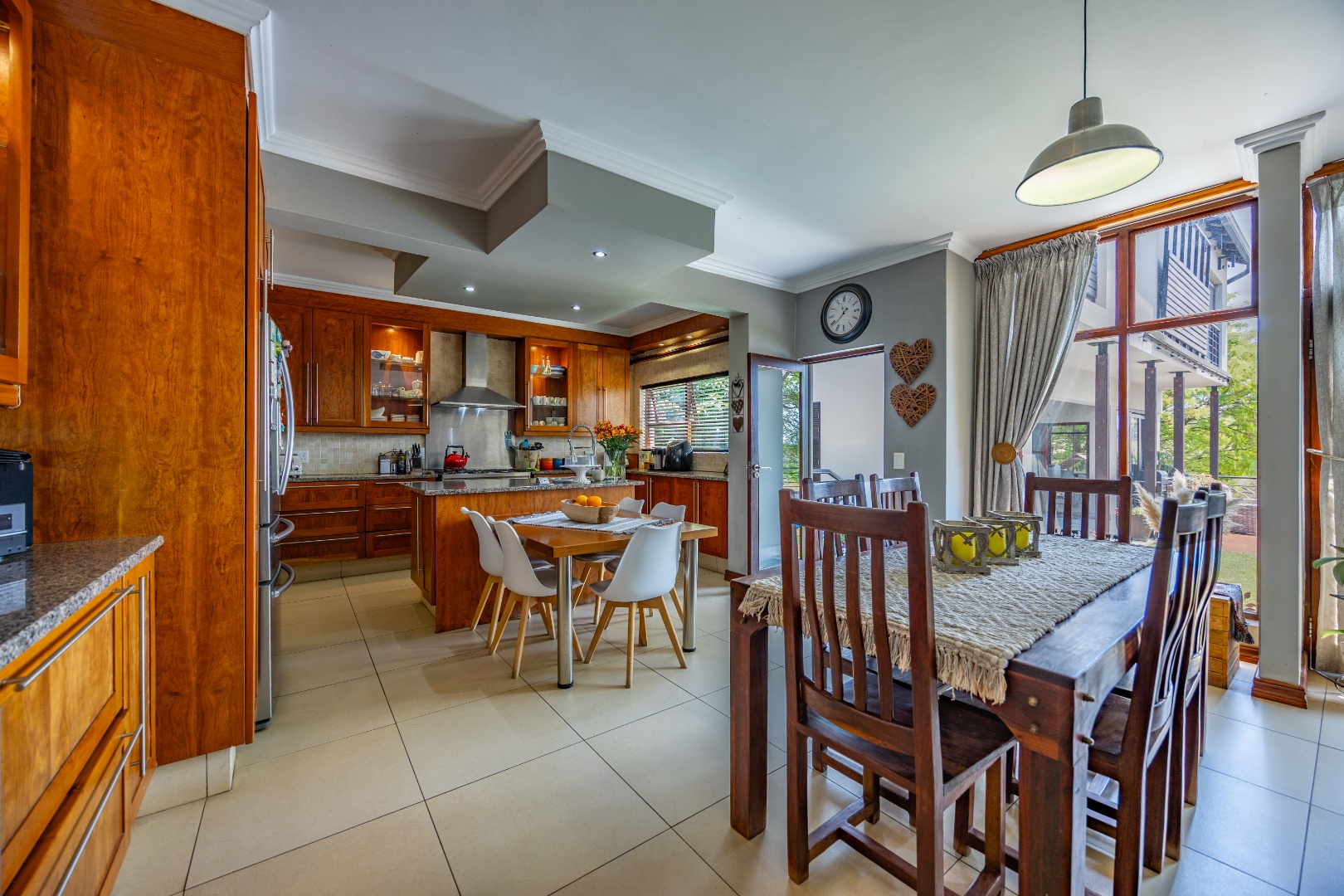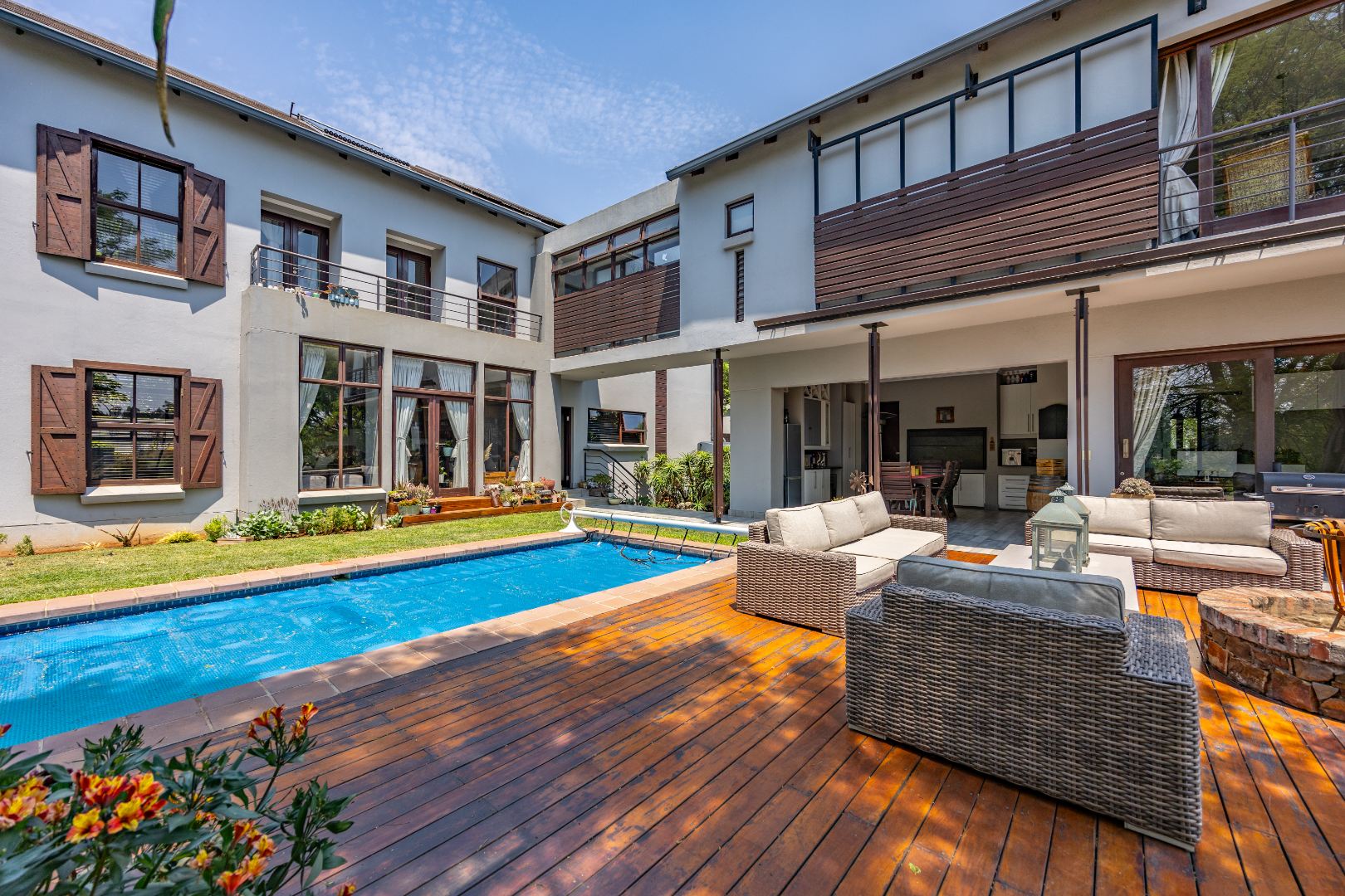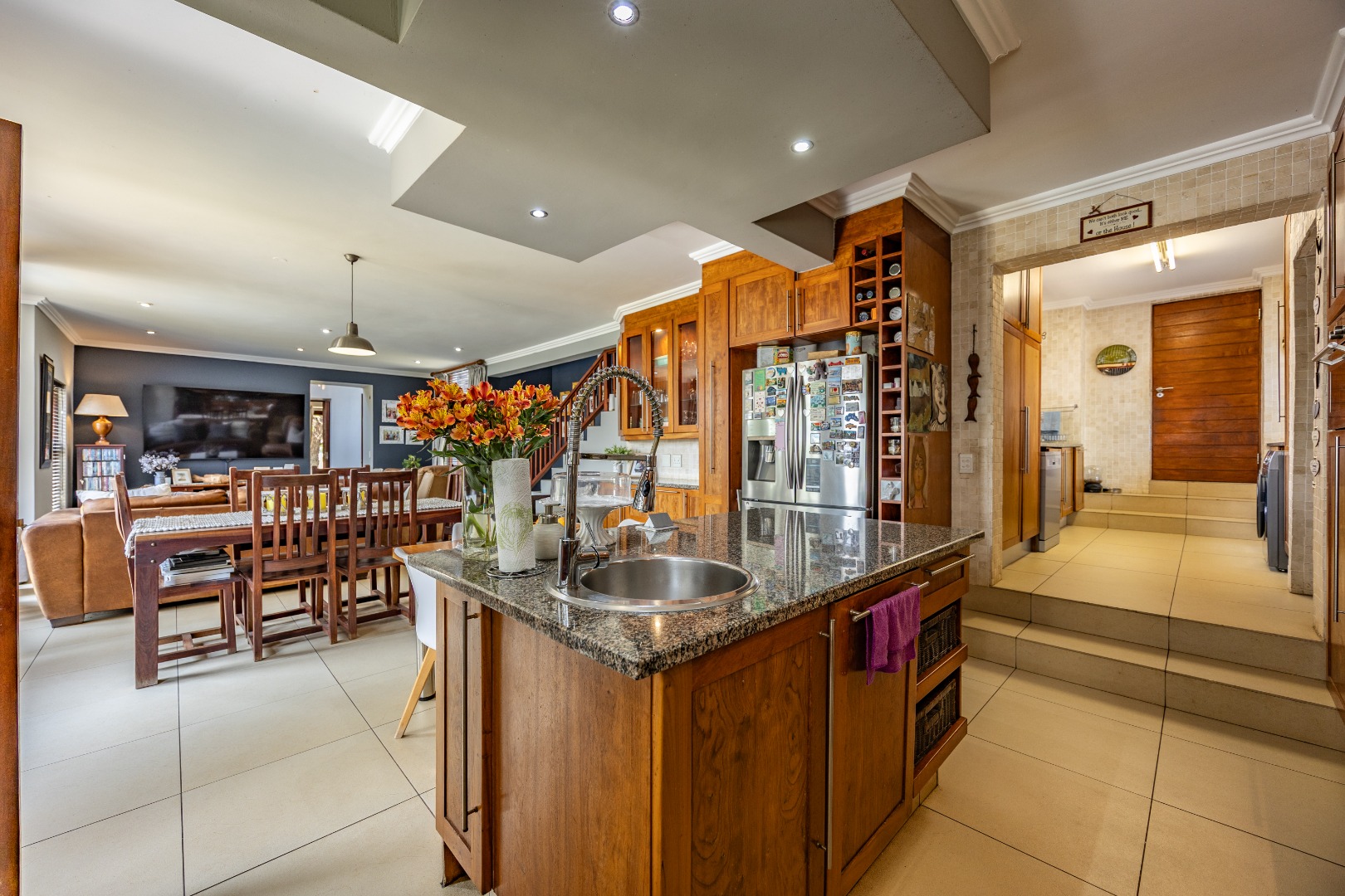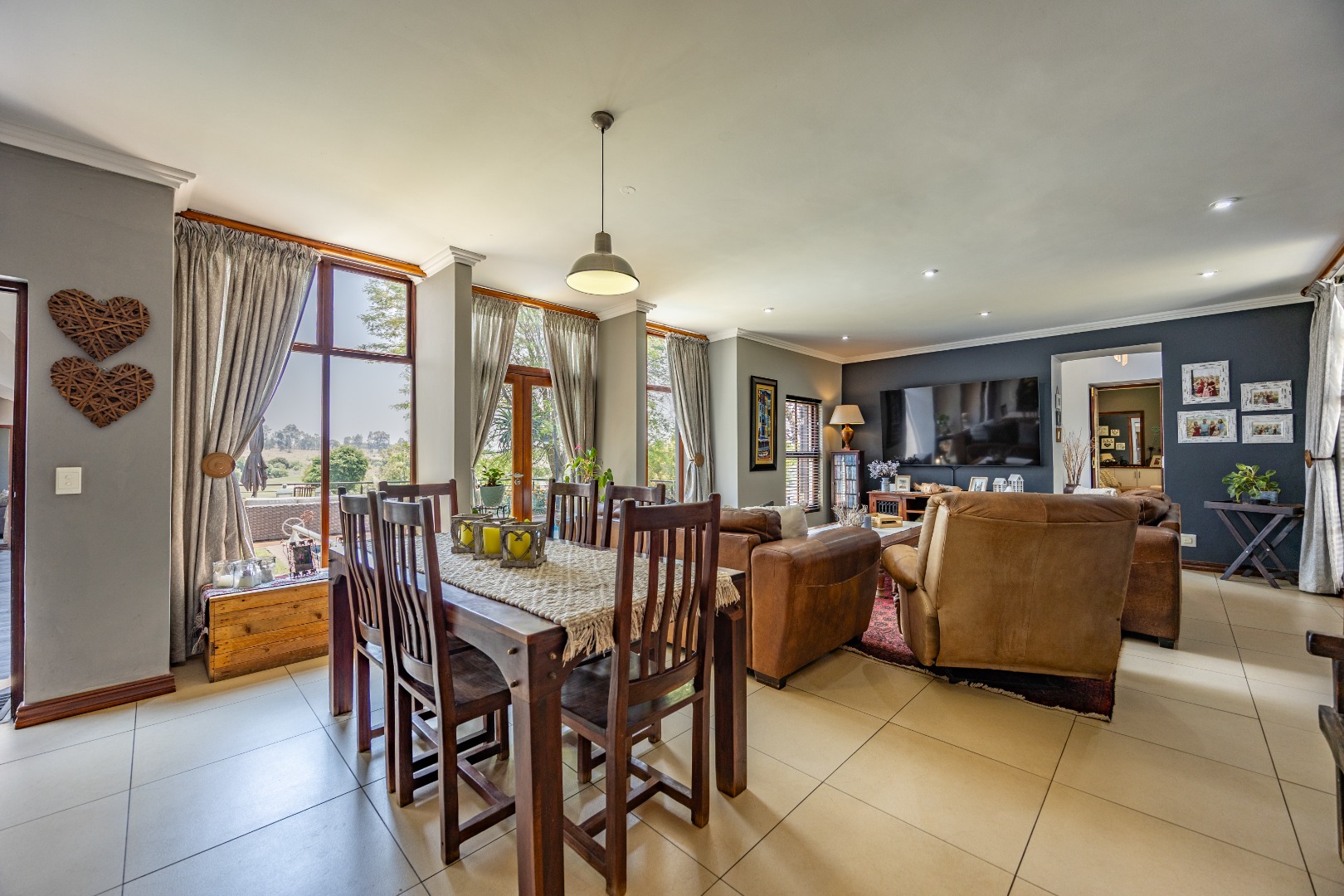 Nestled in the prestigious Copperleaf Golf and Country Estate, this luxurious five-bedroom residence epitomizes refined family living, seamlessly blending sophistication, comfort, and sustainability. From the moment you step through the double-volume entrance hall, the home welcomes you with open-plan living spaces that flow effortlessly between the lounge, dining area, and gourmet kitchen. The kitchen, designed with both elegance and functionality in mind, features a large centre island, premium finishes, built-in appliances, and a generous scullery with space for multiple appliances. Large sliding doors open out to the entertainment patio, creating a perfect harmony between indoor and outdoor living. A guest suite with its own private lounge and en-suite bathroom completes the downstairs layout—ideal for visitors or extended family.