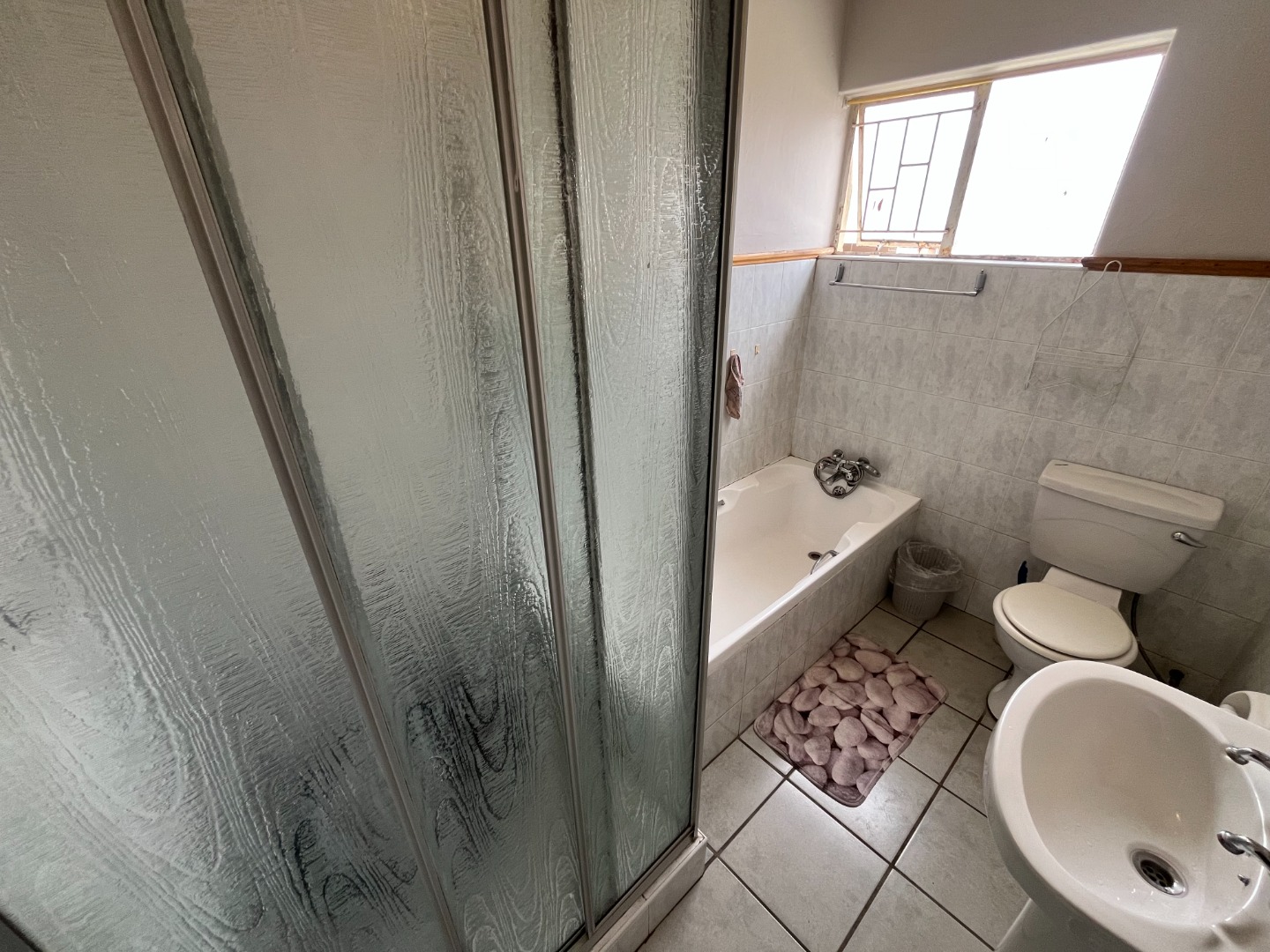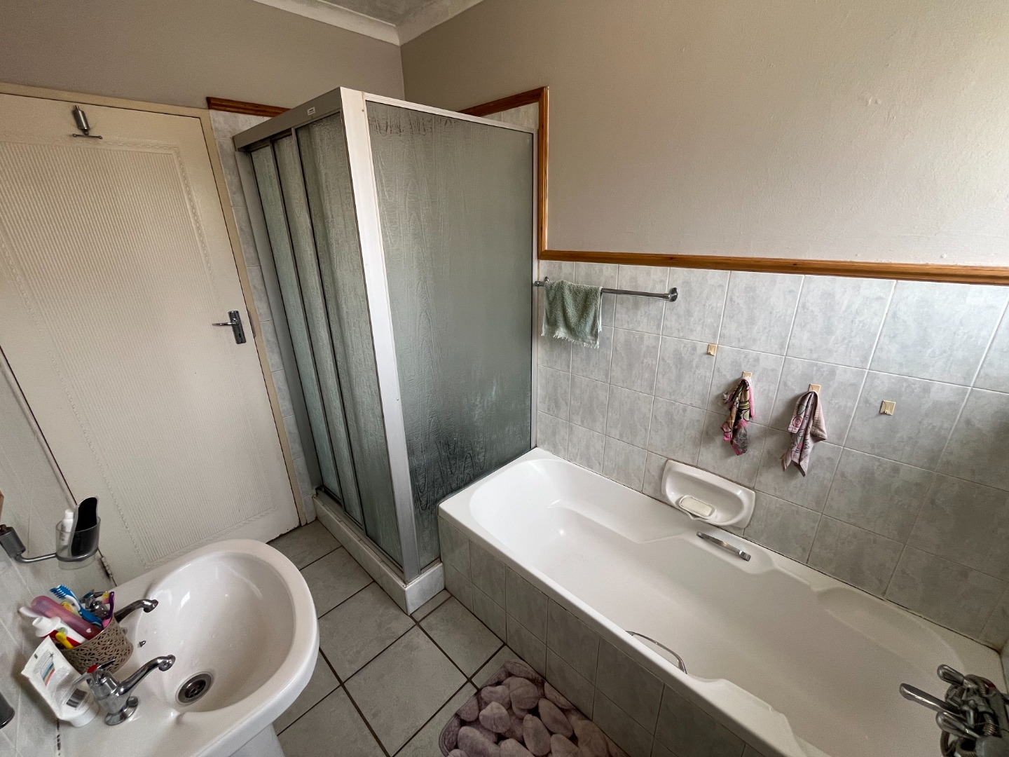 The bathroom is thoughtfully designed and well-maintained, offering a full-sized bathtub, a standalone shower, a toilet, and a modern basin with vanity cabinet. It serves both bedrooms, making it ideal for small families or guests. The shared layout ensures convenience without compromising privacy or style.