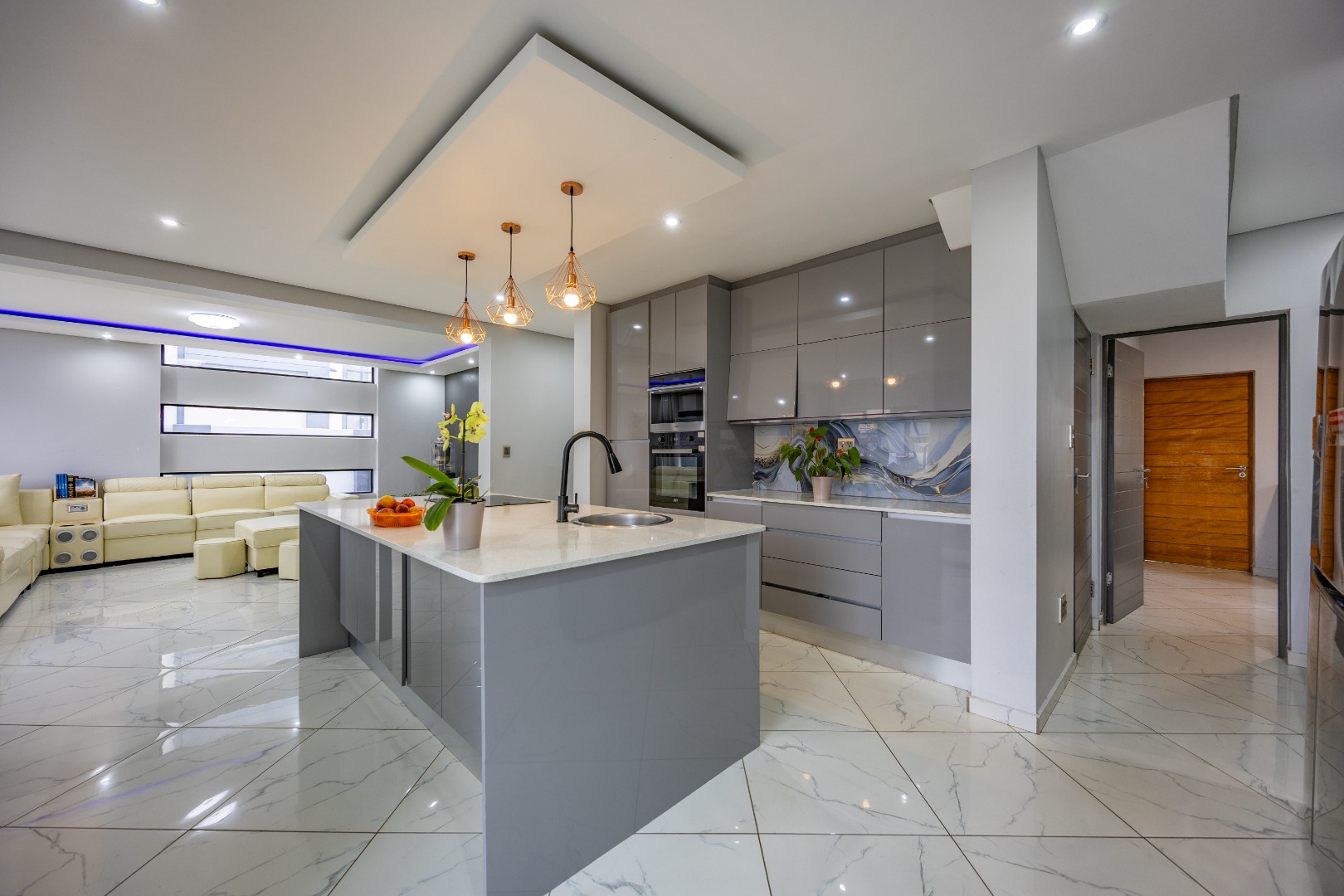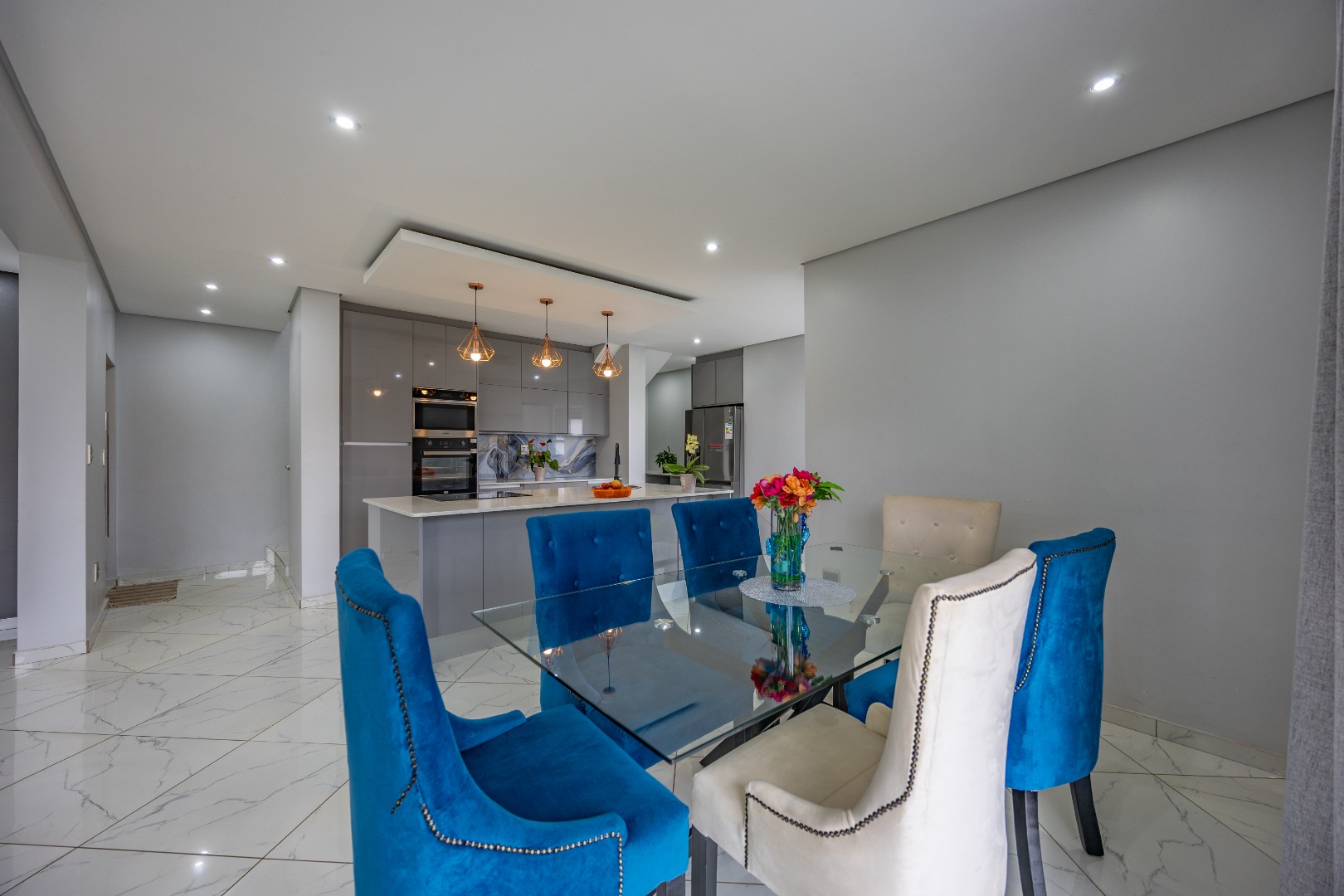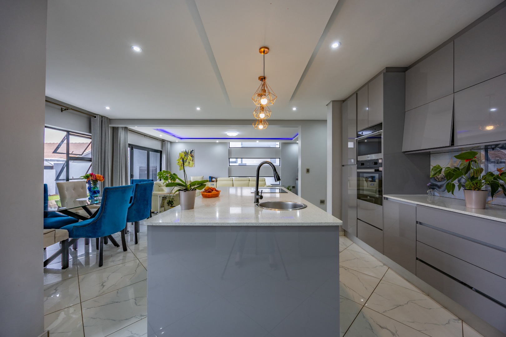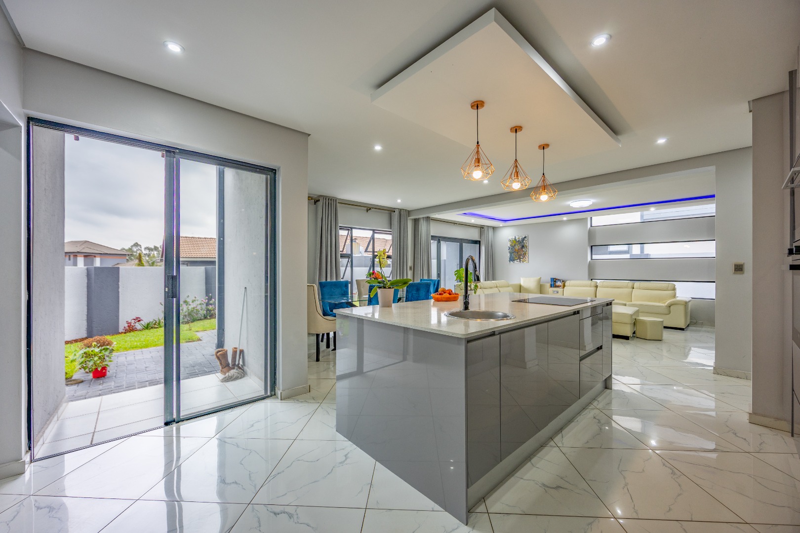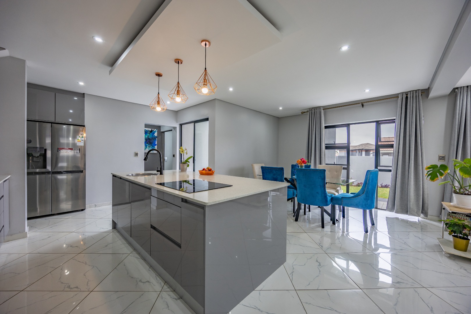 Welcome to this stunning 4-bedroom, 3-bathroom free-standing home located in a sought-after security estate offering 24-hour guarded access and peace of mind. Step through the front door and be greeted by an abundance of natural light, elegant bulk ceilings, and a spacious open-plan layout. The TV lounge, dining area, and designer kitchen flow seamlessly together, creating the perfect space for family living and entertaining. The kitchen features luxurious marble countertops, a massive center island that doubles as a breakfast counter, built-in oven and microwave, convection stove, and sleek push-touch cabinetry.