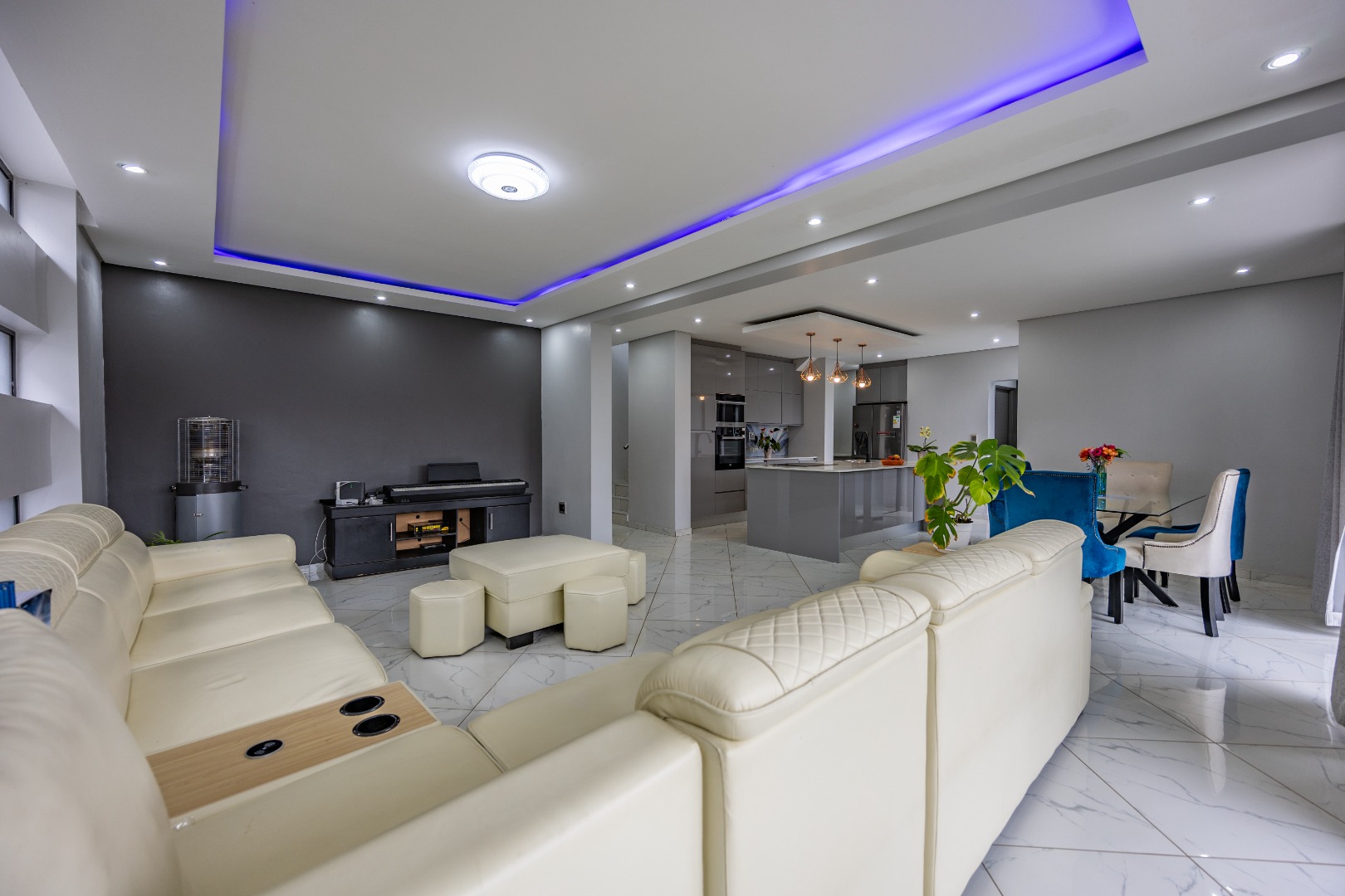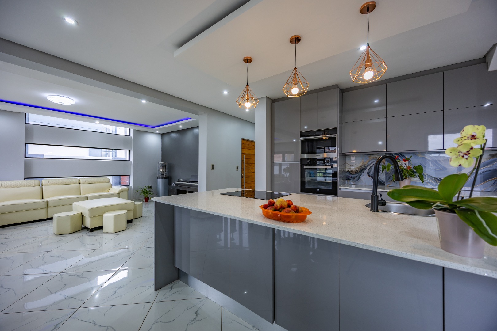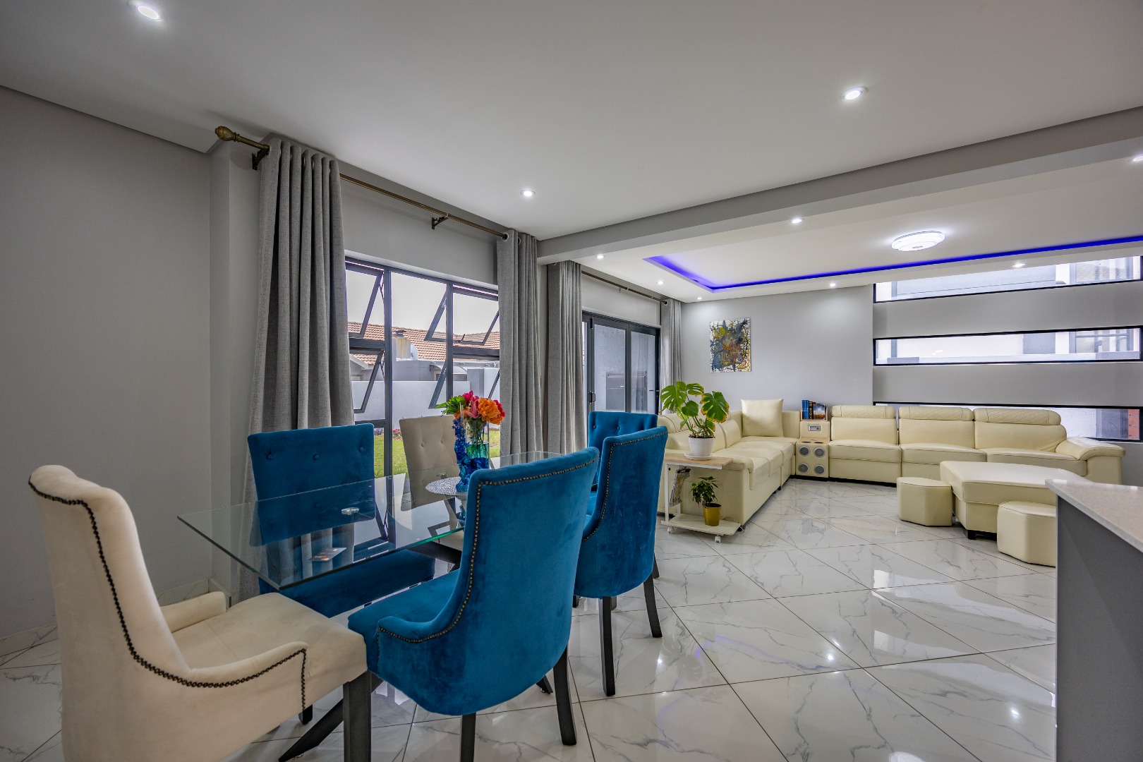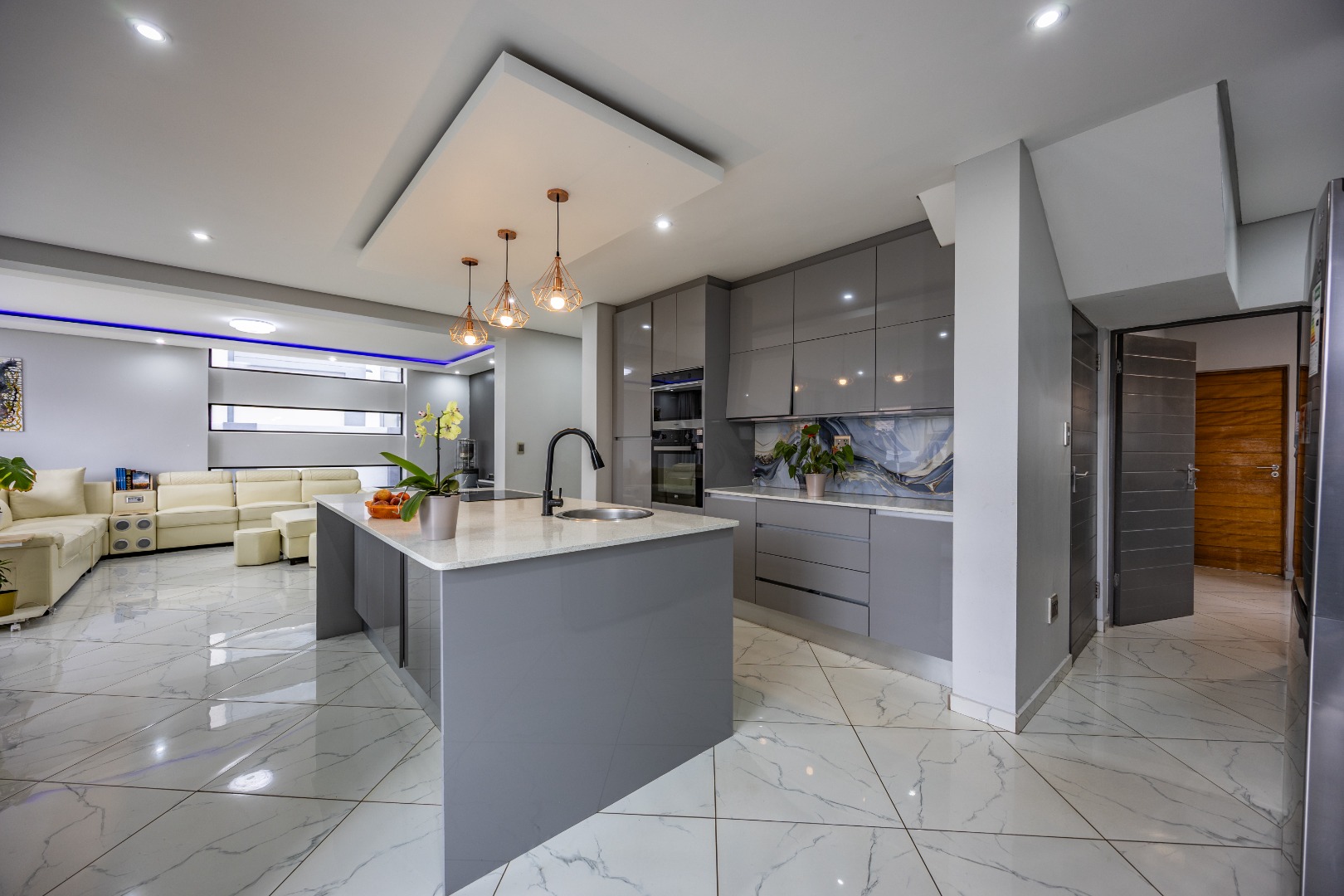 Welcome to this stunning 4-bedroom, 3-bathroom free-standing home located in a sought-after security estate offering 24-hour guarded access and peace of mind. Step through the front door and be greeted by an abundance of natural light, elegant bulk ceilings, and a spacious open-plan layout. The TV lounge, dining area, and designer kitchen flow seamlessly together, creating the perfect space for family living and entertaining. The kitchen features luxurious marble countertops, a massive center island that doubles as a breakfast counter, built-in oven and microwave, convection stove, and sleek push-touch cabinetry.