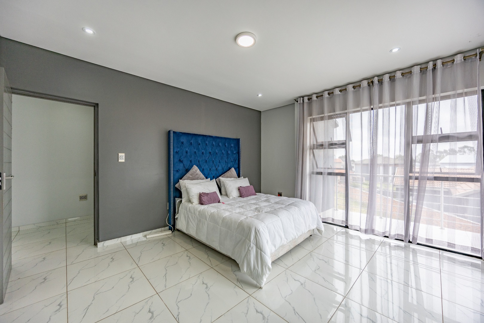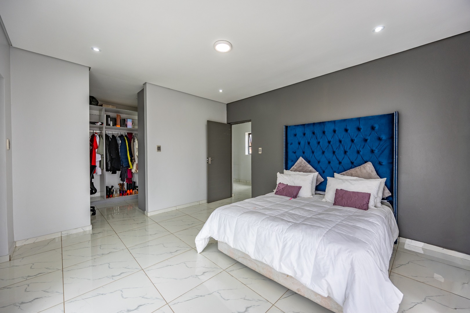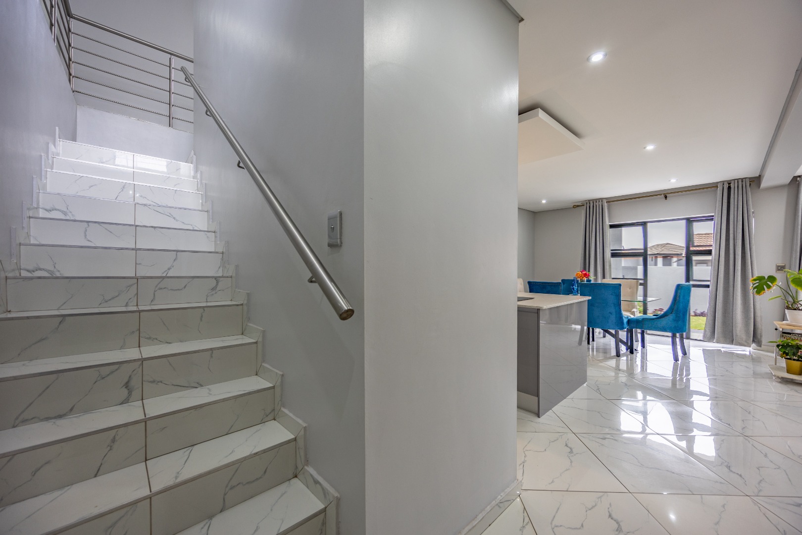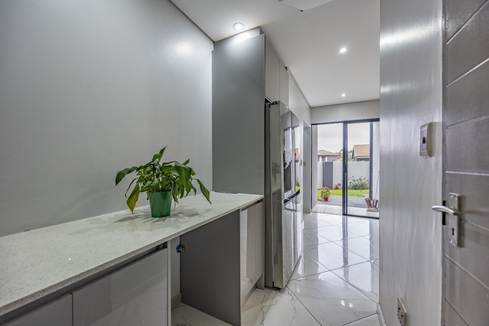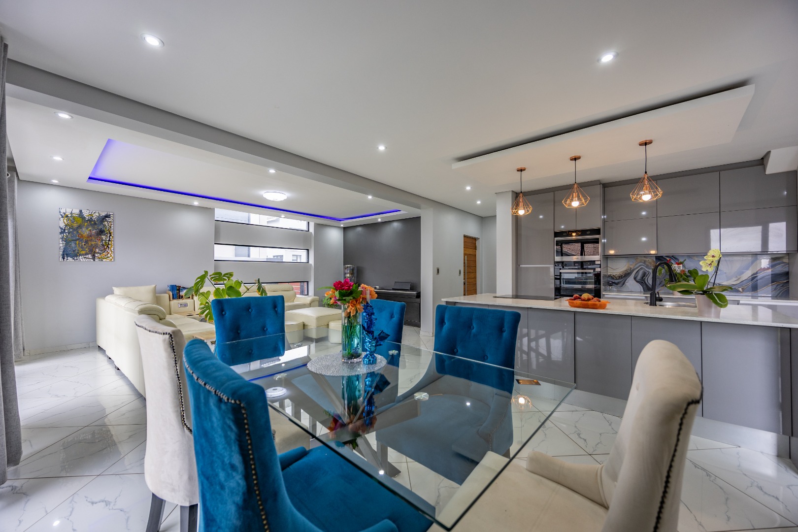 Welcome to this stunning 4-bedroom, 3-bathroom free-standing home located in a sought-after security estate offering 24-hour guarded access and peace of mind. Step through the front door and be greeted by an abundance of natural light, elegant bulk ceilings, and a spacious open-plan layout. The TV lounge, dining area, and designer kitchen flow seamlessly together, creating the perfect space for family living and entertaining. The kitchen features luxurious marble countertops, a massive center island that doubles as a breakfast counter, built-in oven and microwave, convection stove, and sleek push-touch cabinetry.