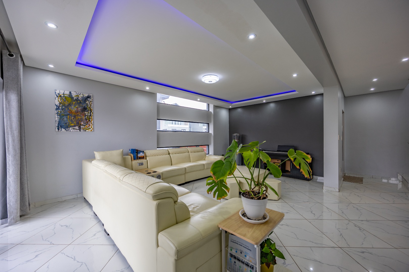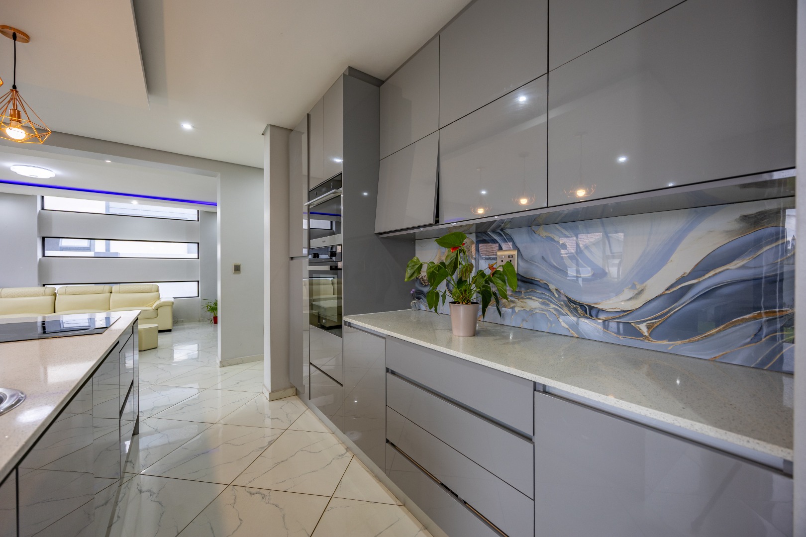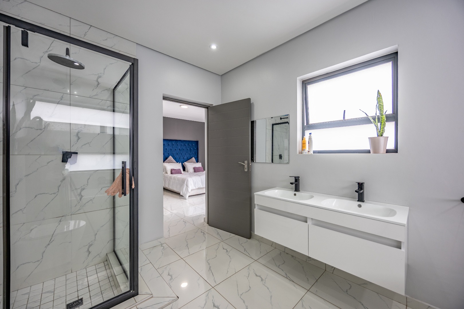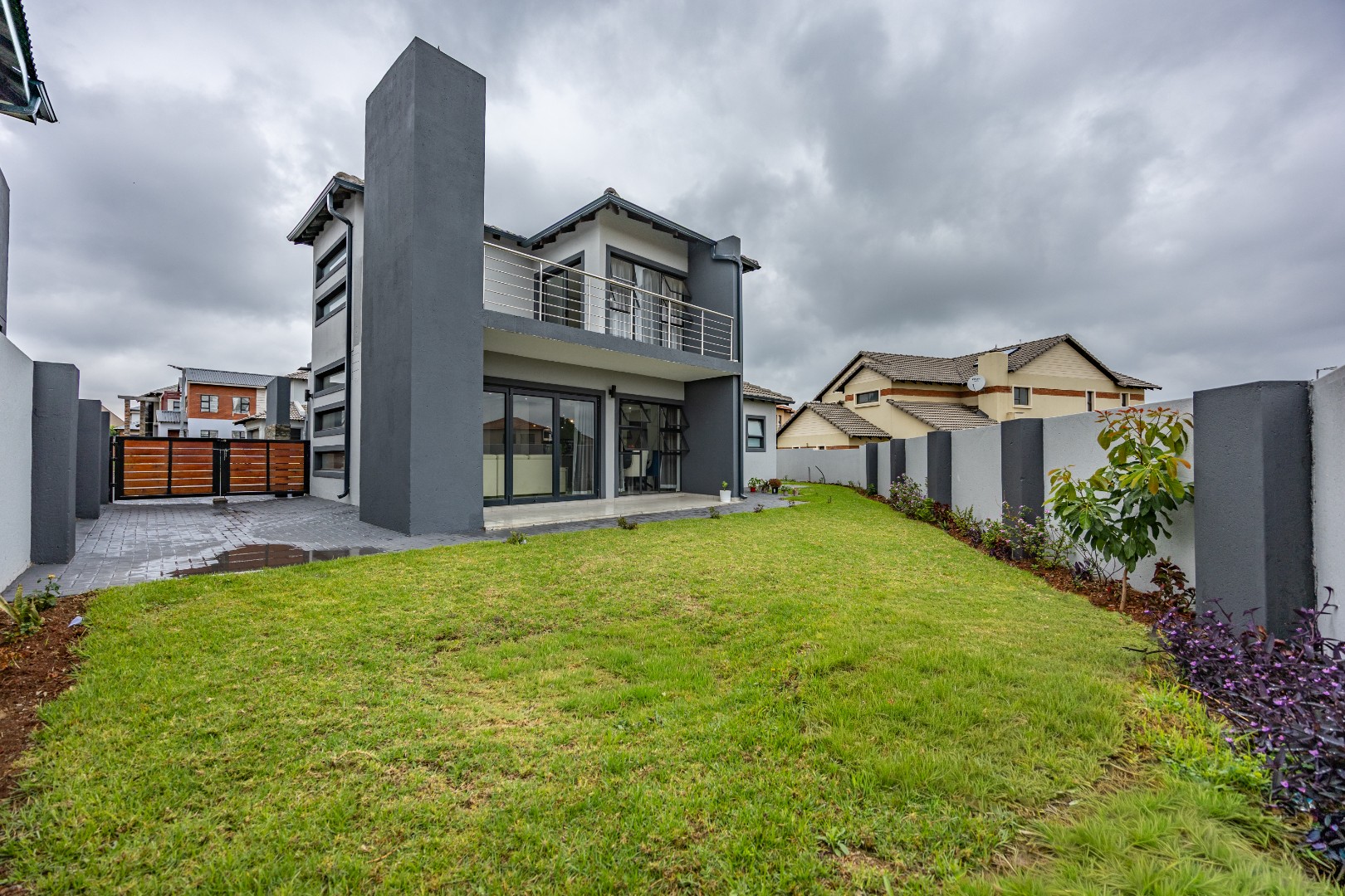 Welcome to this stunning 4-bedroom, 3-bathroom free-standing home located in a sought-after security estate offering 24-hour guarded access and peace of mind. Step through the front door and be greeted by an abundance of natural light, elegant bulk ceilings, and a spacious open-plan layout. The TV lounge, dining area, and designer kitchen flow seamlessly together, creating the perfect space for family living and entertaining. The kitchen features luxurious marble countertops, a massive center island that doubles as a breakfast counter, built-in oven and microwave, convection stove, and sleek push-touch cabinetry.