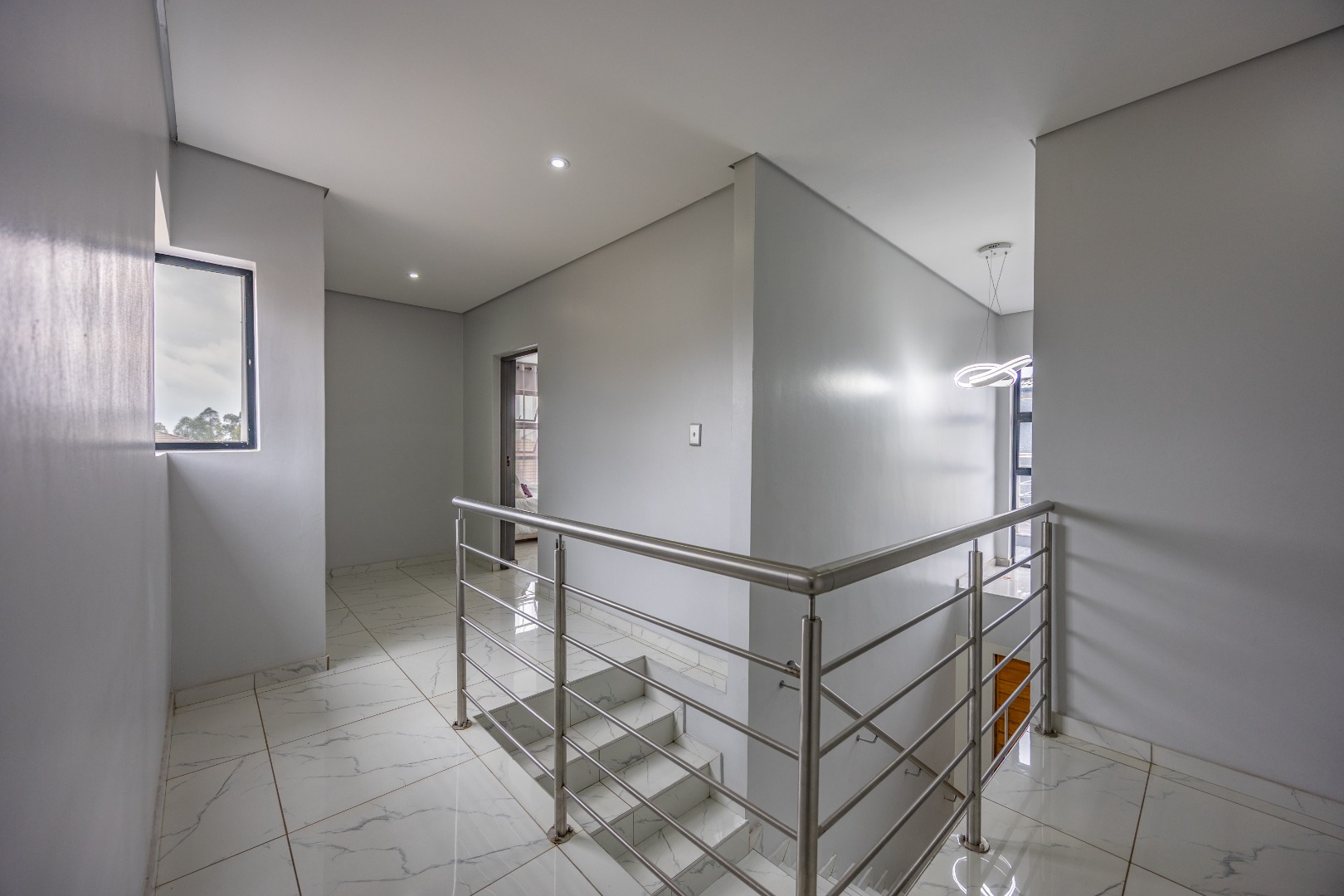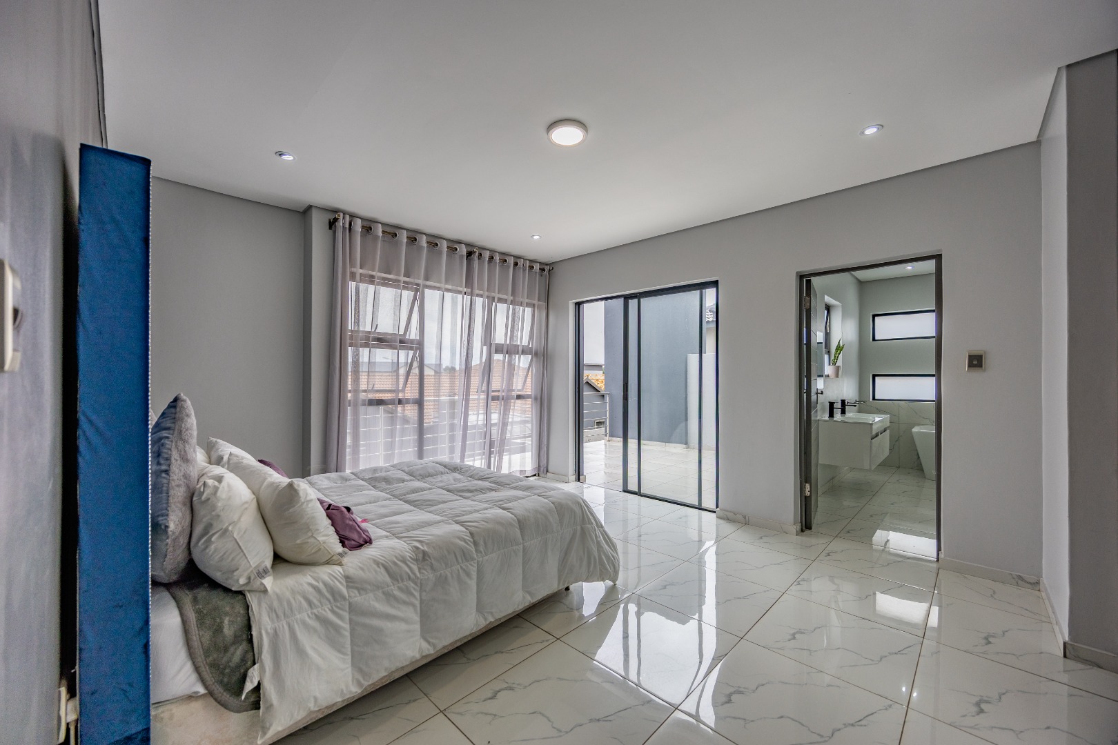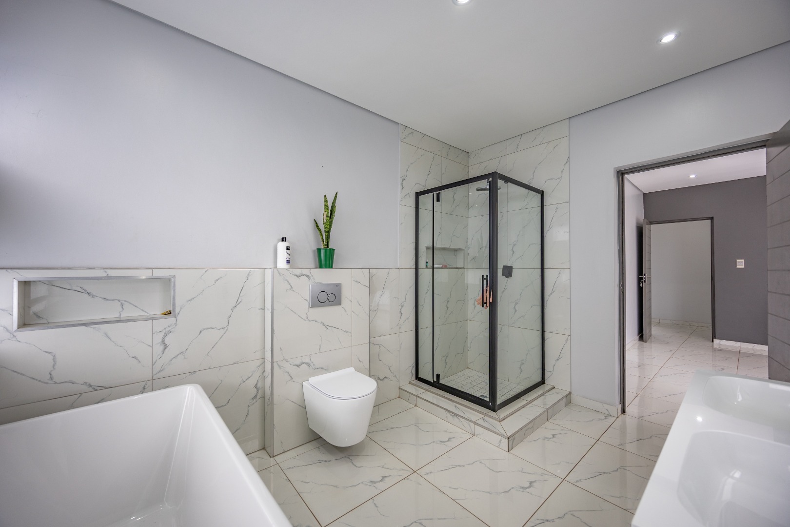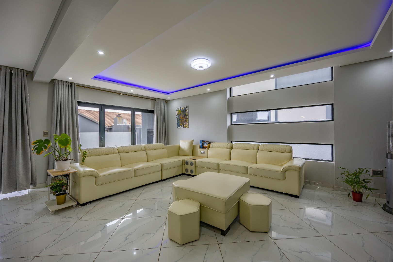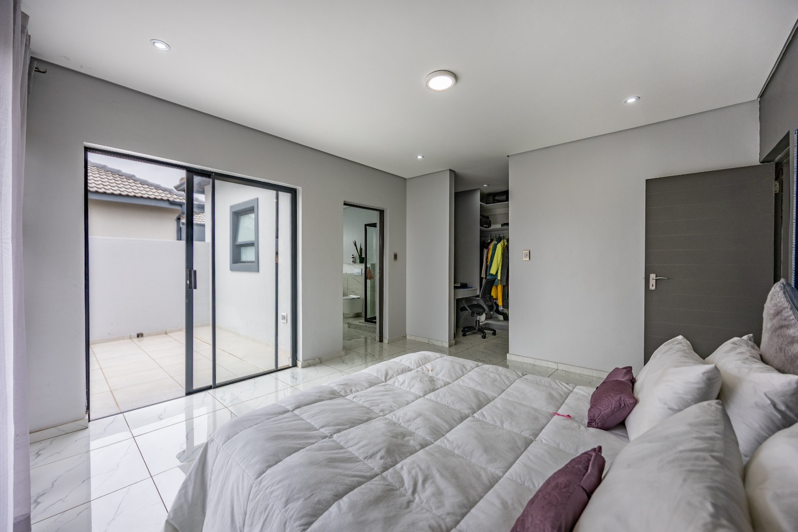 Welcome to this stunning 4-bedroom, 3-bathroom free-standing home located in a sought-after security estate offering 24-hour guarded access and peace of mind. Step through the front door and be greeted by an abundance of natural light, elegant bulk ceilings, and a spacious open-plan layout. The TV lounge, dining area, and designer kitchen flow seamlessly together, creating the perfect space for family living and entertaining. The kitchen features luxurious marble countertops, a massive center island that doubles as a breakfast counter, built-in oven and microwave, convection stove, and sleek push-touch cabinetry.