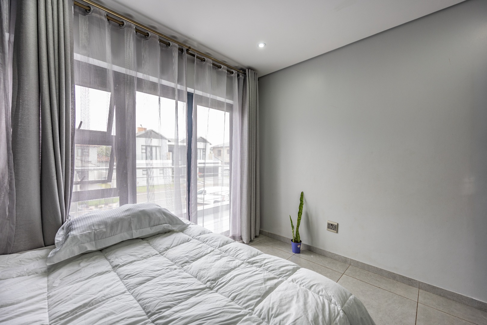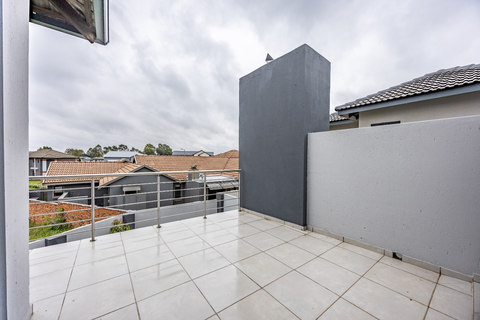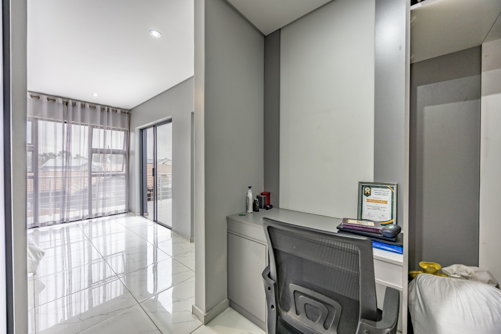 Upstairs, the main bedroom suite impresses with its generous size, walk-in closet, built-in vanity/writing desk, and luxurious en-suite bathroom featuring a large bathtub, shower, double basins, and toilet. Large sliding doors open onto a spacious balcony—a perfect retreat for morning coffee or evening sunsets. Two additional bedrooms with built-in cupboards share a modern full bathroom. The estate offers fantastic lifestyle amenities, including a clubhouse, swimming pool, kids’ play area, communal braai facilities, and a function hall. With 24-hour patrolled security, this home blends modern elegance, comfort, and safety for the ideal family living experience.