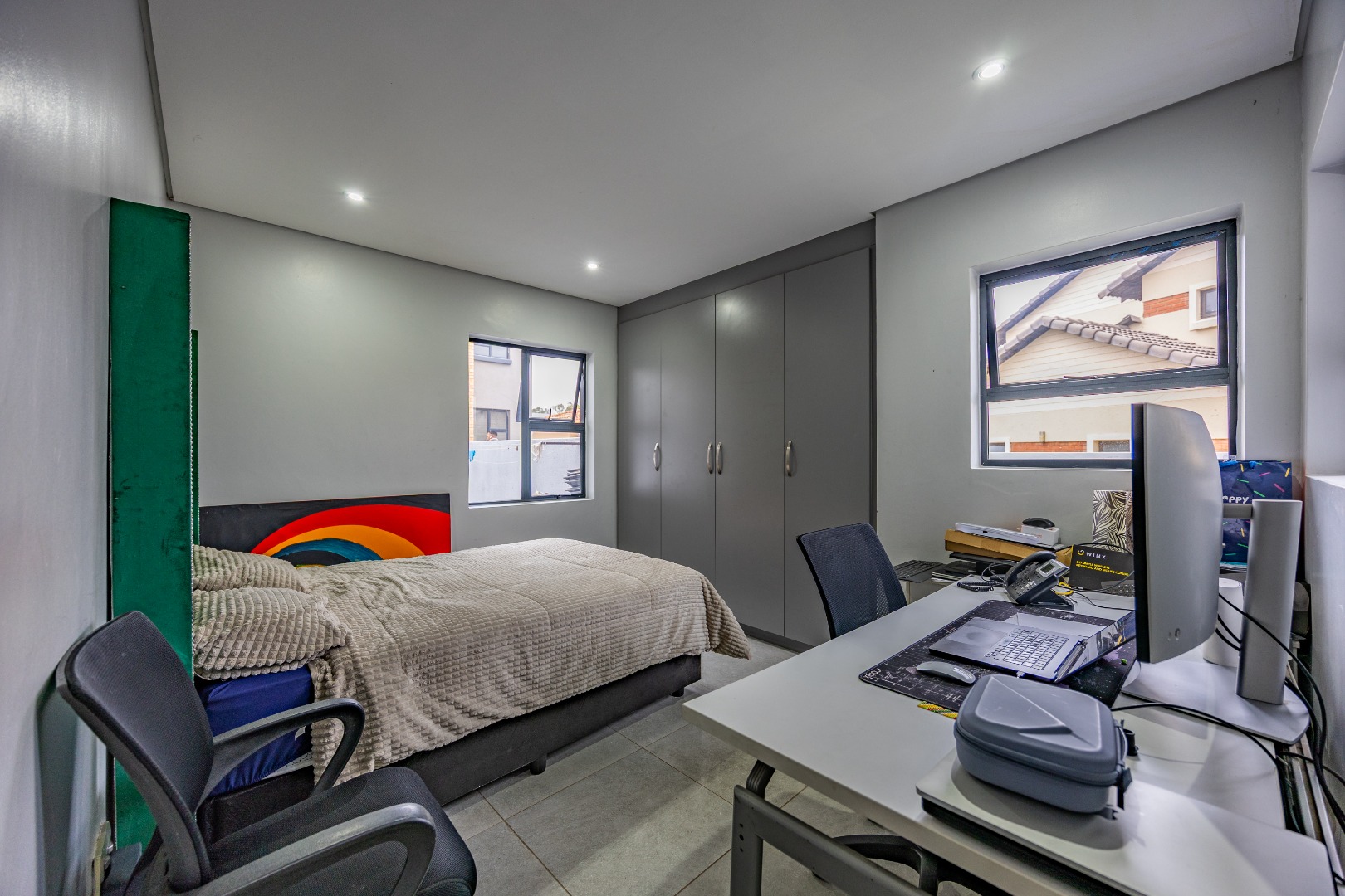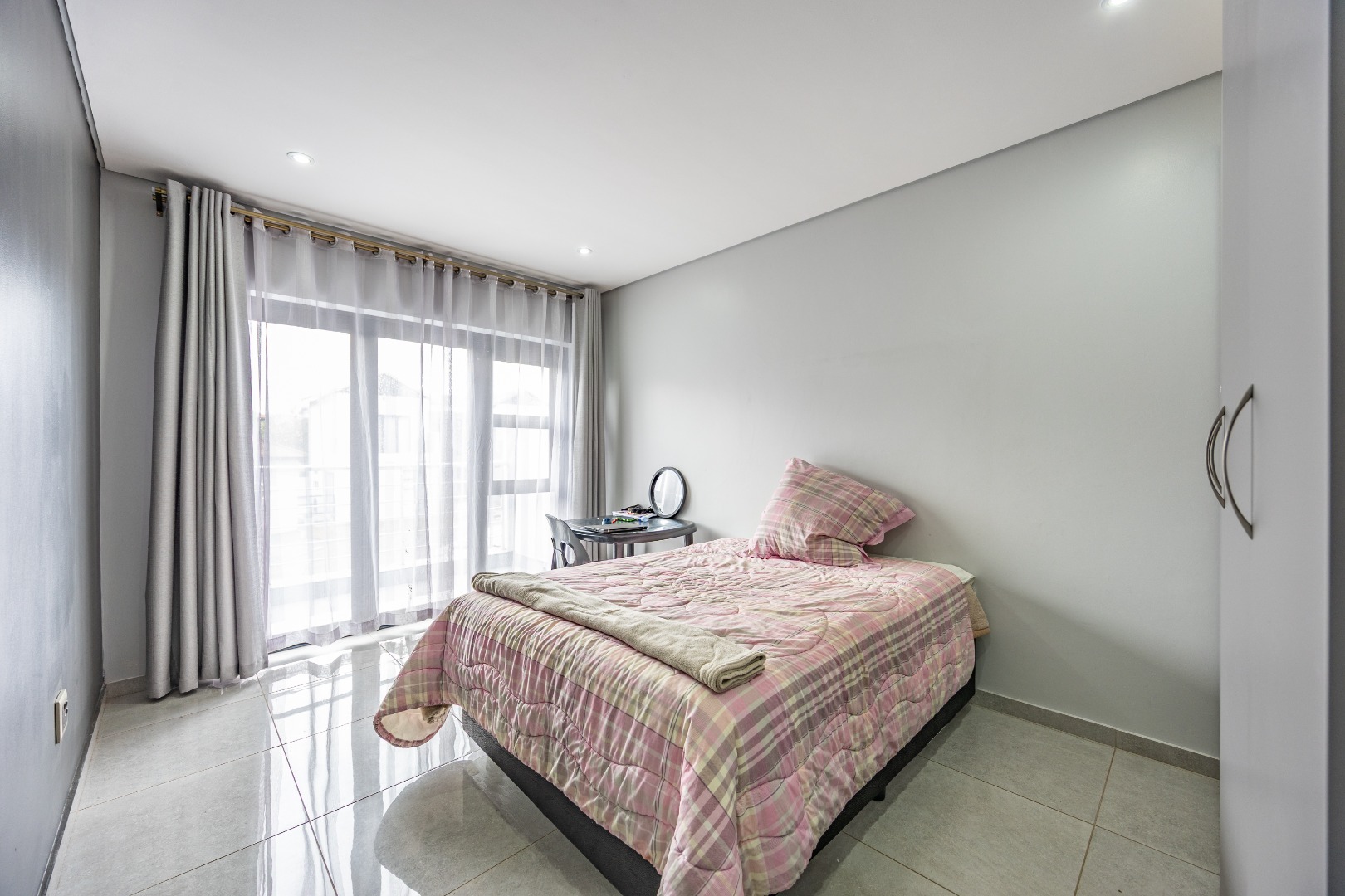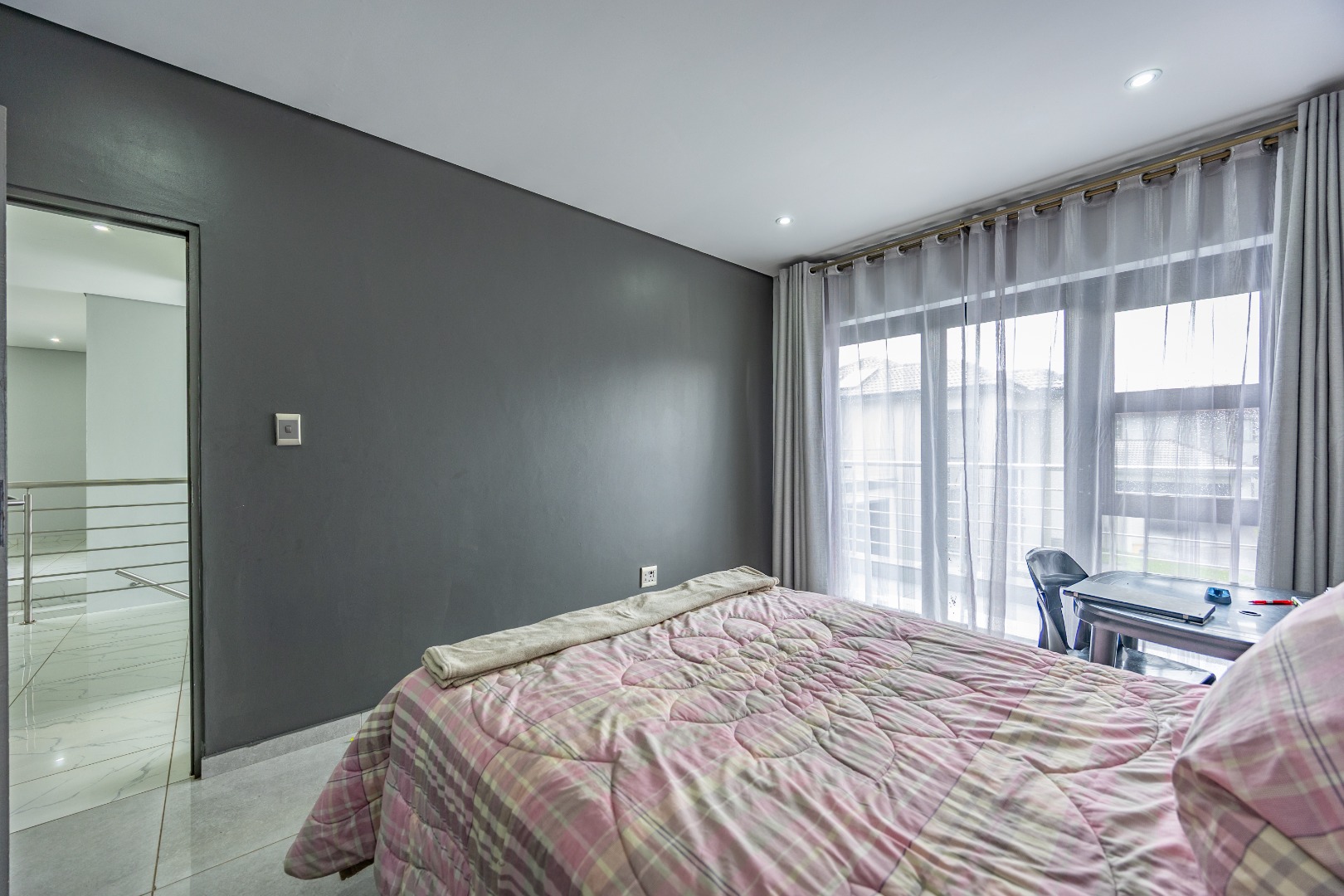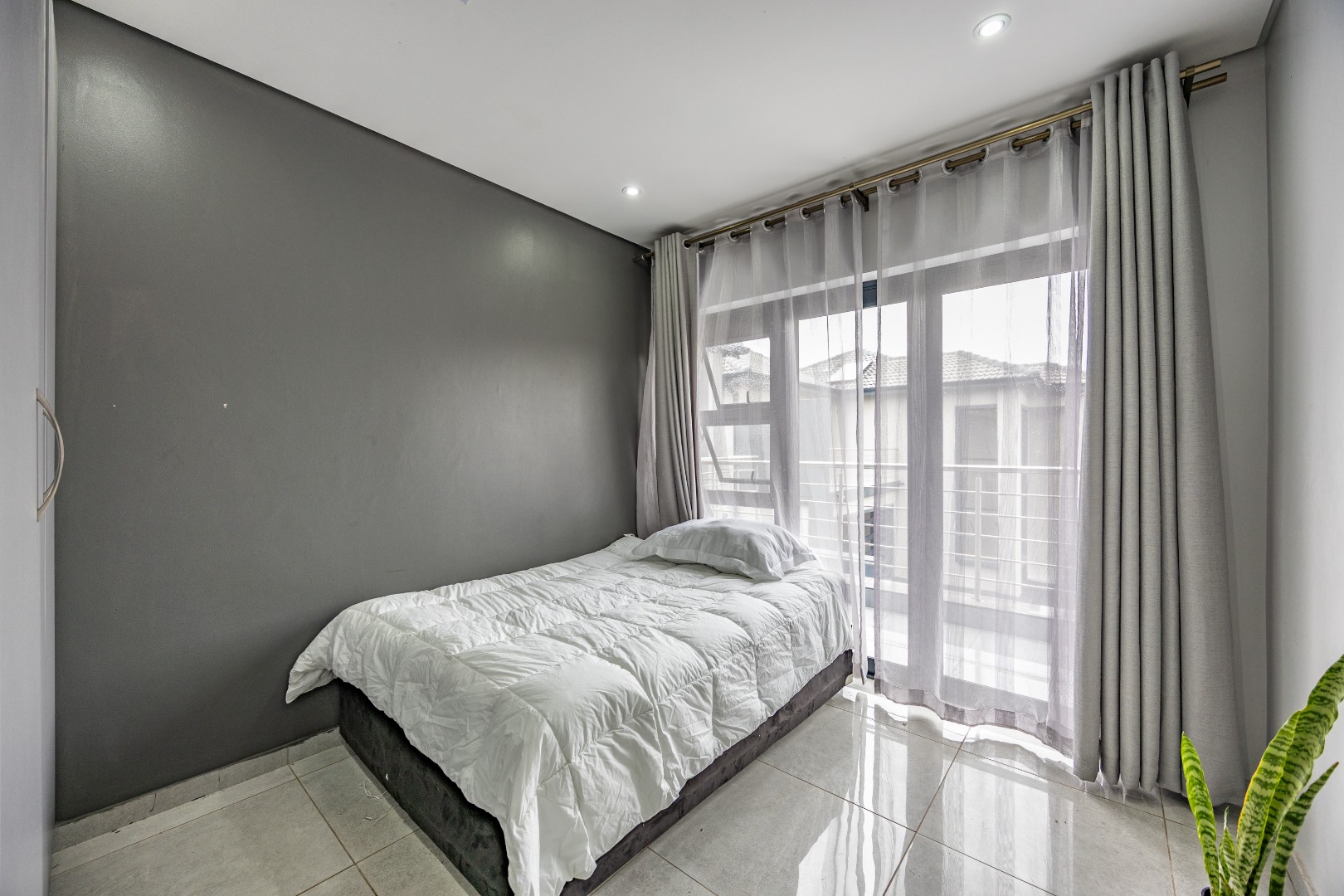 Upstairs, the main bedroom suite impresses with its generous size, walk-in closet, built-in vanity/writing desk, and luxurious en-suite bathroom featuring a large bathtub, shower, double basins, and toilet. Large sliding doors open onto a spacious balcony—a perfect retreat for morning coffee or evening sunsets. Two additional bedrooms with built-in cupboards share a modern full bathroom. The estate offers fantastic lifestyle amenities, including a clubhouse, swimming pool, kids’ play area, communal braai facilities, and a function hall. With 24-hour patrolled security, this home blends modern elegance, comfort, and safety for the ideal family living experience.