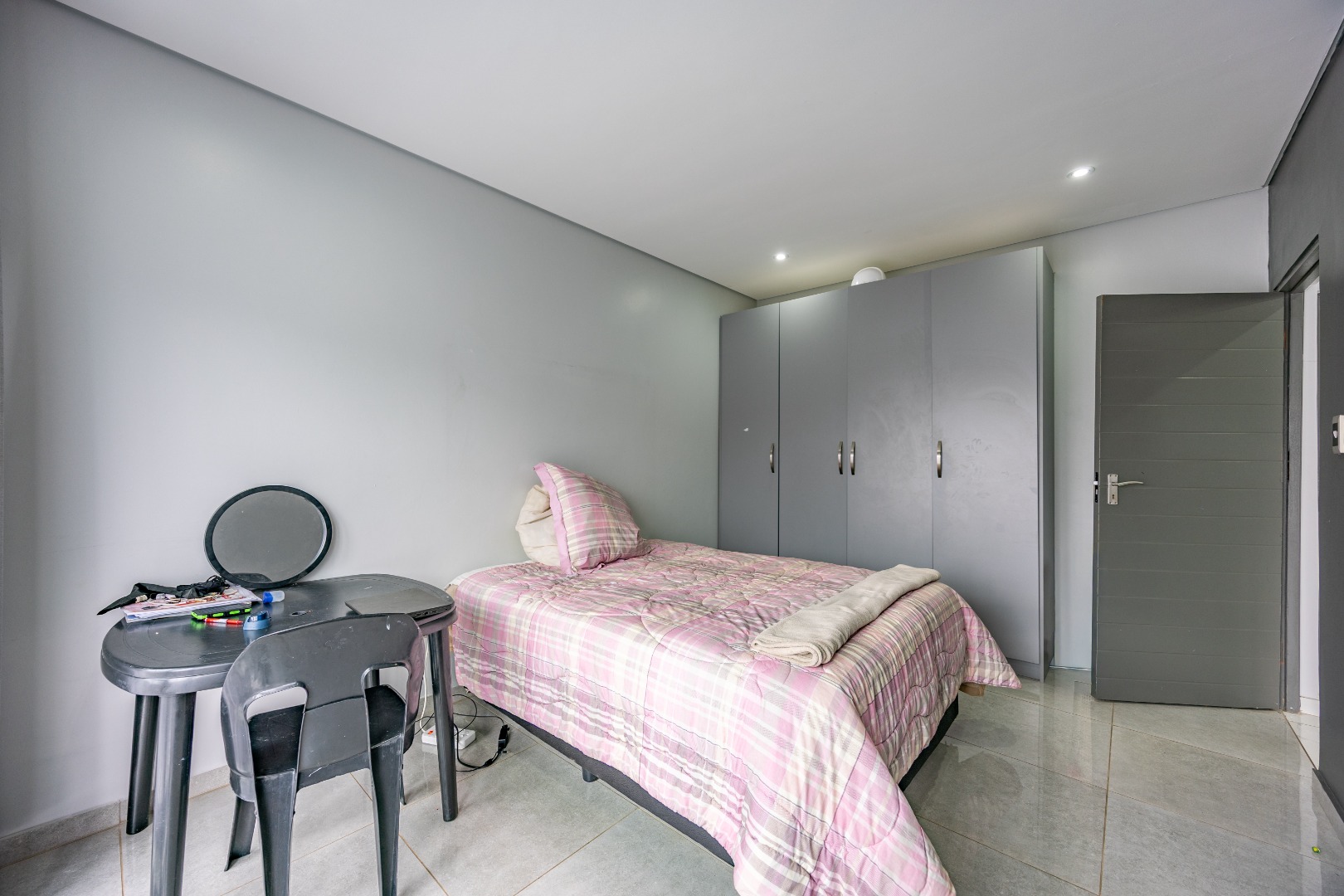The TV lounge opens through sliding doors onto a covered patio with a built-in braai, overlooking the private backyard—ideal for hosting guests or relaxing with family. A separate scullery/wash-up area provides space for three appliances, a double-door fridge, and direct access to the back washing line. The downstairs bedroom offers flexibility as a guest room or study and is serviced by a stylish guest bathroom with a shower, toilet, and basin. The double automated garage has an interleading door into the home, and the paved driveway accommodates two additional vehicles, with extra gated space at the back for a trailer or more parking.