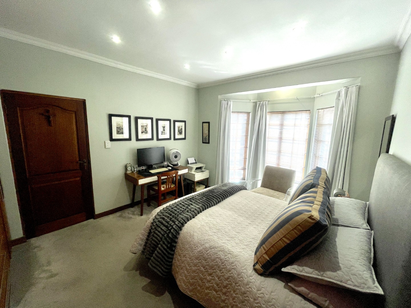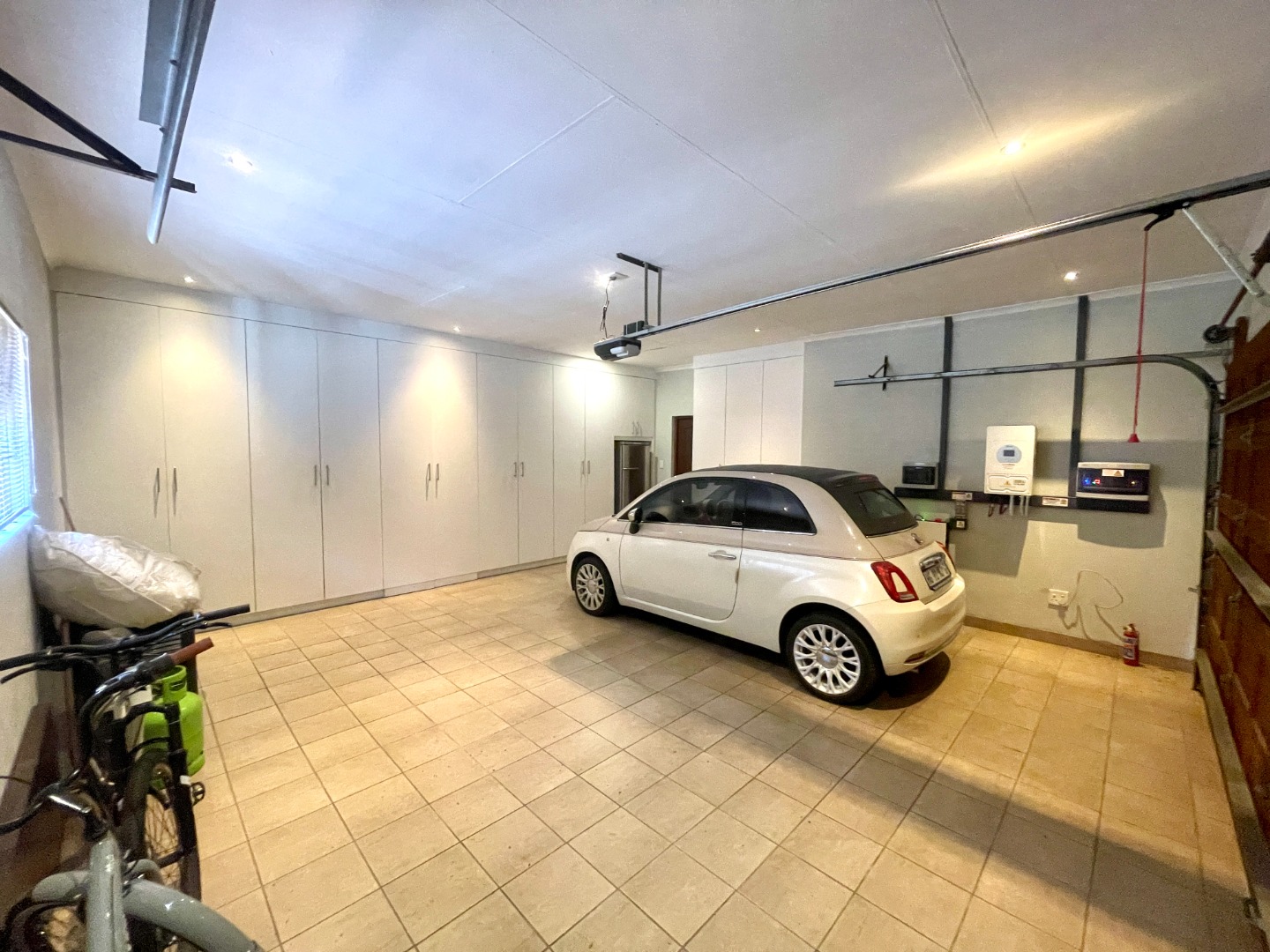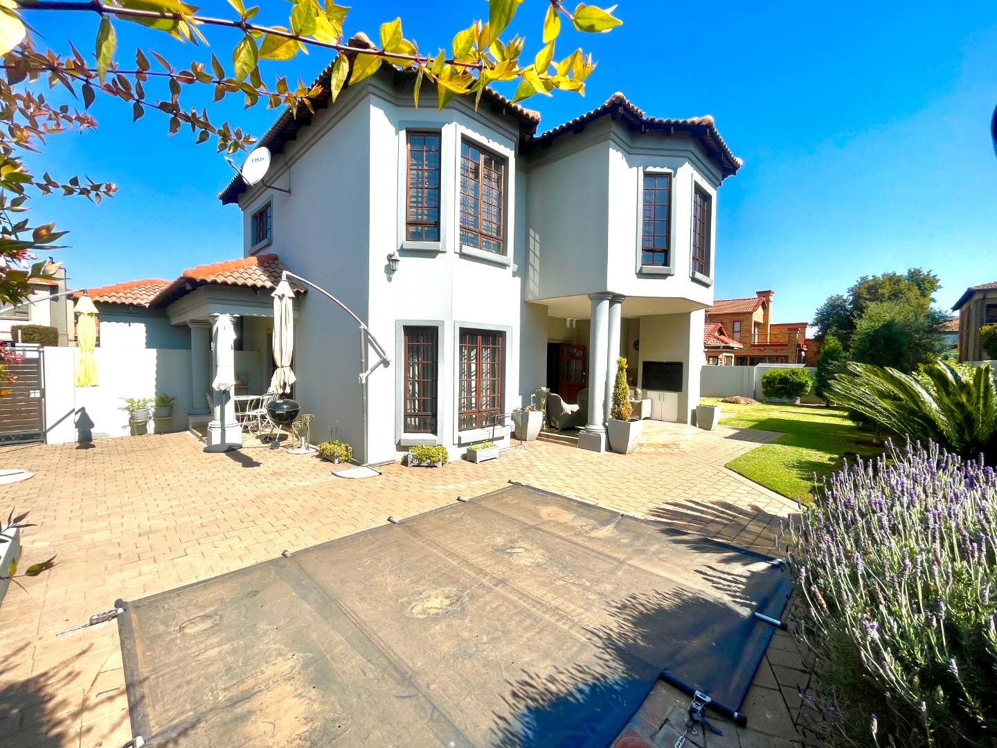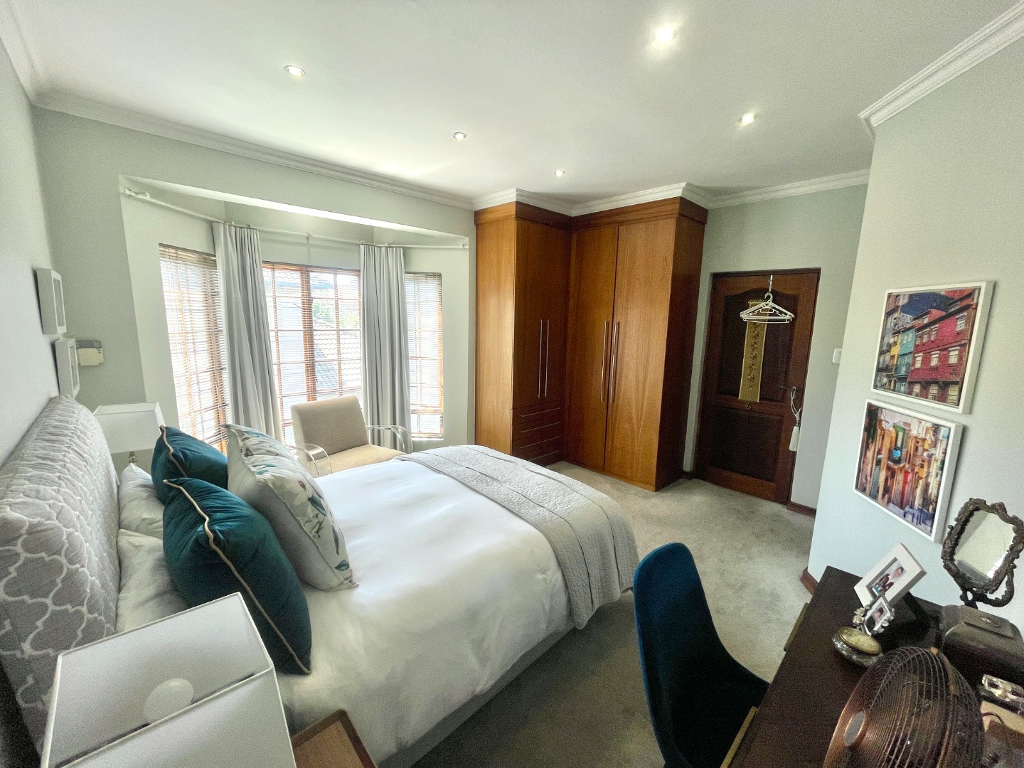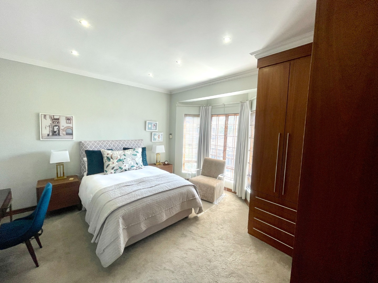 The thoughtfully designed kitchen is a culinary dream with a central island, gas hops, walk-in pantry, and space for three appliances and generous walk-in pantry, while the open-plan layout flows effortlessly into expansive living and dining areas, including a cozy library nook. Double wooden doors open out to your entertainment haven – a covered patio with built-in braai overlooking a sparkling pool and lush, private garden. Upstairs, three beautifully finished bedrooms provide restful retreats, including a renovated main bedroom with a large en-suit bathroom. Bonus features include a separate en-suite staff room (ideal as a separate flatlet), ample storage, oversized garages, a trailer parking, and energy-efficient extras like a 5KW inverter, battery, and 8 solar panels.