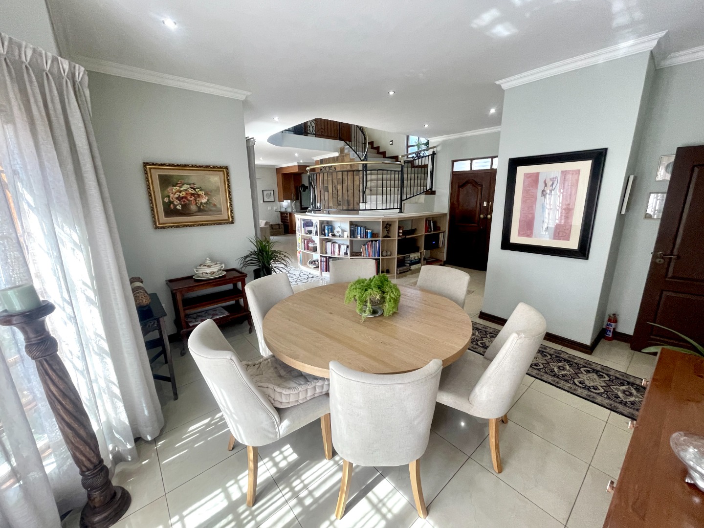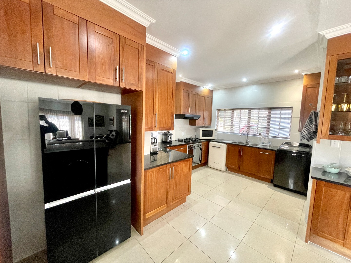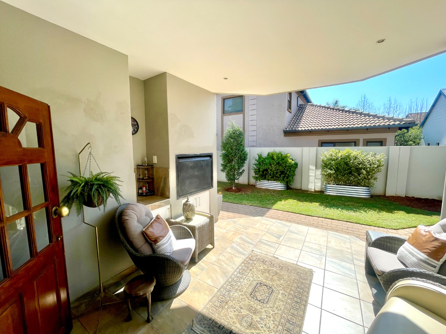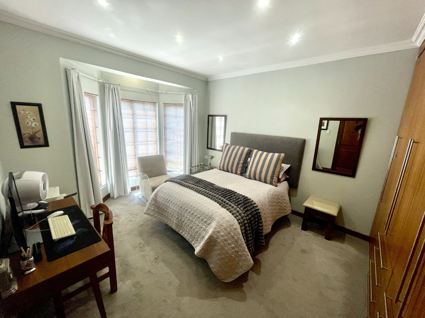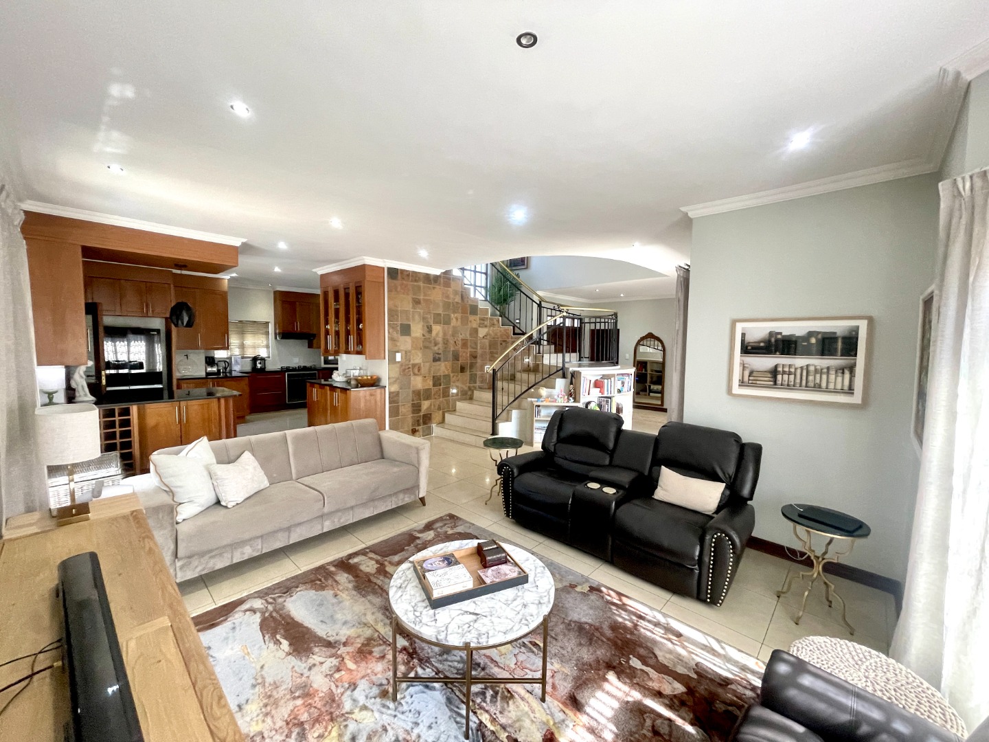 The thoughtfully designed kitchen is a culinary dream with a central island, gas hops, walk-in pantry, and space for three appliances and generous walk-in pantry, while the open-plan layout flows effortlessly into expansive living and dining areas, including a cozy library nook. Double wooden doors open out to your entertainment haven – a covered patio with built-in braai overlooking a sparkling pool and lush, private garden. Upstairs, three beautifully finished bedrooms provide restful retreats, including a renovated main bedroom with a large en-suit bathroom. Bonus features include a separate en-suite staff room (ideal as a separate flatlet), ample storage, oversized garages, a trailer parking, and energy-efficient extras like a 5KW inverter, battery, and 8 solar panels.