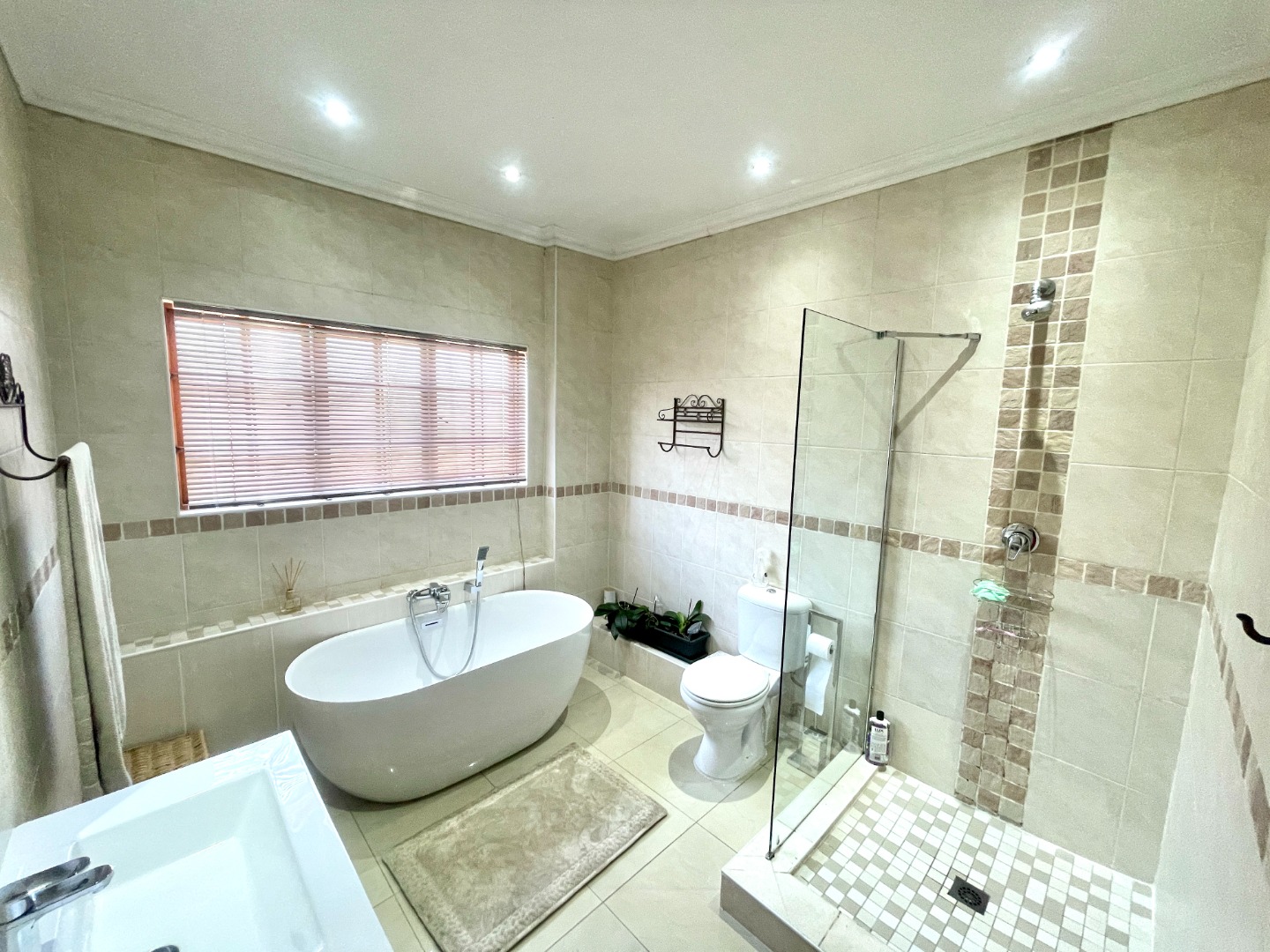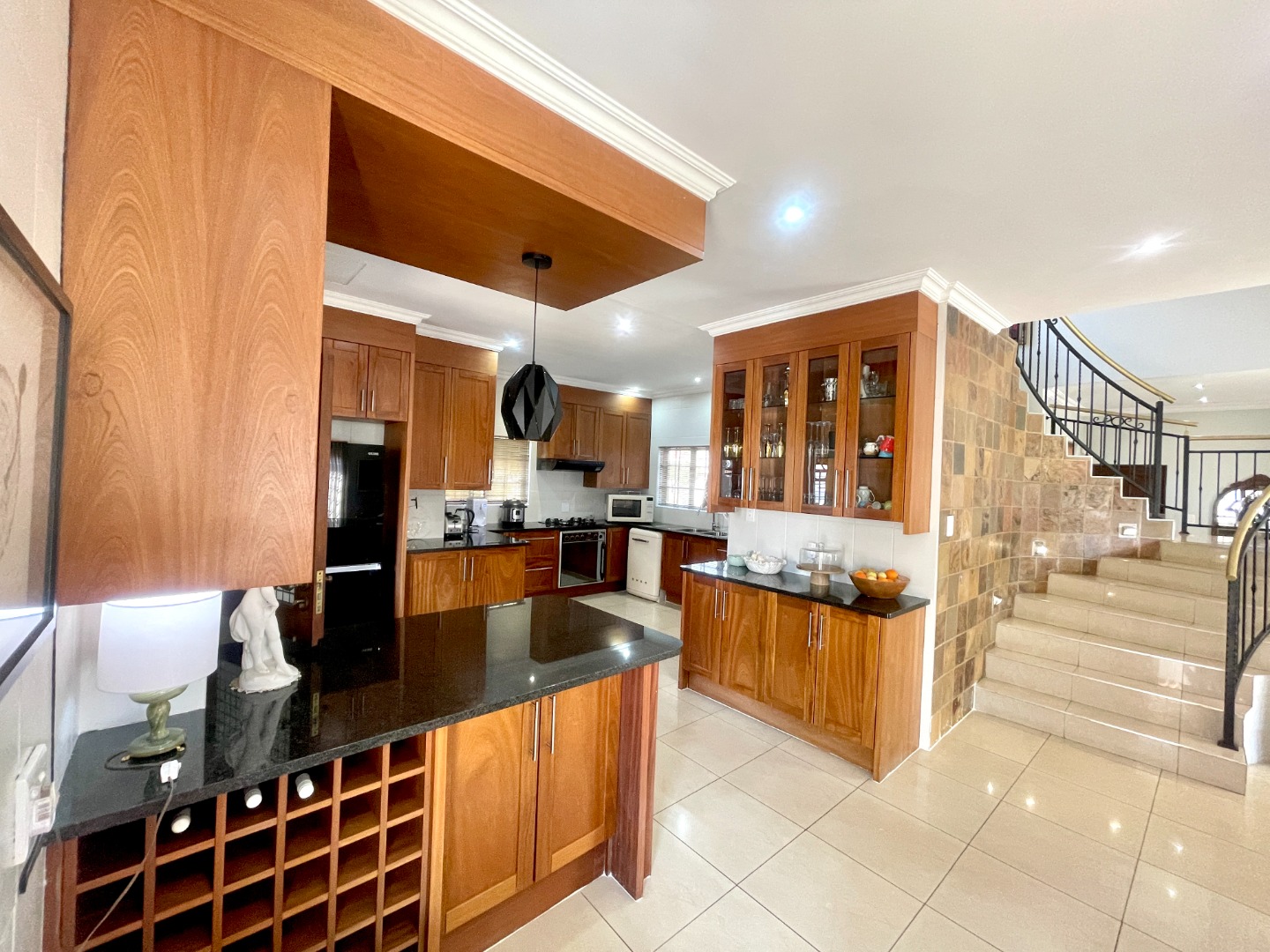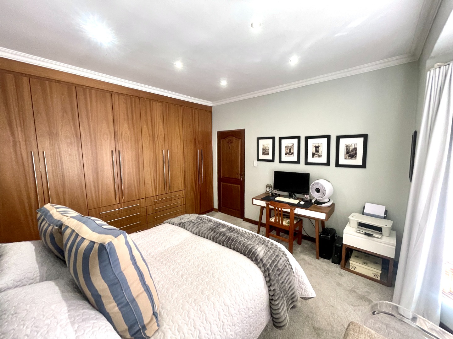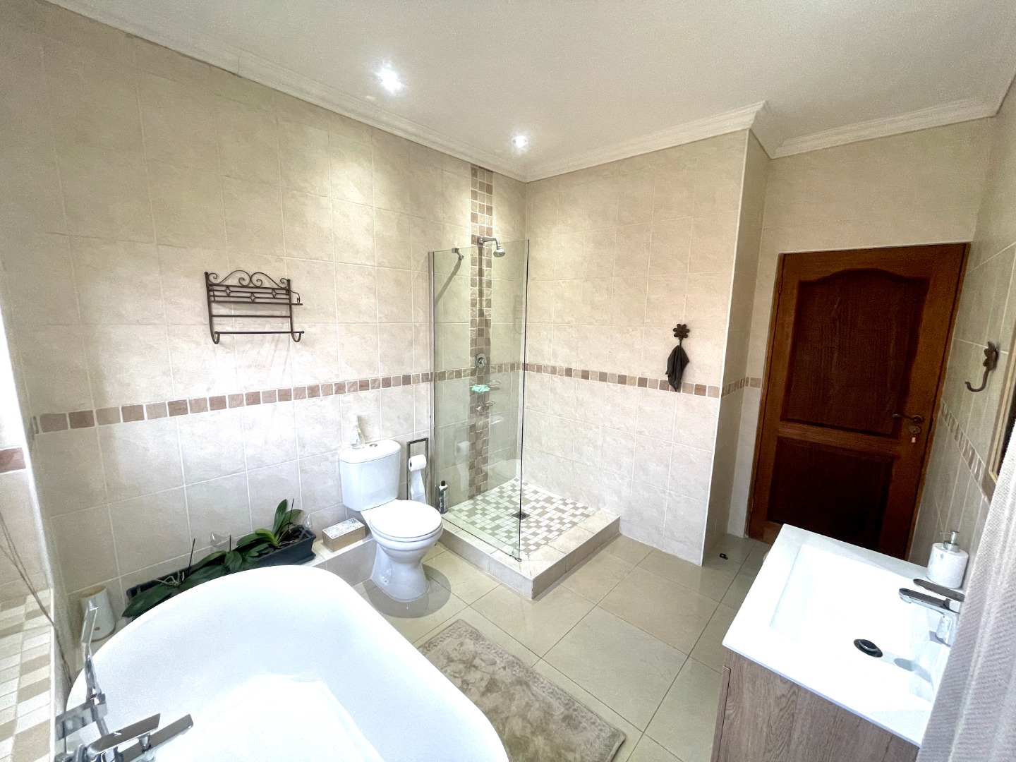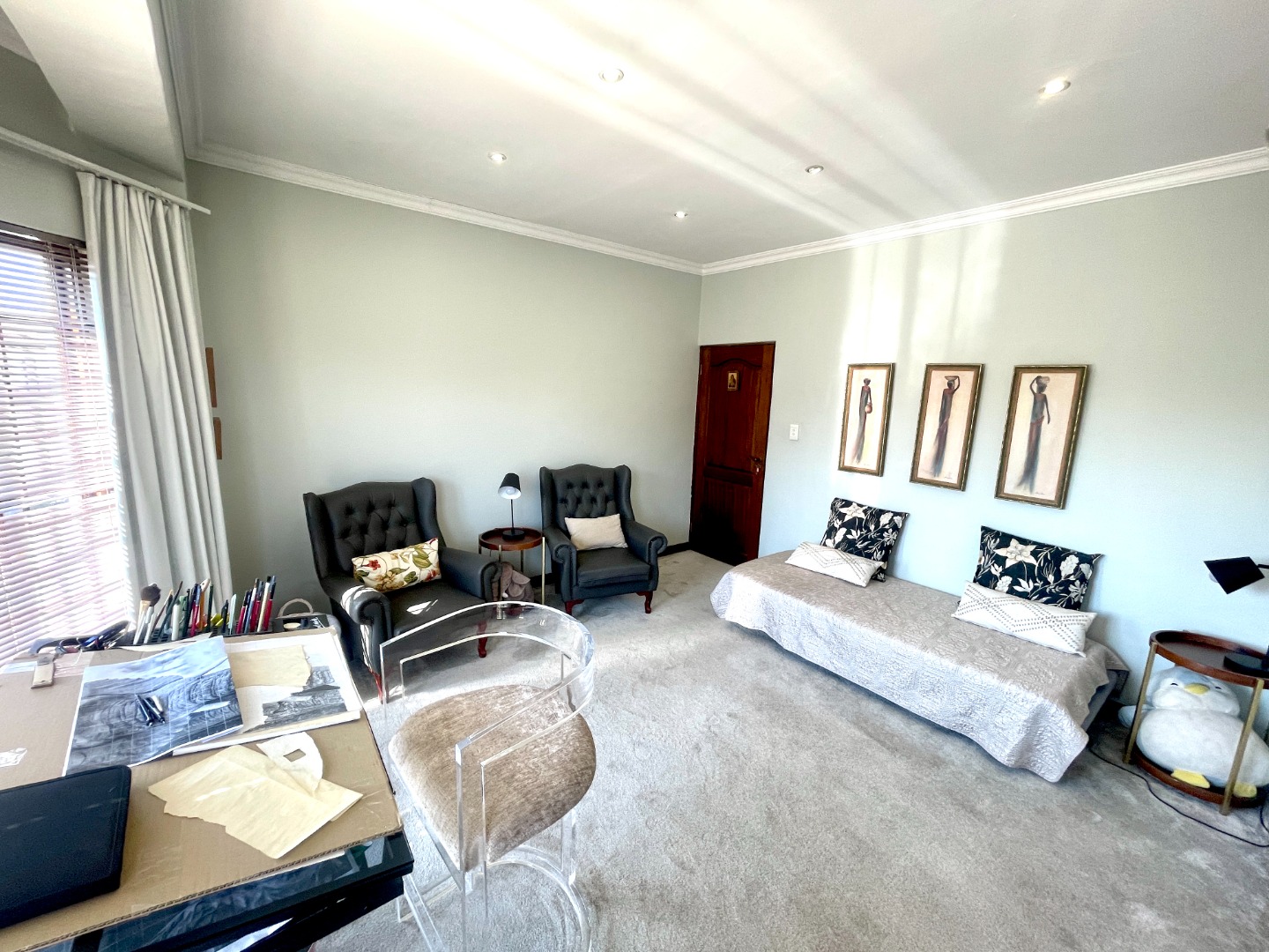 The thoughtfully designed kitchen is a culinary dream with a central island, gas hops, walk-in pantry, and space for three appliances and generous walk-in pantry, while the open-plan layout flows effortlessly into expansive living and dining areas, including a cozy library nook. Double wooden doors open out to your entertainment haven – a covered patio with built-in braai overlooking a sparkling pool and lush, private garden. Upstairs, three beautifully finished bedrooms provide restful retreats, including a renovated main bedroom with a large en-suit bathroom. Bonus features include a separate en-suite staff room (ideal as a separate flatlet), ample storage, oversized garages, a trailer parking, and energy-efficient extras like a 5KW inverter, battery, and 8 solar panels.