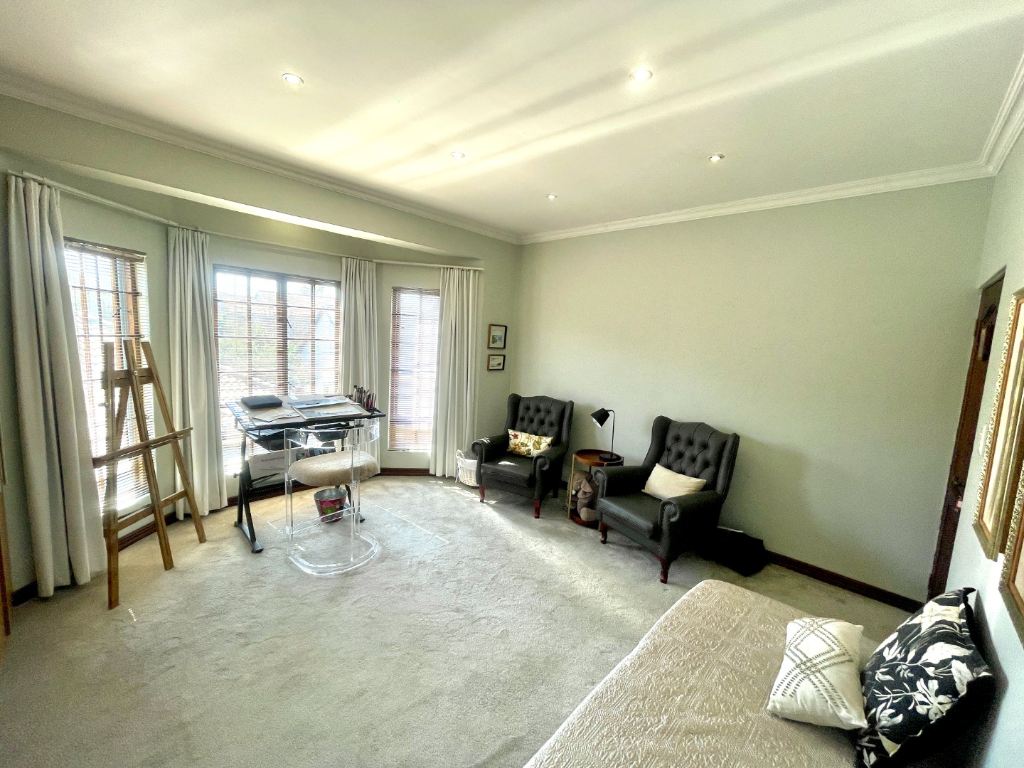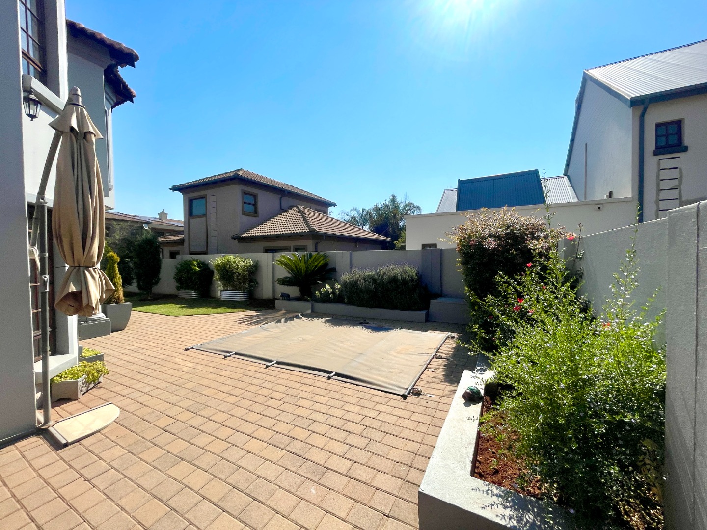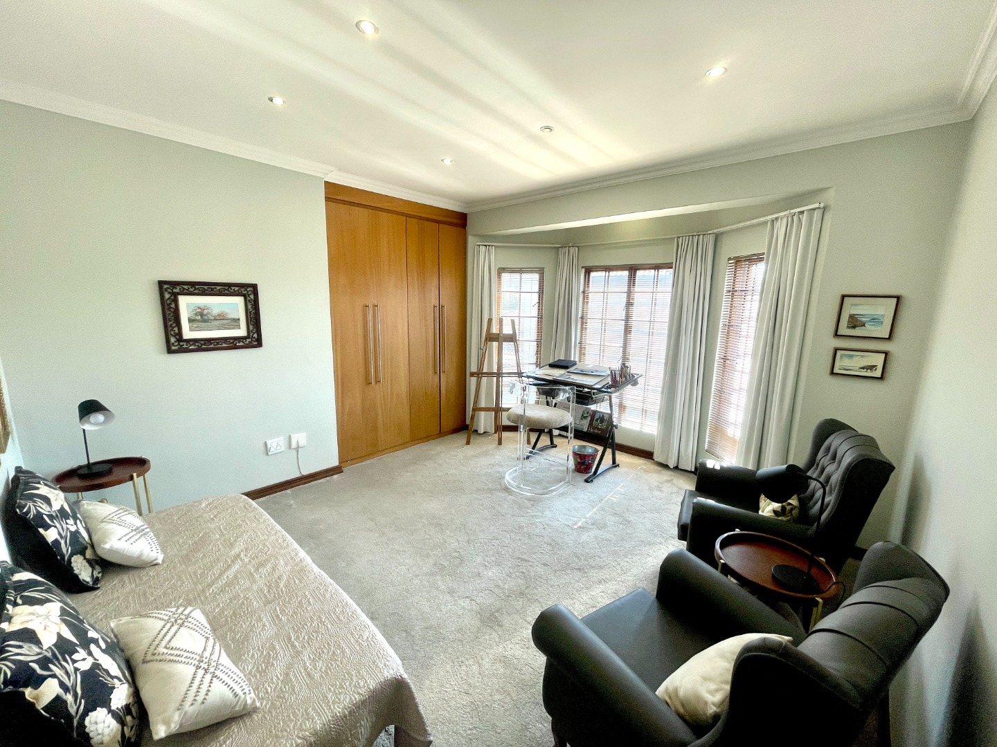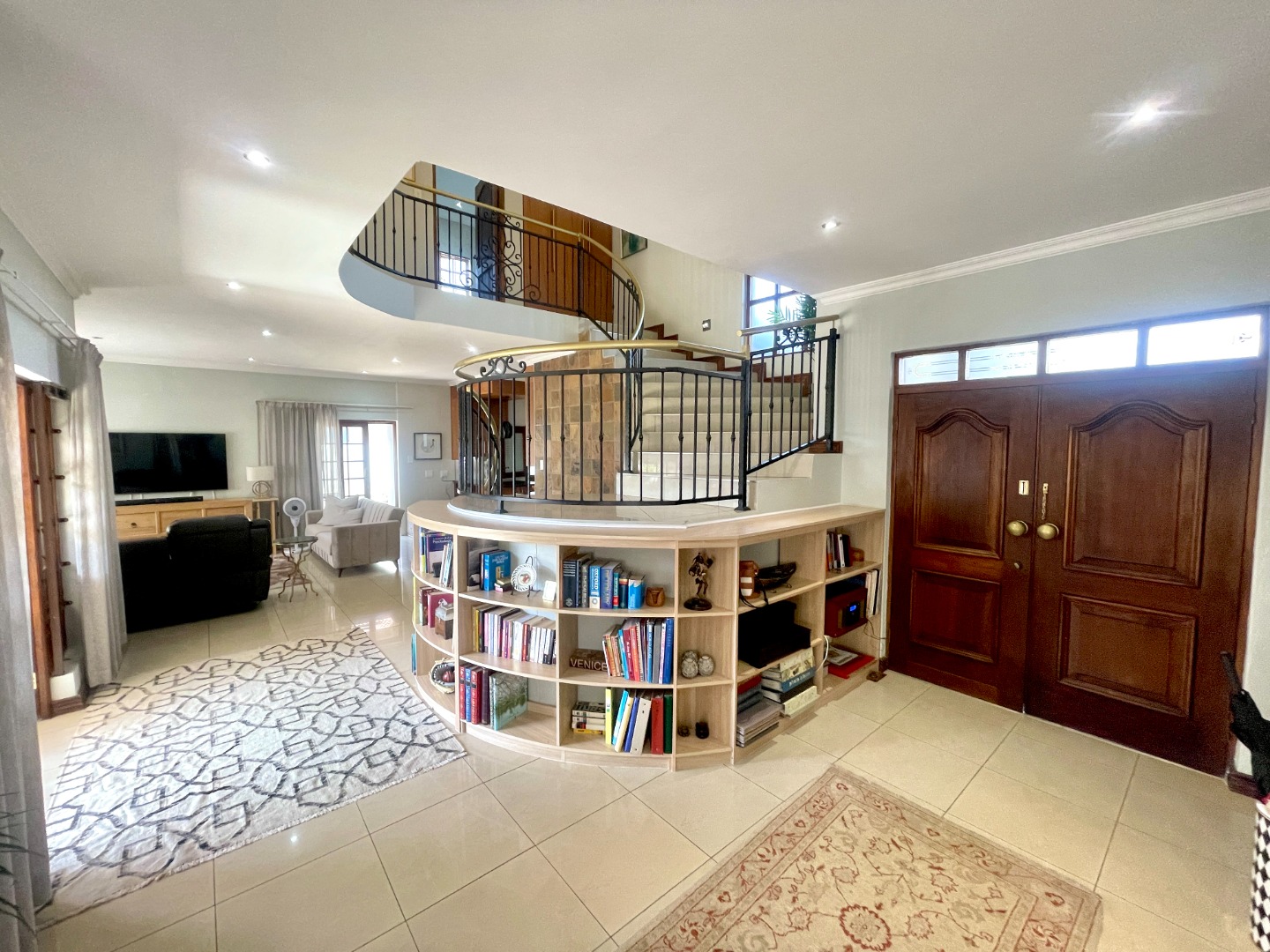 The thoughtfully designed kitchen is a culinary dream with a central island, gas hops, walk-in pantry, and space for three appliances and generous walk-in pantry, while the open-plan layout flows effortlessly into expansive living and dining areas, including a cozy library nook. Double wooden doors open out to your entertainment haven – a covered patio with built-in braai overlooking a sparkling pool and lush, private garden. Upstairs, three beautifully finished bedrooms provide restful retreats, including a renovated main bedroom with a large en-suit bathroom. Bonus features include a separate en-suite staff room (ideal as a separate flatlet), ample storage, oversized garages, a trailer parking, and energy-efficient extras like a 5KW inverter, battery, and 8 solar panels.