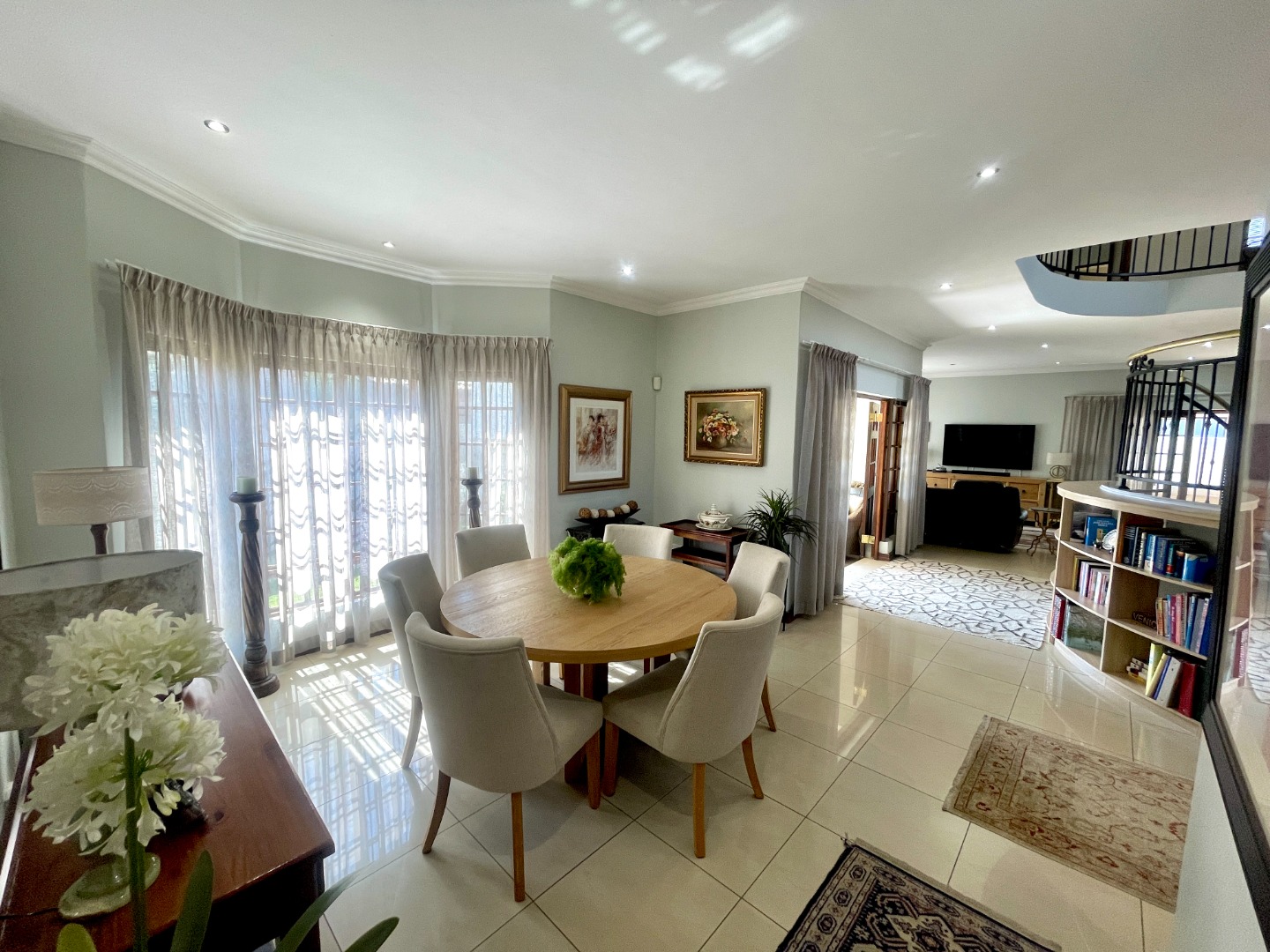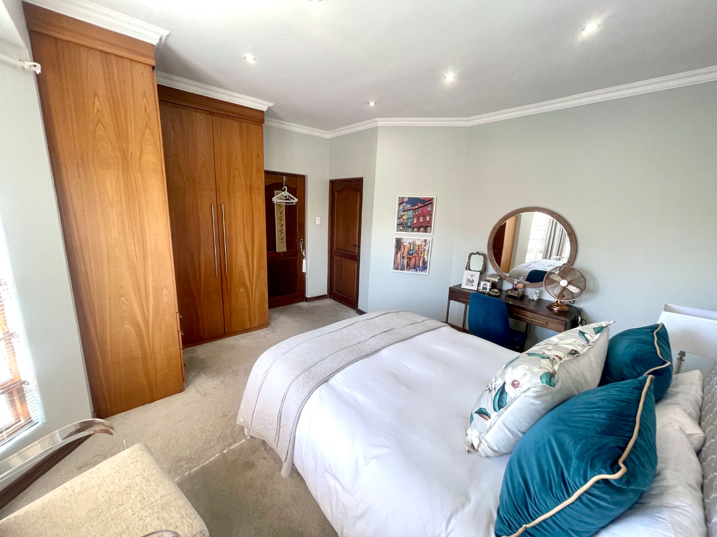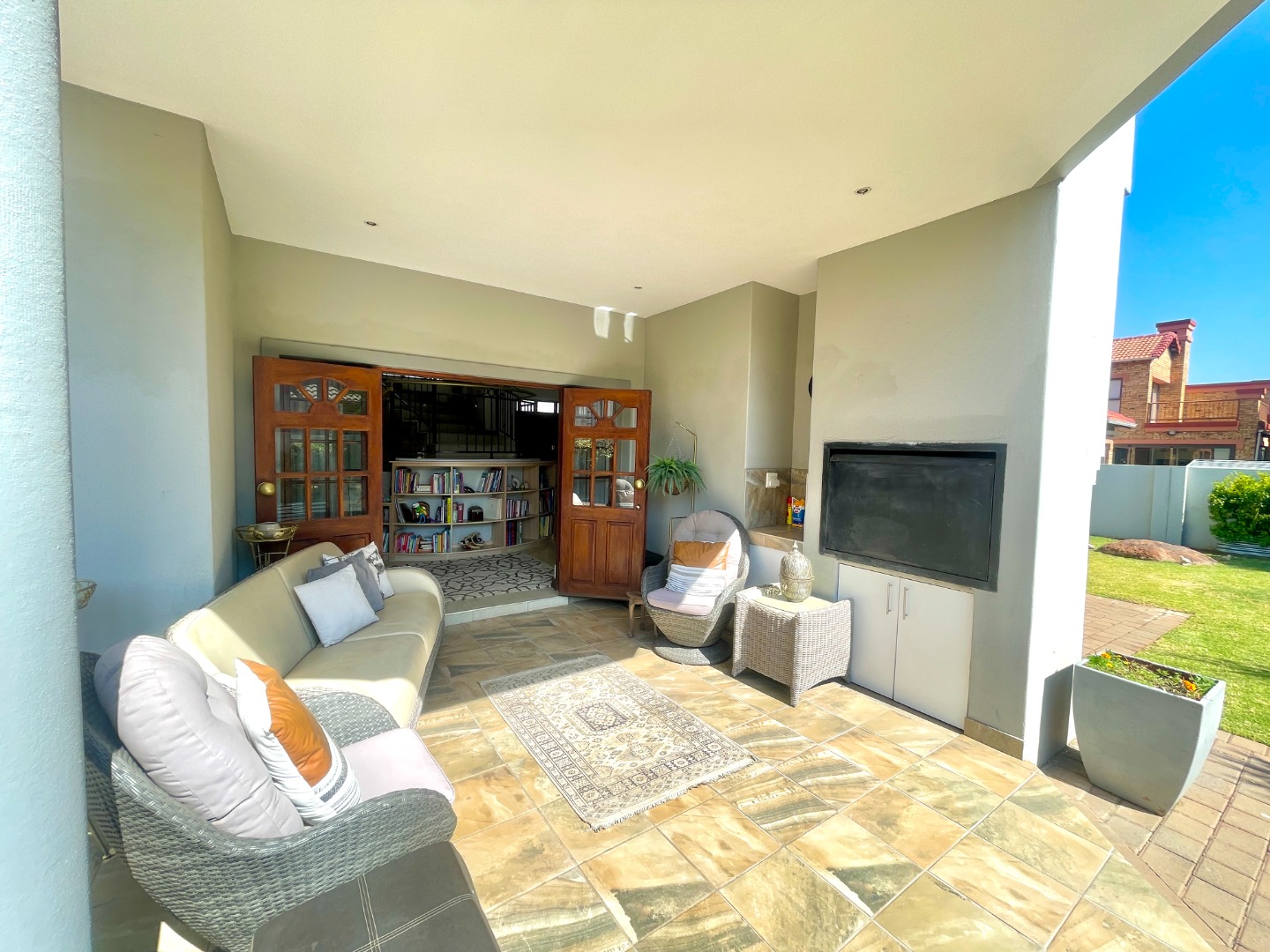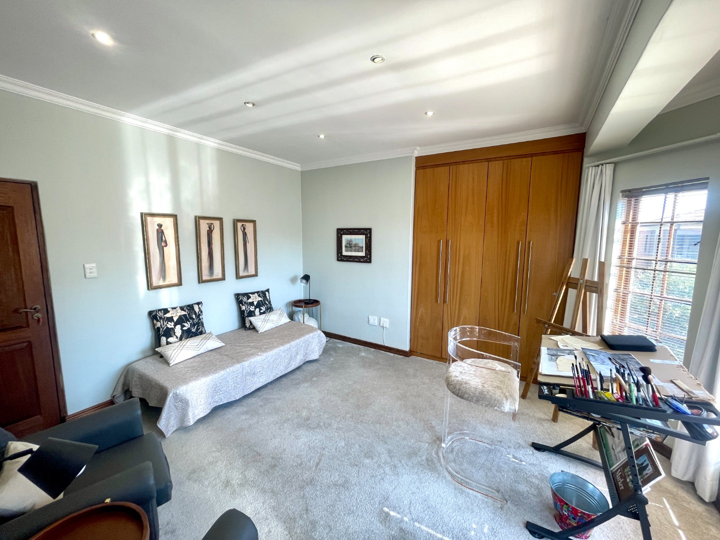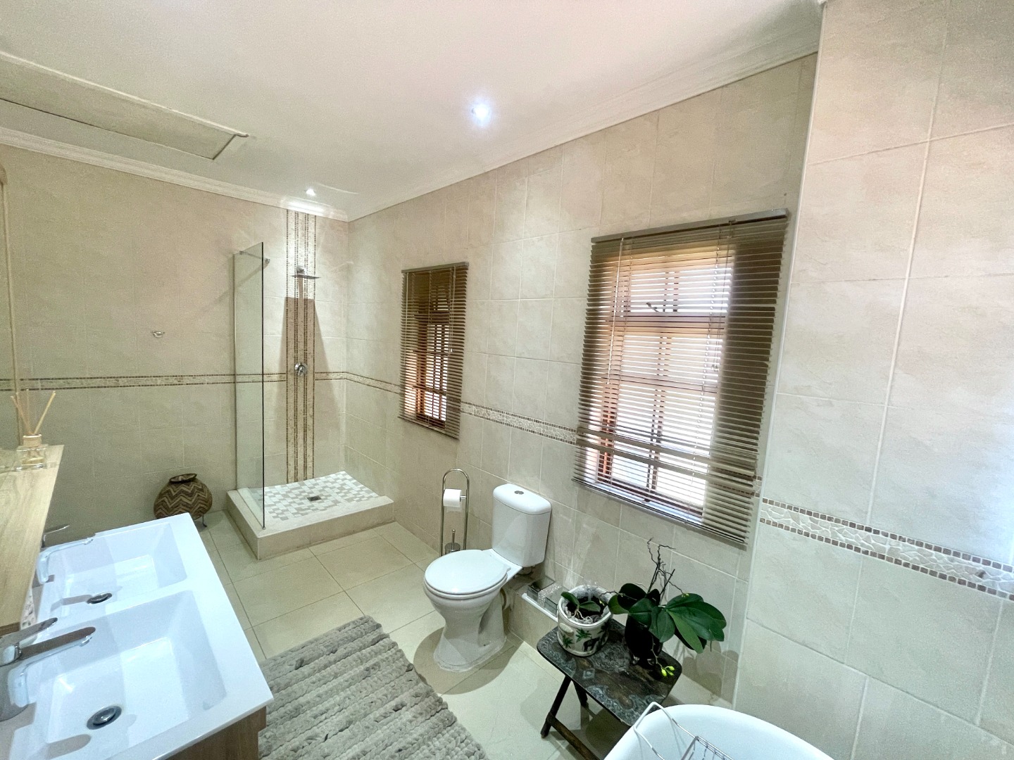 The thoughtfully designed kitchen is a culinary dream with a central island, gas hops, walk-in pantry, and space for three appliances and generous walk-in pantry, while the open-plan layout flows effortlessly into expansive living and dining areas, including a cozy library nook. Double wooden doors open out to your entertainment haven – a covered patio with built-in braai overlooking a sparkling pool and lush, private garden. Upstairs, three beautifully finished bedrooms provide restful retreats, including a renovated main bedroom with a large en-suit bathroom. Bonus features include a separate en-suite staff room (ideal as a separate flatlet), ample storage, oversized garages, a trailer parking, and energy-efficient extras like a 5KW inverter, battery, and 8 solar panels.