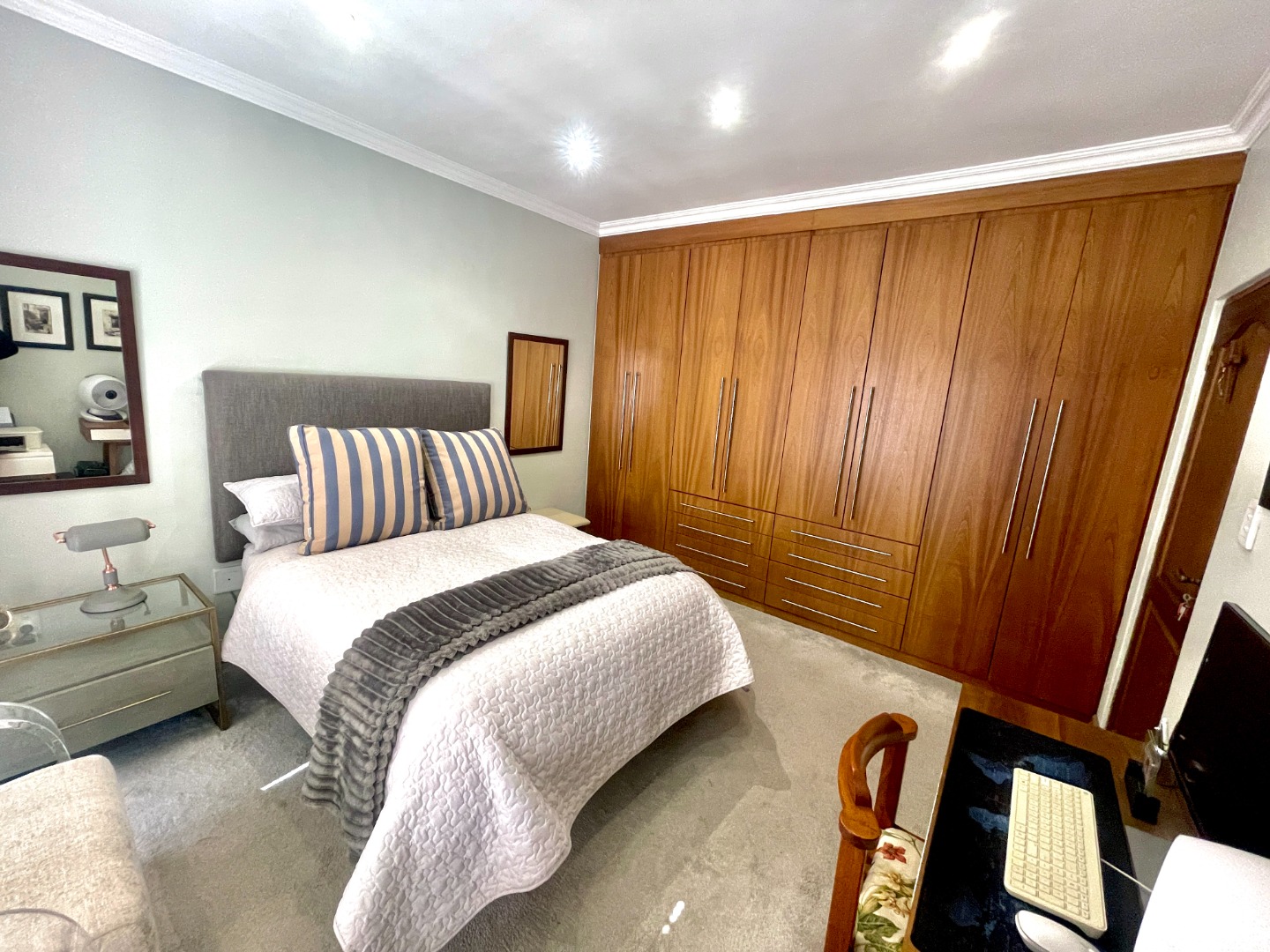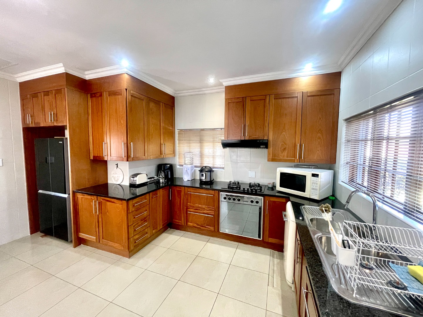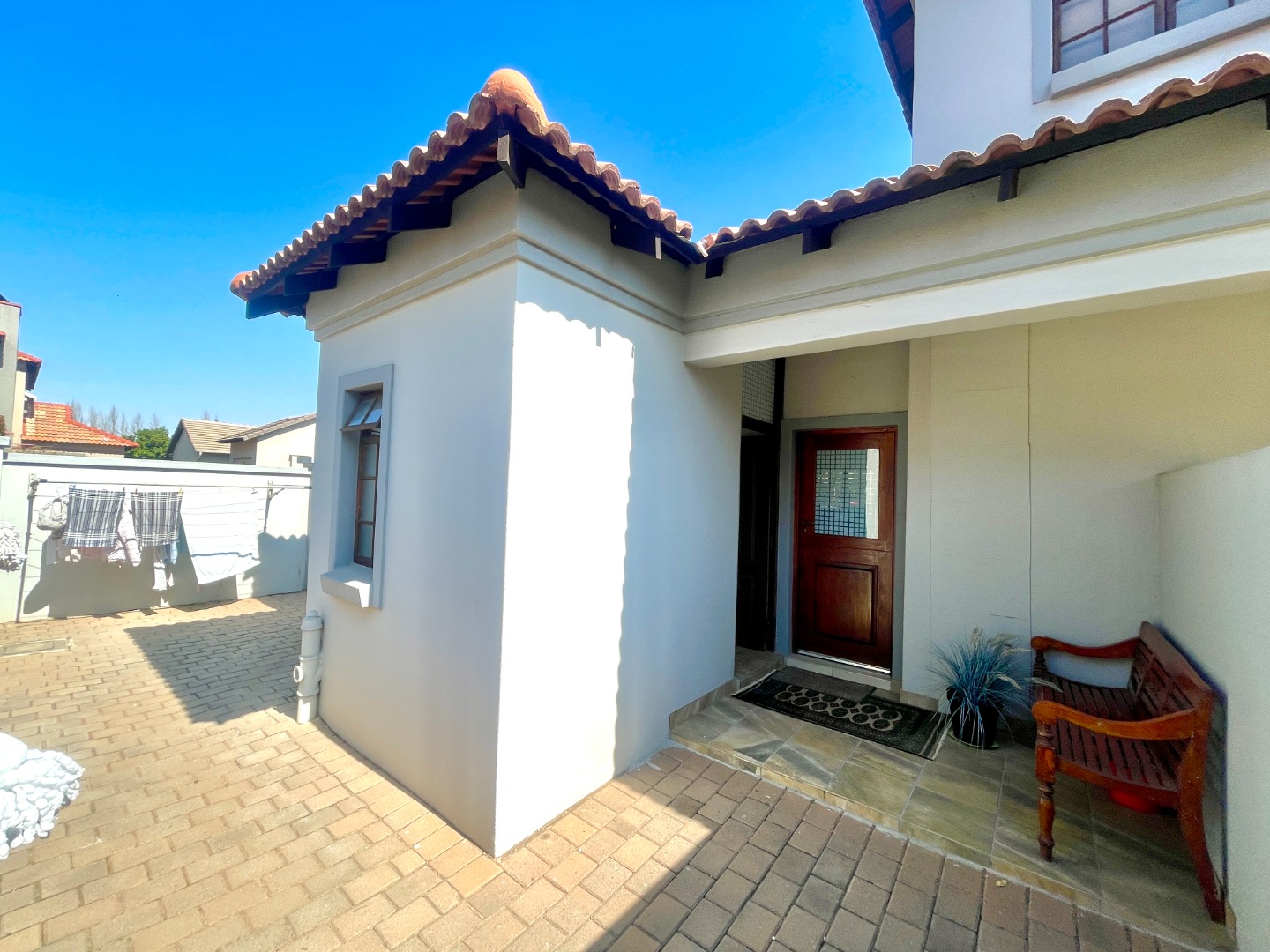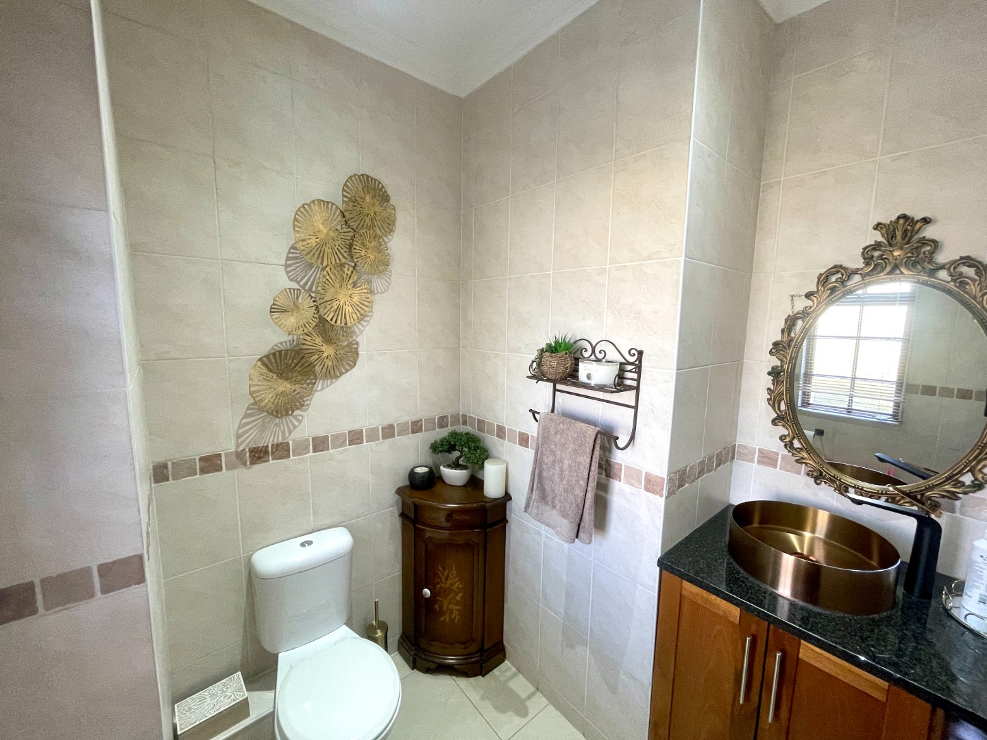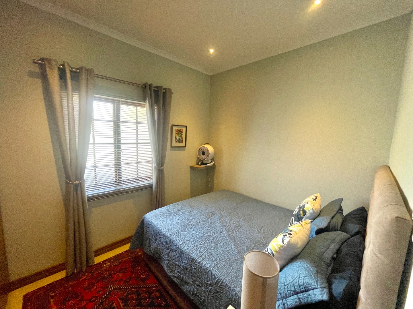 The thoughtfully designed kitchen is a culinary dream with a central island, gas hops, walk-in pantry, and space for three appliances and generous walk-in pantry, while the open-plan layout flows effortlessly into expansive living and dining areas, including a cozy library nook. Double wooden doors open out to your entertainment haven – a covered patio with built-in braai overlooking a sparkling pool and lush, private garden. Upstairs, three beautifully finished bedrooms provide restful retreats, including a renovated main bedroom with a large en-suit bathroom. Bonus features include a separate en-suite staff room (ideal as a separate flatlet), ample storage, oversized garages, a trailer parking, and energy-efficient extras like a 5KW inverter, battery, and 8 solar panels.