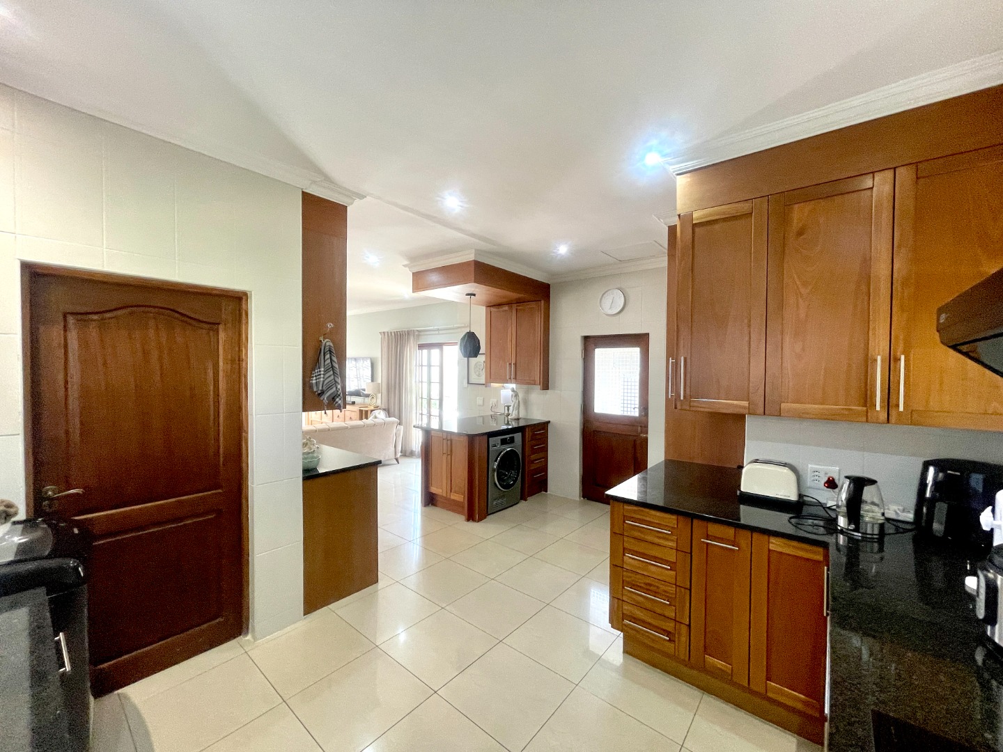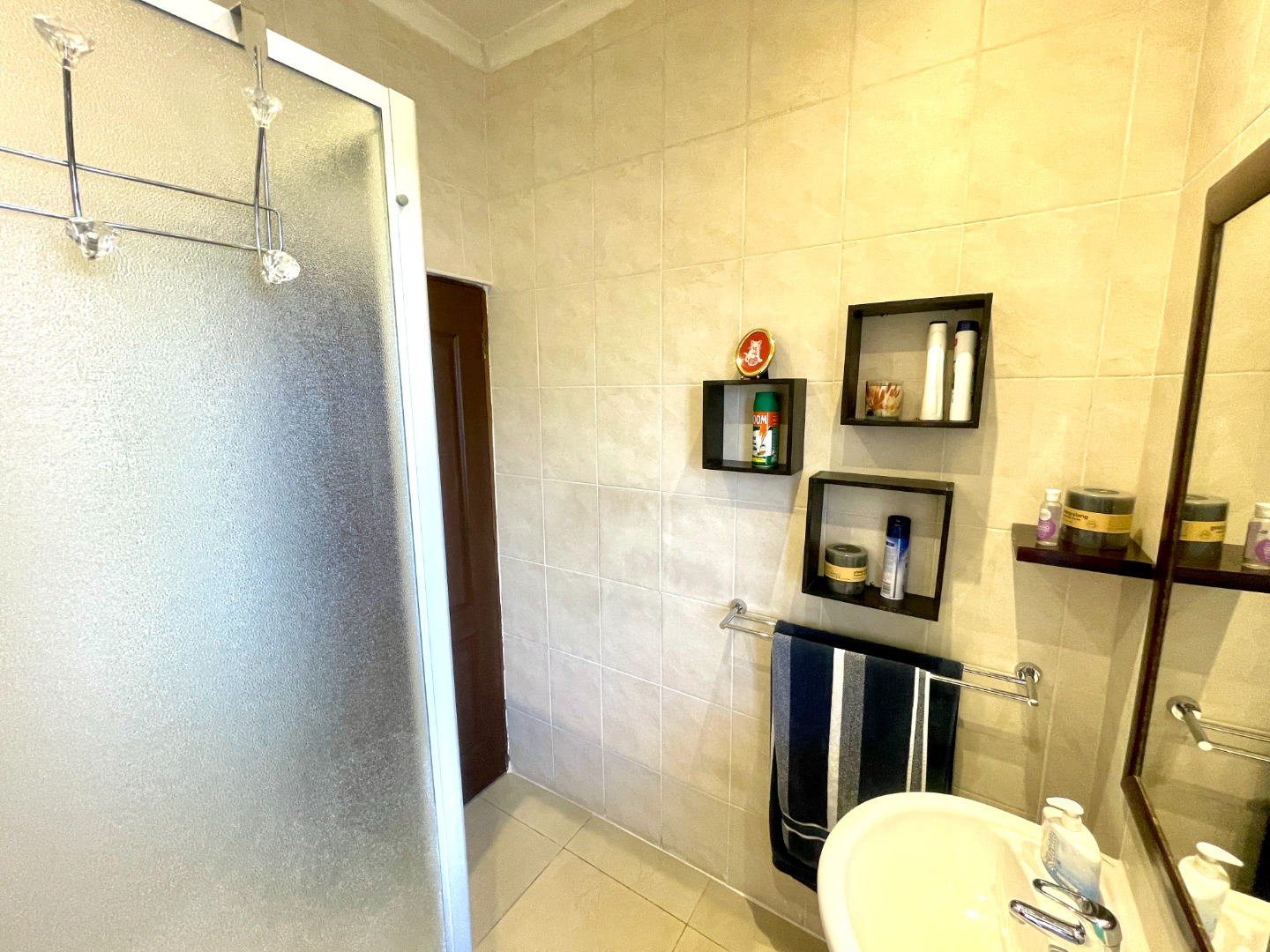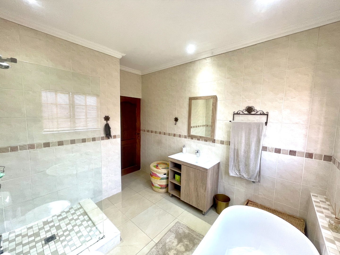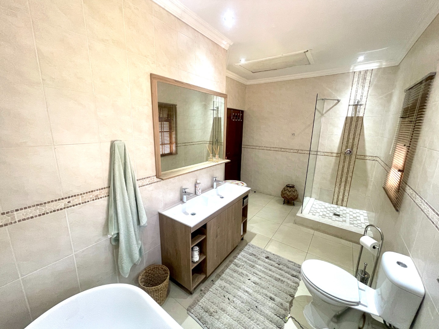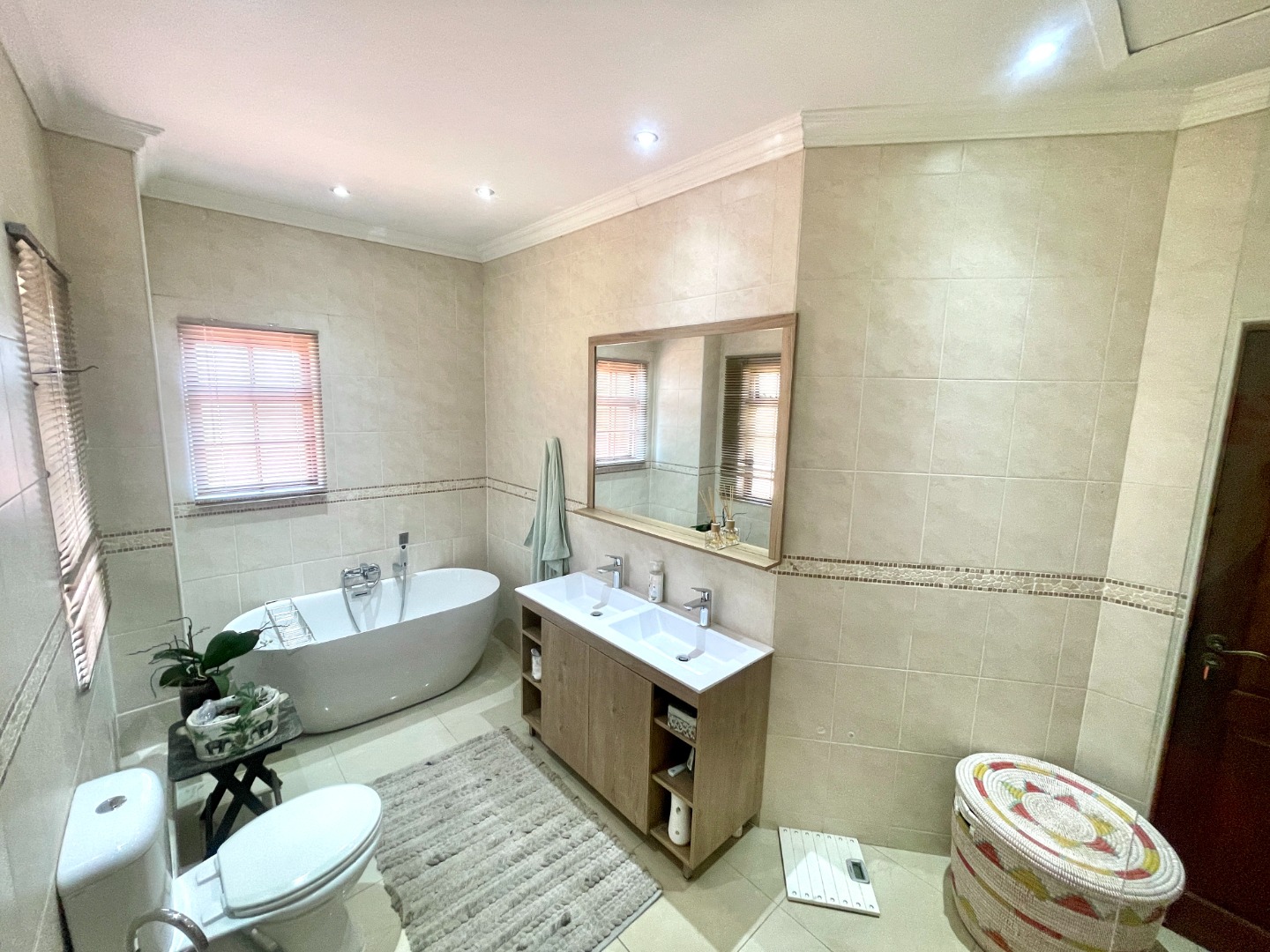 The thoughtfully designed kitchen is a culinary dream with a central island, gas hops, walk-in pantry, and space for three appliances and generous walk-in pantry, while the open-plan layout flows effortlessly into expansive living and dining areas, including a cozy library nook. Double wooden doors open out to your entertainment haven – a covered patio with built-in braai overlooking a sparkling pool and lush, private garden. Upstairs, three beautifully finished bedrooms provide restful retreats, including a renovated main bedroom with a large en-suit bathroom. Bonus features include a separate en-suite staff room (ideal as a separate flatlet), ample storage, oversized garages, a trailer parking, and energy-efficient extras like a 5KW inverter, battery, and 8 solar panels.