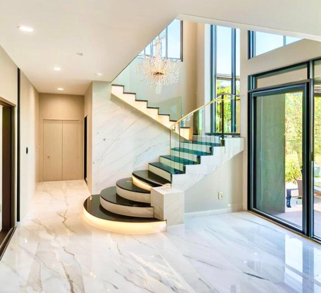 The double-volume entrance creates an immediate sense of space, leading into open-plan living areas that flow effortlessly to the outdoors. A chef’s kitchen with butler’s kitchen and scullery forms the heart of the home, while entertainment spaces include a cinema room, covered patio with braai, pool, and boma—ideal for both family gatherings and hosting friends. A guest suite, private study, and staff accommodation complete the ground floor, supported by four garages and smart practical features like automated irrigation.