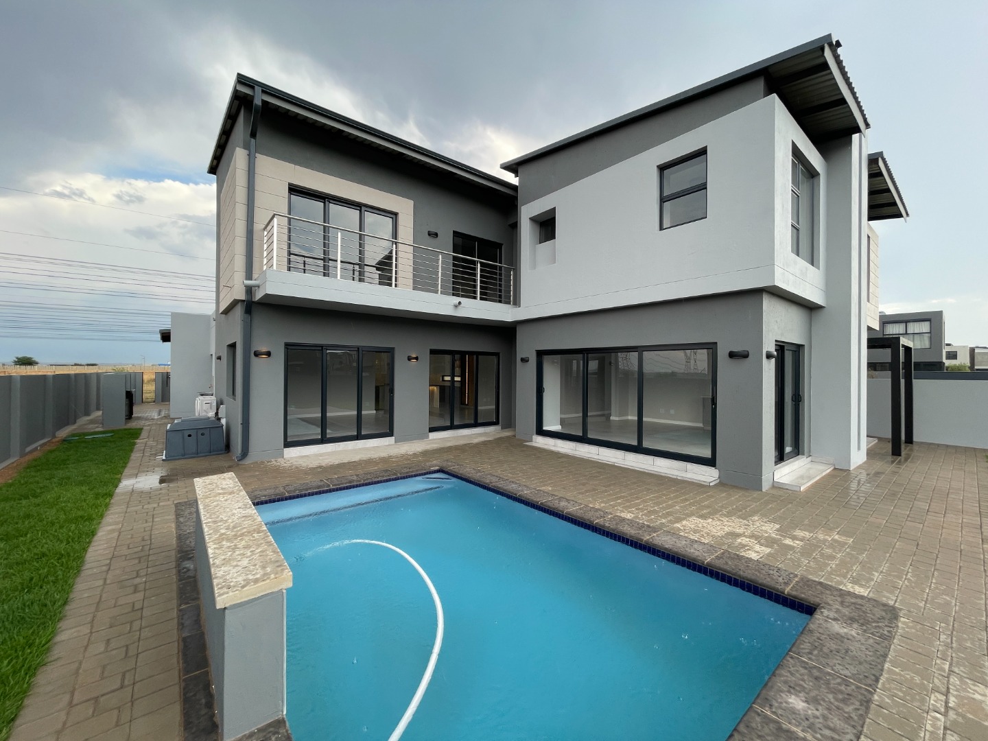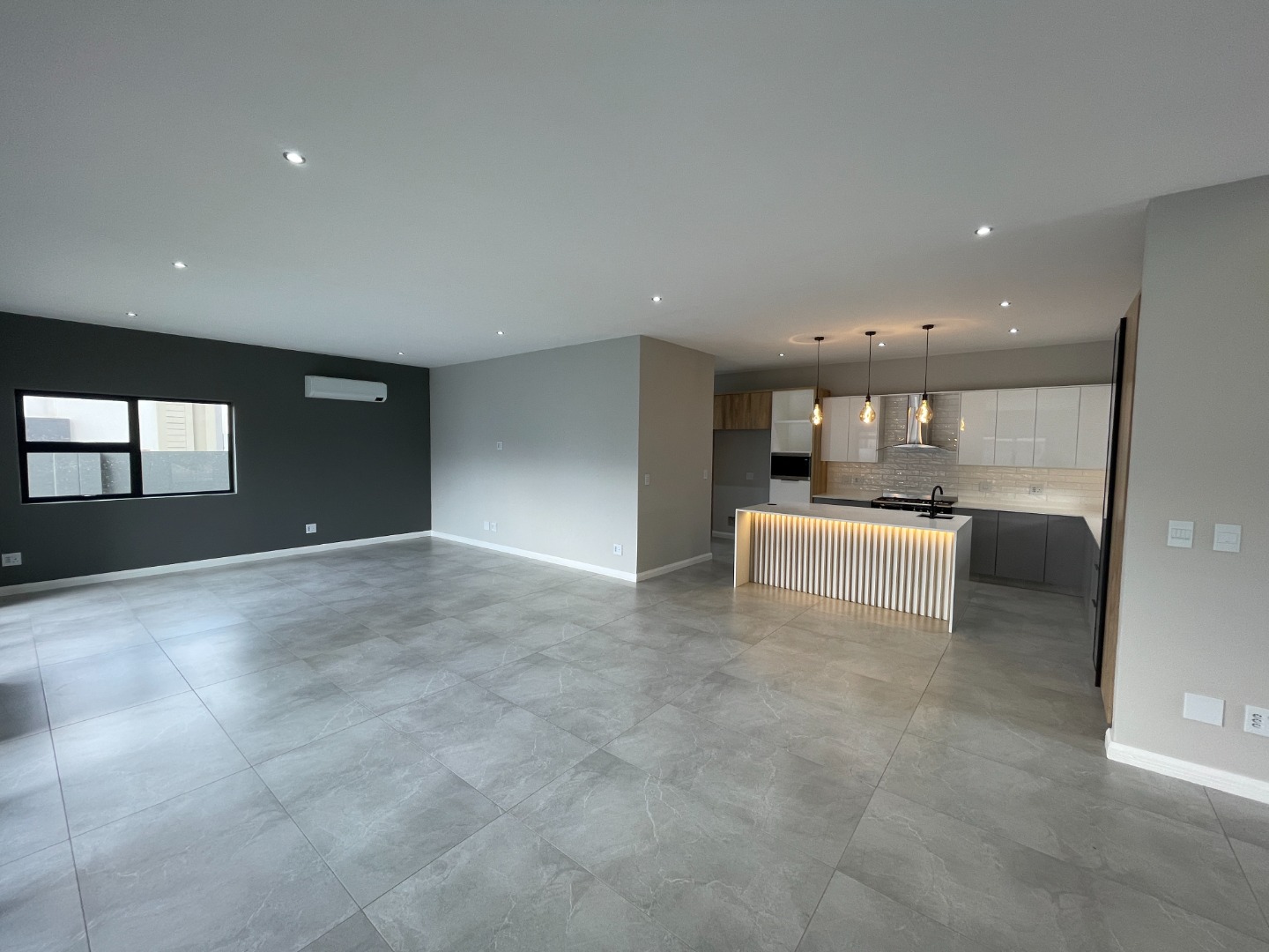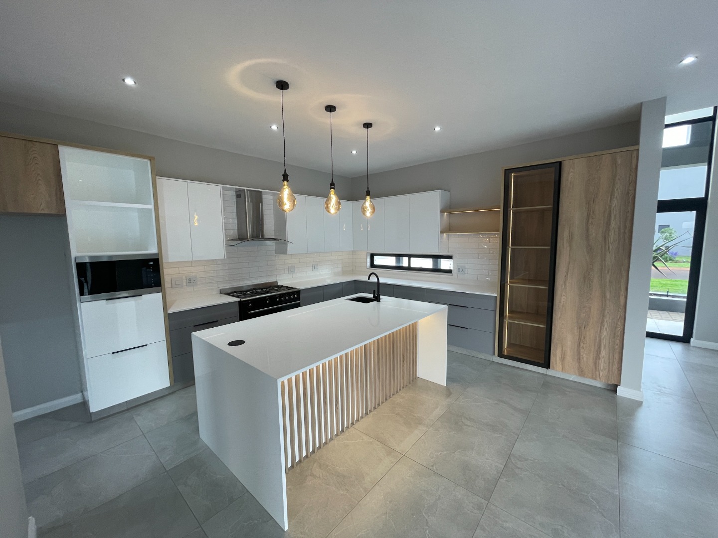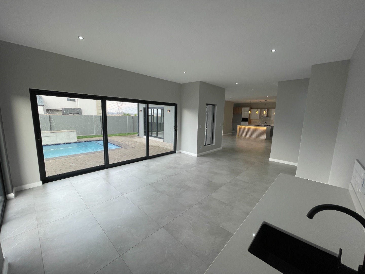 Step inside this newly completed 4-bedroom architectural showpiece and experience where modern design meets timeless luxury. Every inch of this home was designed to impress, from the triple tiled garages and grand double-volume entrance to the seamless open-plan layout that blurs the lines between indoor sophistication and outdoor living. The entertainer’s heart beats in the gourmet SMEG kitchen, complete with a 900mm gas hob, built-in microwave, and walk-in scullery linking directly to staff accommodation. Frameless showers, Giberit toilets, and two Samsung air-conditioners set the tone for a home that’s every bit as functional as it is flawless.
