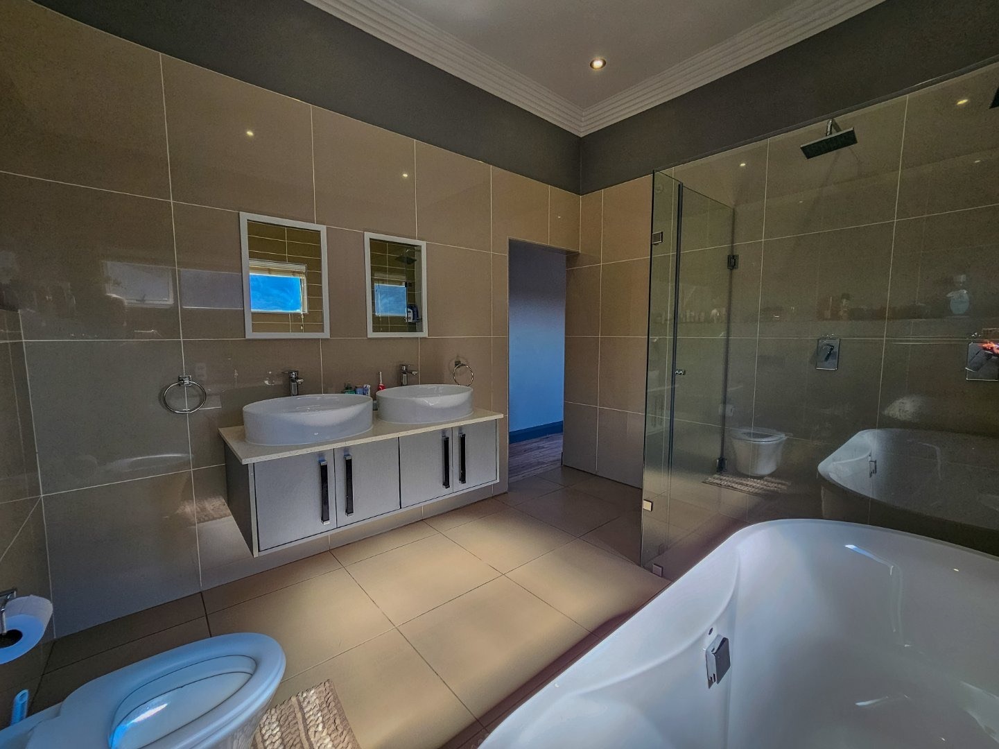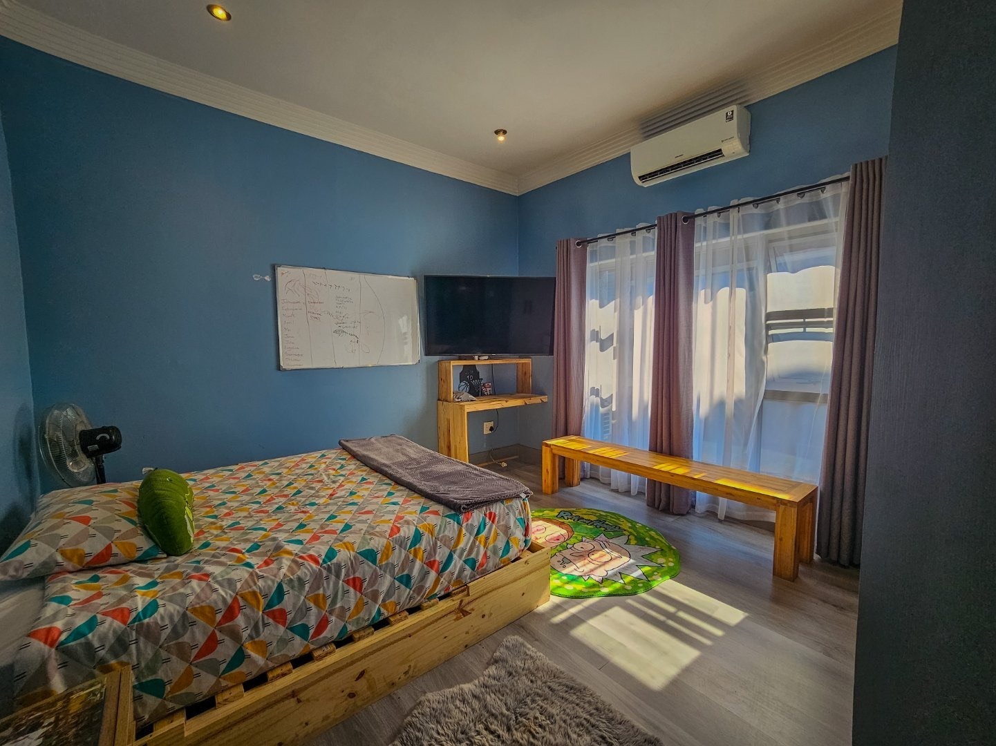 Step inside to an expansive 337.00 sqm of thoughtfully laid-out living space. The open-plan design seamlessly connects the modern kitchen, dining area, and lounge, creating an ideal environment for both daily life and entertaining. The kitchen is a highlight, featuring sleek white cabinetry, a large island with seating, and a stylish brick accent wall, complemented by stainless steel appliances. Large glass doors invite abundant natural light and facilitate a smooth transition to the private garden, enhancing the indoor-outdoor lifestyle. Comfort is assured with air conditioning throughout the main living areas, alongside a dedicated family TV room and a braai room for leisure.