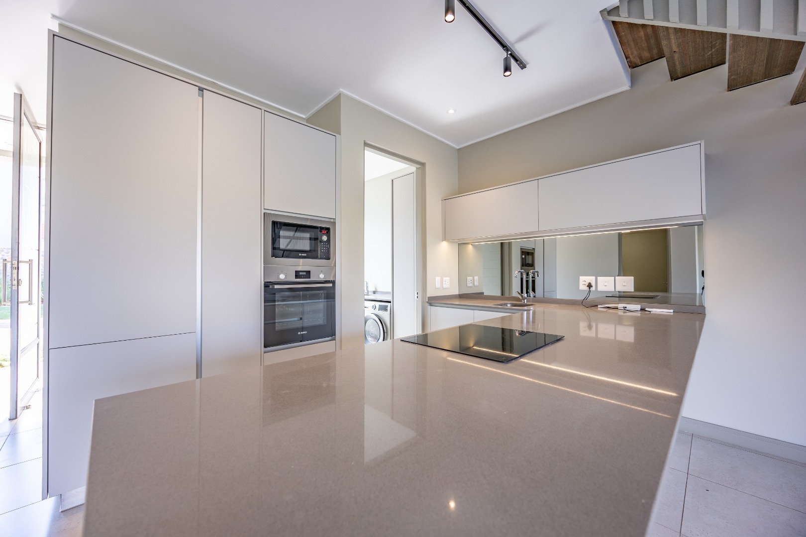 The ground floor boasts a generous lounge area, a stylish dining space, and a modern kitchen equipped with high-end finishes, sleek cabinetry, and a central island—perfect for family meals or casual gatherings. A separate scullery and pantry add functionality and keep the main kitchen space clutter-free.