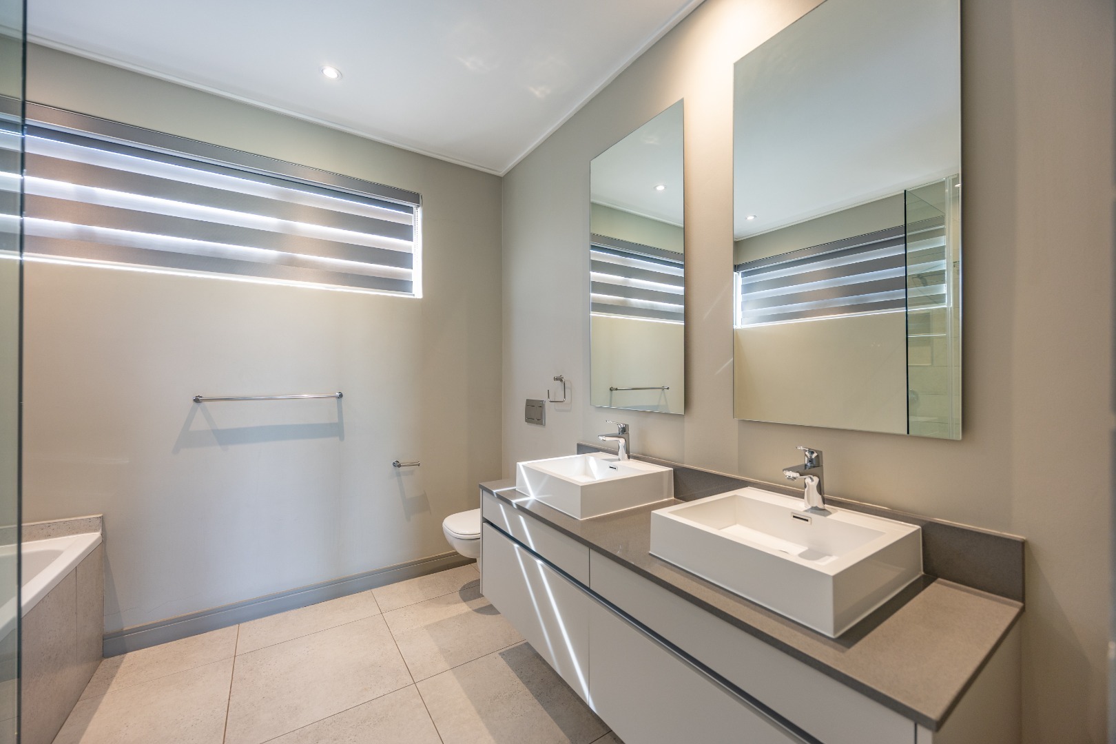 The upper level of the home features three well-appointed bedrooms, all designed to provide a peaceful retreat. The two secondary bedrooms are spacious and filled with natural light, offering built-in wardrobes and access to a beautifully finished shared guest bathroom with modern fittings and a sleek design.