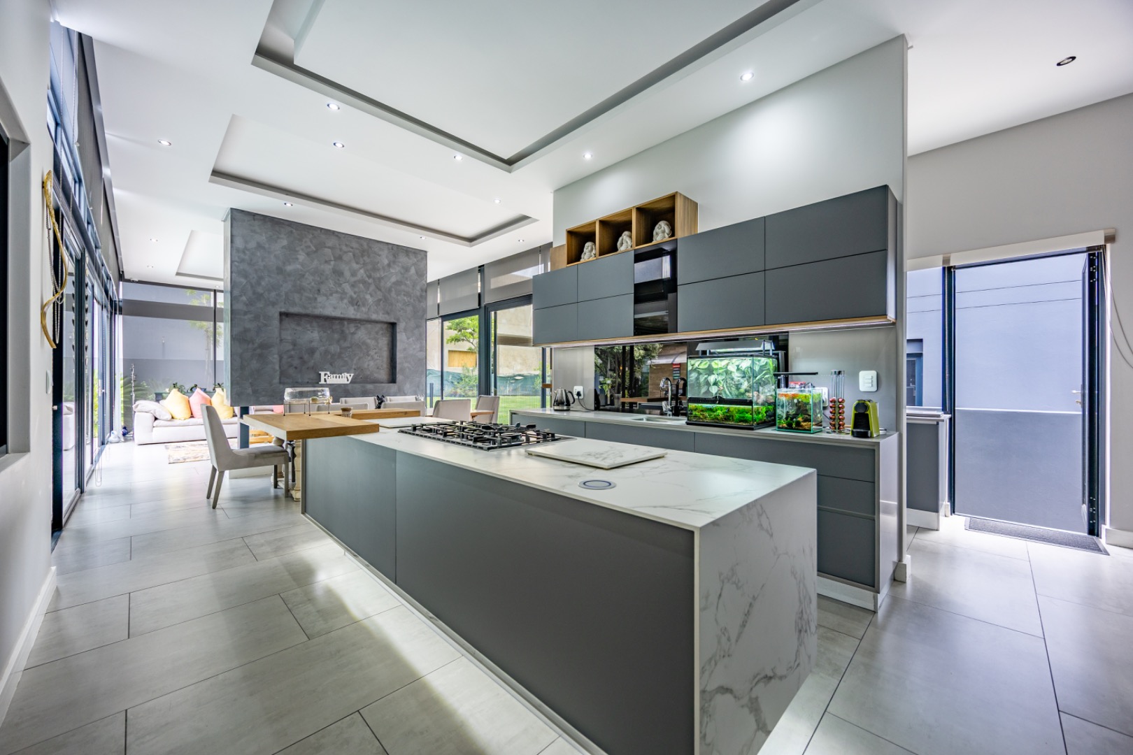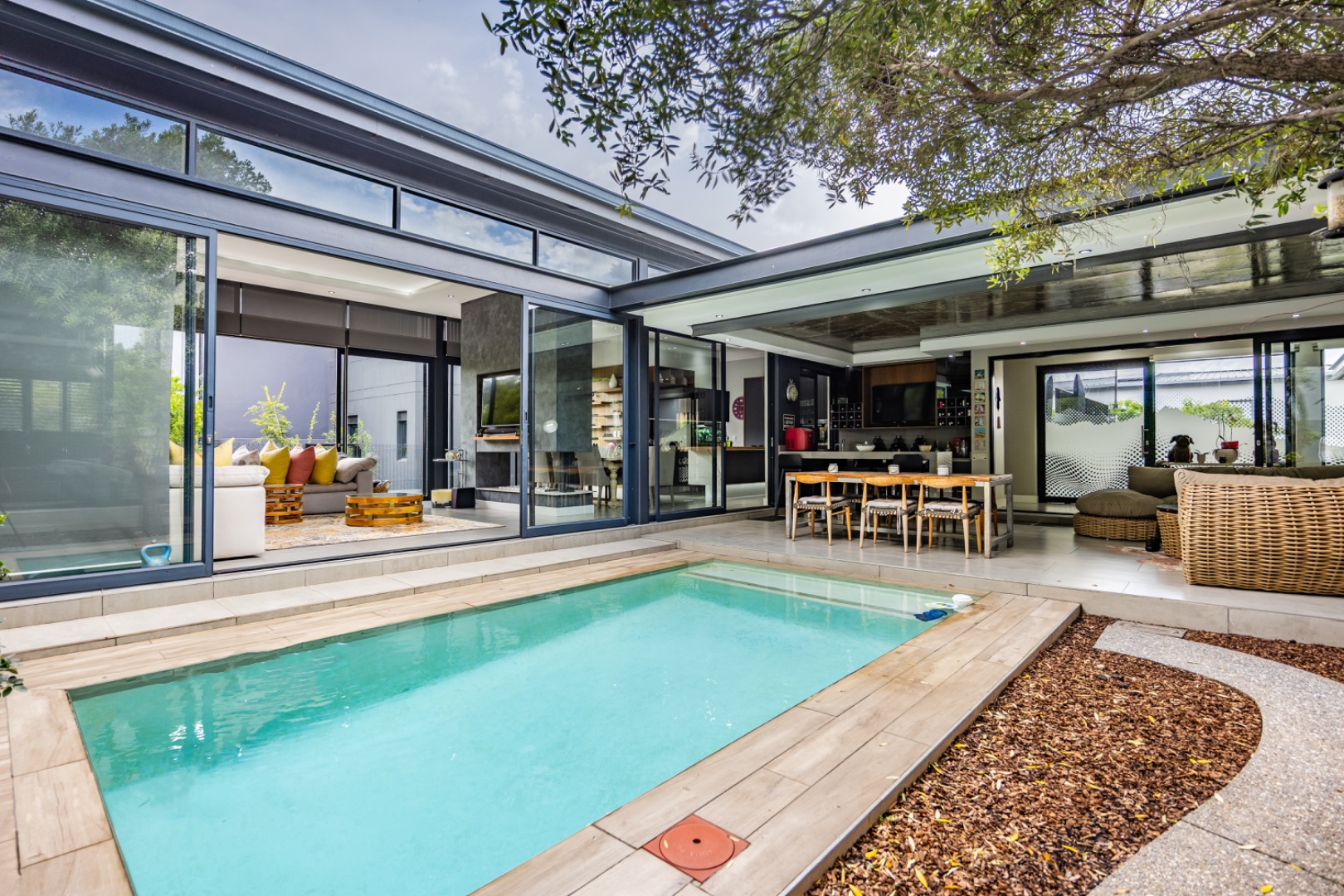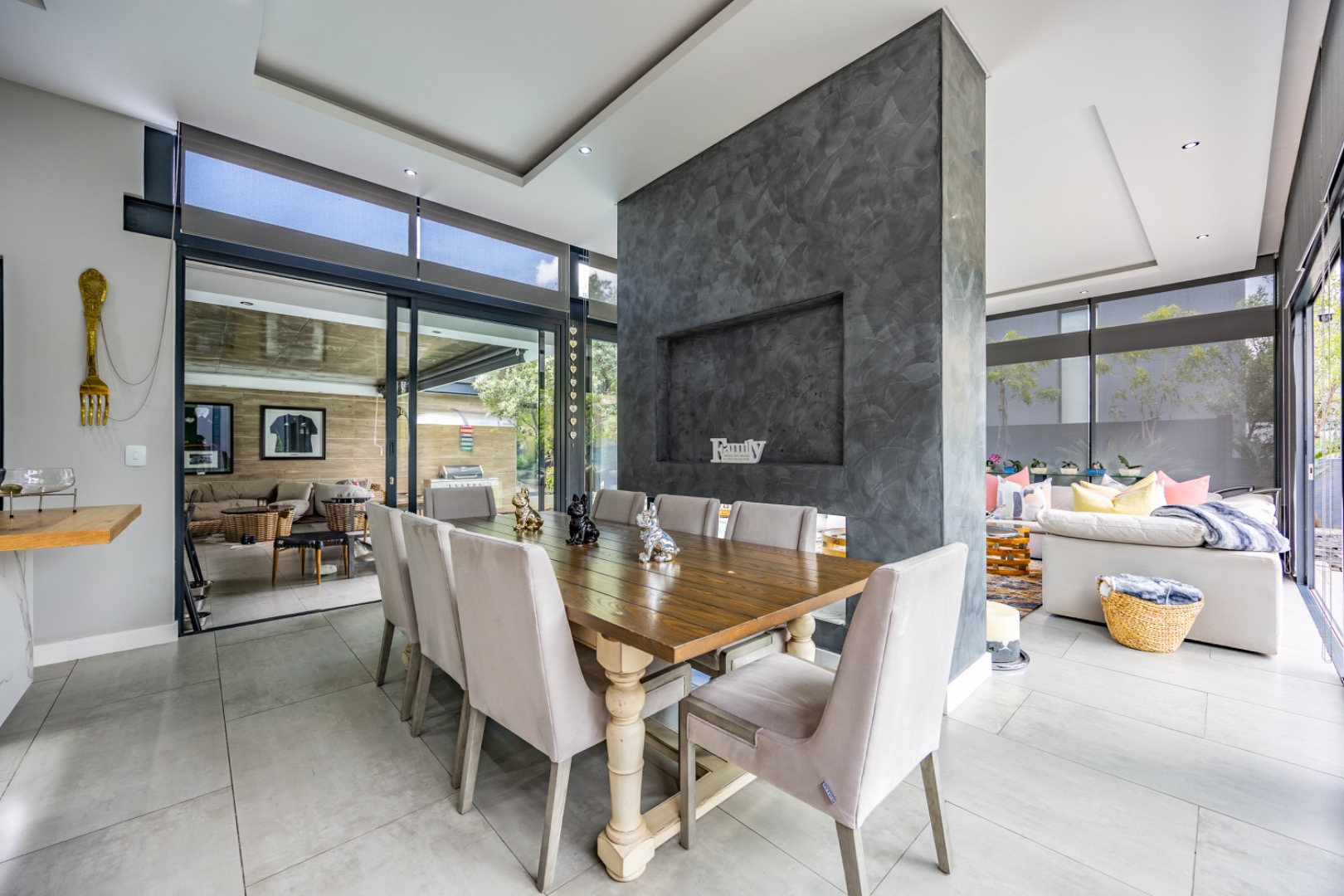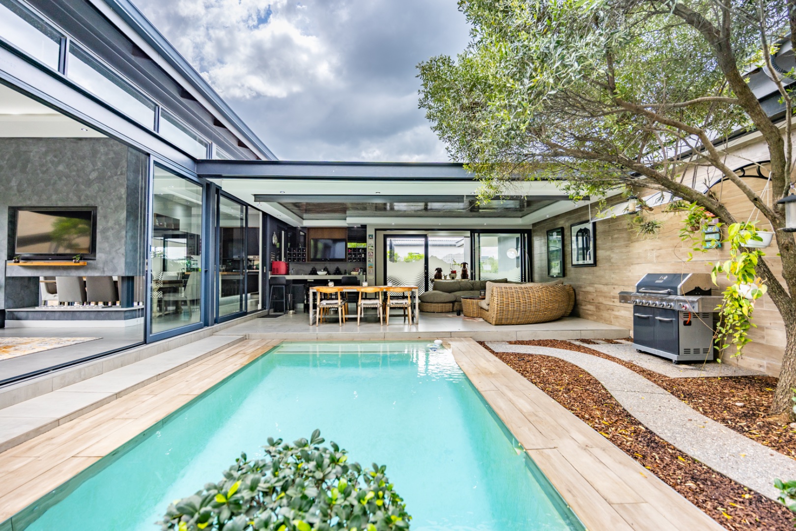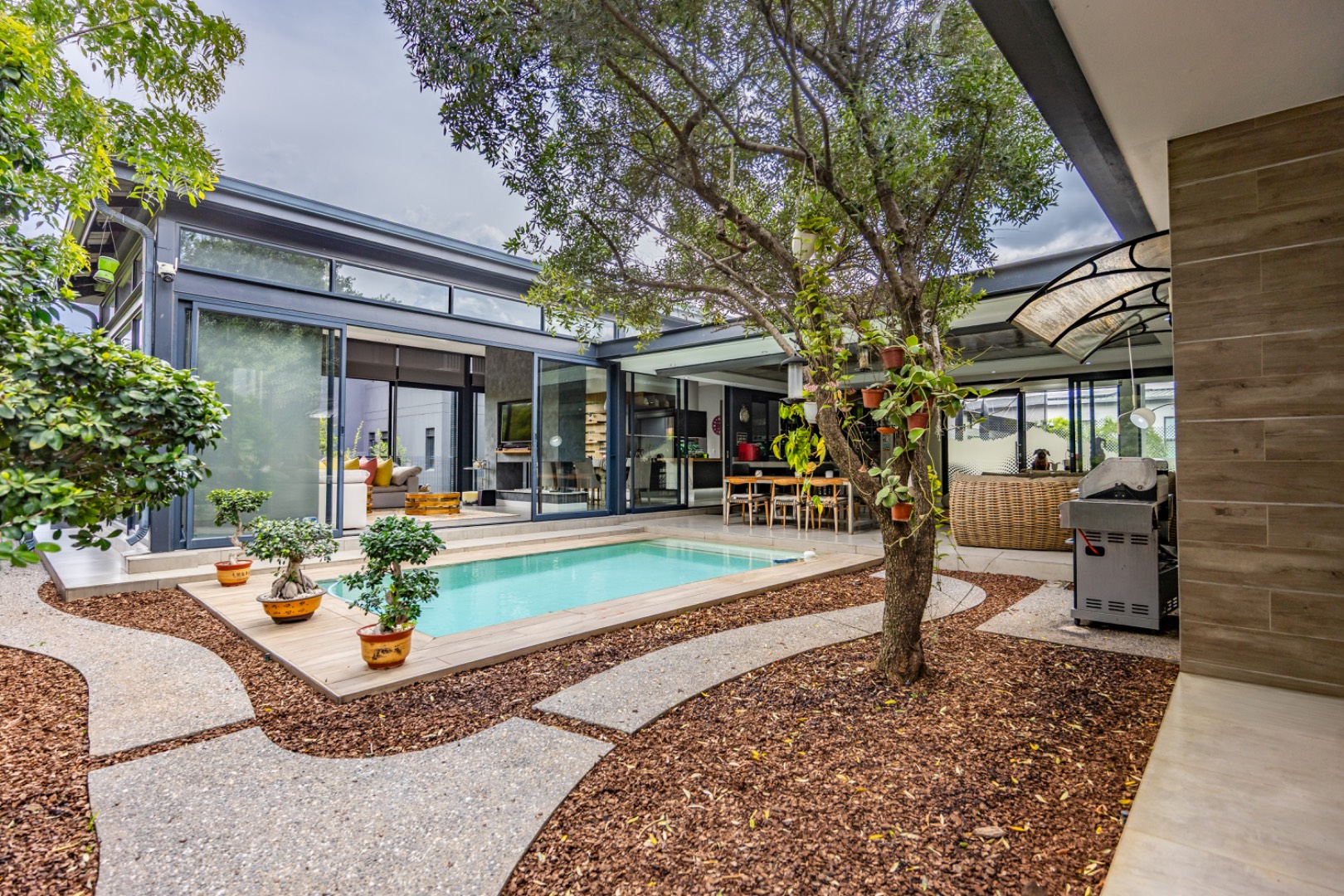 Discover an exceptional residential offering within the prestigious Steyn City, Midrand, South Africa. This meticulously designed property, spanning a generous 326.00 sqm on a 652.00 sqm erf, epitomises contemporary estate living. The residence features an expansive open-plan layout, seamlessly integrating the lounge and two distinct dining areas, all bathed in abundant natural light from extensive floor-to-ceiling windows and sliding glass doors. Modern finishes, high ceilings, recessed lighting, and air conditioning enhance the sophisticated ambiance, creating an ideal environment for both relaxation and entertaining. The heart of this home is its sleek, modern kitchen, equipped with integrated appliances, dark grey cabinetry, and elegant marble-look countertops. A prominent island with a gas hob serves as a focal point, complemented by a practical pantry and a unique built-in aquarium. The seamless flow extends to the outdoor entertainment area, featuring a private swimming pool, a well-maintained garden, a patio, and a built-in braai, perfect for al fresco dining and enjoying the scenic views. Accommodation comprises three well-appointed bedrooms and three bathrooms, including two luxurious ensuites and a convenient guest toilet, ensuring privacy and comfort for all residents. The property is offered fully furnished, providing immediate occupancy with refined style. Practical amenities include a dedicated laundry area, two garages, and four parking spaces, alongside a driveway for additional convenience. Residents benefit from the comprehensive security infrastructure of this esteemed security estate, featuring 24-hour security, CCTV surveillance, an access gate, security post, and an alarm system. Furthermore, the property boasts advanced sustainability features, including solar panels, a battery inverter, and a solar geyser, promoting energy efficiency and reduced utility costs. Fibre connectivity ensures high-speed internet access. Steyn City offers an unparalleled lifestyle, renowned as a premier golf estate, eco estate, and wildlife estate. Residents have access to world-class amenities such as a golf course and club house, fostering a vibrant country living experience. This property represents a distinguished opportunity for discerning buyers seeking luxury, security, and an enriched lifestyle. Key Features: * Modern Open-Plan Living with High Ceilings * Sleek Kitchen with Integrated Appliances and Gas Hob * Three Bedrooms, Three Bathrooms (Two Ensuites) * Private Pool, Patio, Garden, and Built-in Braai * Comprehensive 24-Hour Security Estate * Solar Panels, Battery Inverter, and Solar Geyser * Fibre Connectivity and Air Conditioning * Furnished Property with Two Garages and Four Parking Spaces * Access to Golf Course and Club House Amenities * Scenic Views within a Premier Eco and Wildlife Estate