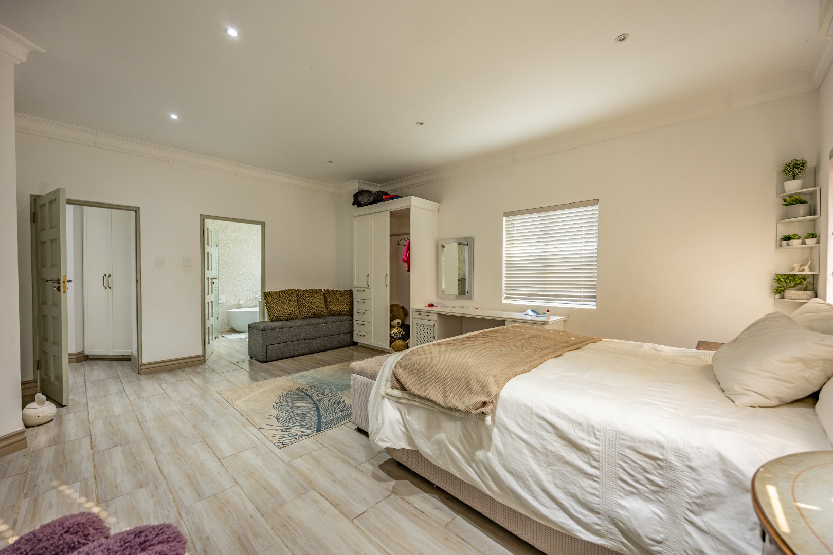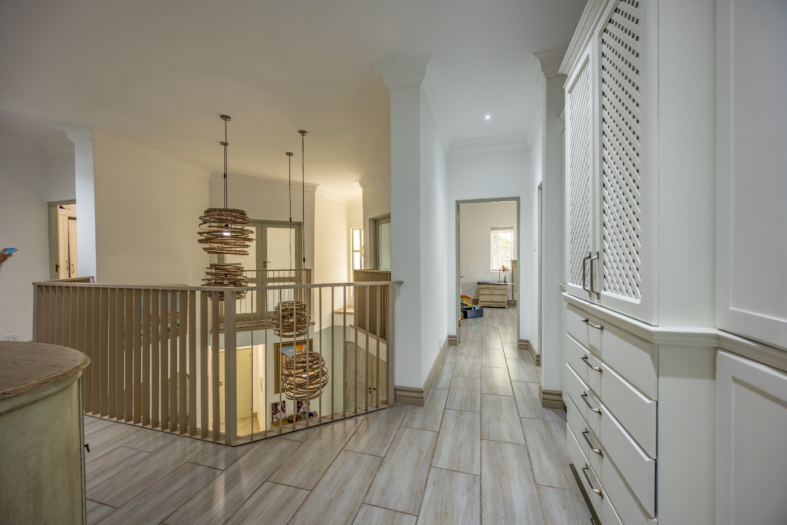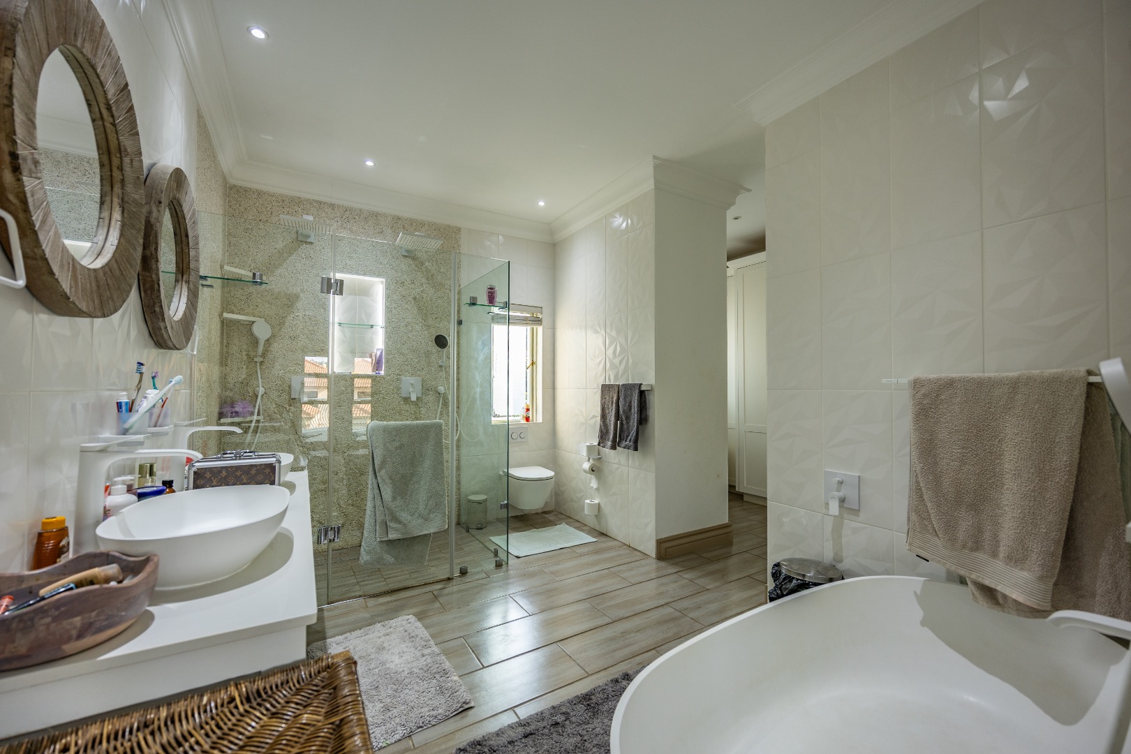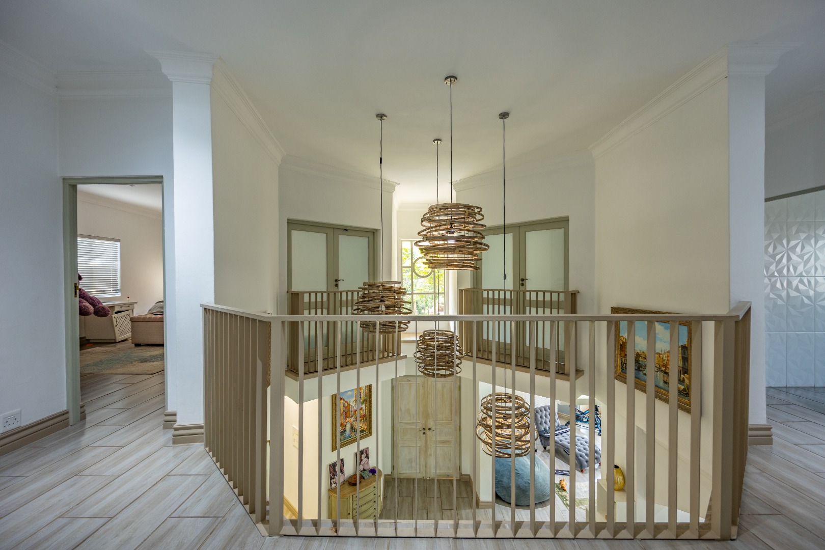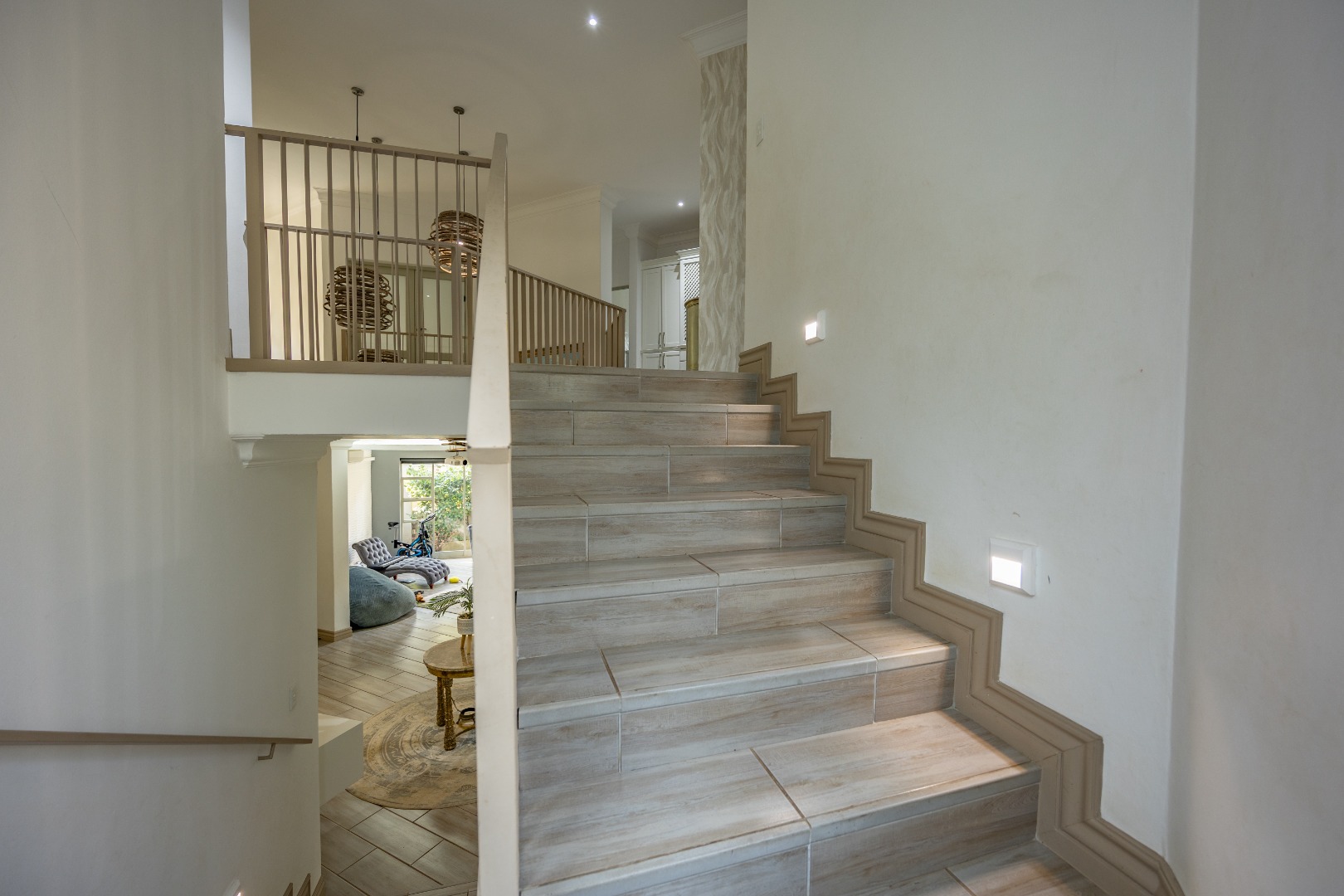 At the heart of the home lies the stylish kitchen, boasting a gas stove, pantry, and scullery with ample storage and workspace to inspire any culinary enthusiast. Upstairs, three spacious bedrooms each enjoy their own bathrooms, while a cosy pyjama lounge with a fireplace sets the scene for relaxed evenings. The luxurious master suite offers a full en-suite bathroom, generous closet space, and a private balcony overlooking the lush garden, accompanied by an adjoining dressing room to create his-and-hers wardrobes. Additional features such as automated garages, extra storage, and a separate entrance for trailers or additional vehicles further elevate the home’s practicality.