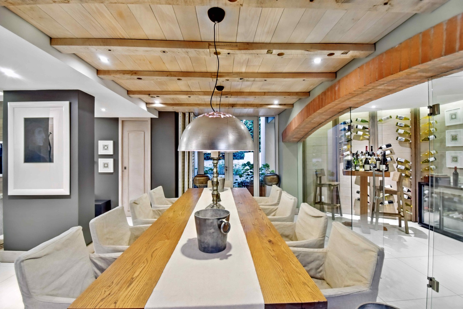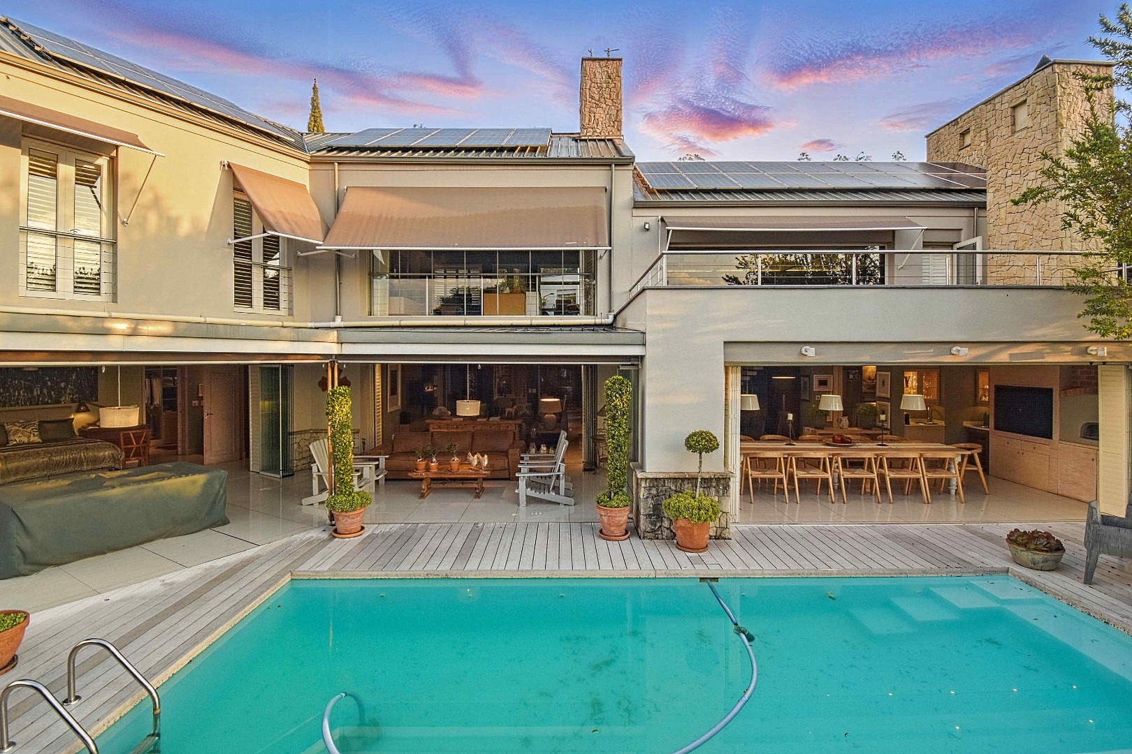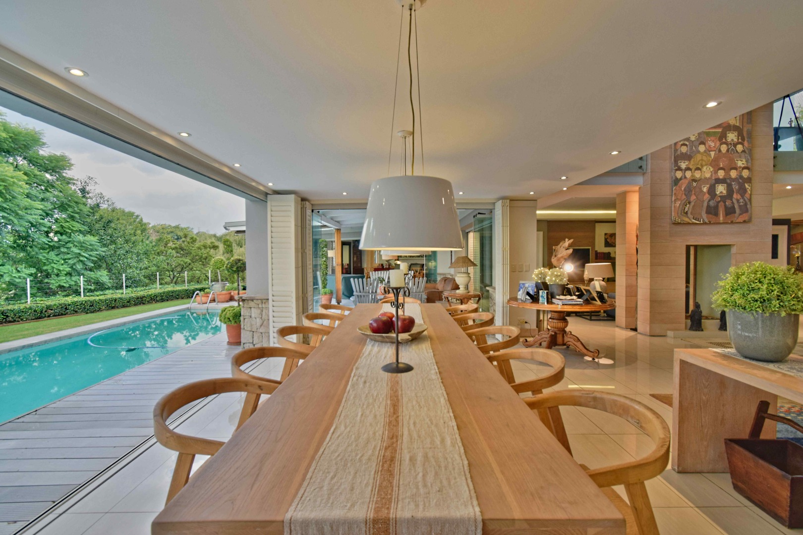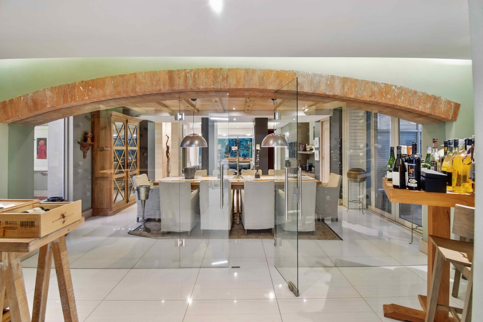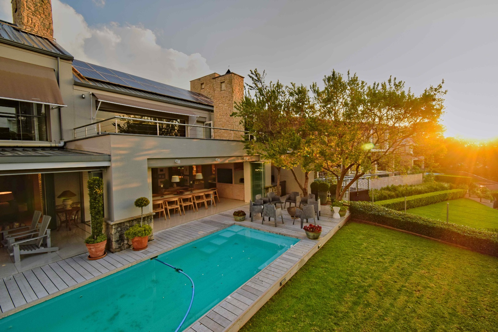 Inside, expansive open-plan living areas are filled with natural light, seamlessly connecting to the landscaped garden and entertainment spaces through frameless glass doors. A striking glass-walled wine cellar complements the dining area, while informal gatherings centre around the fire pit or built-in pizza oven. The designer kitchen blends beauty with practicality, featuring a scullery with space for three appliances, ample storage, and premium finishes. The ground-floor main suite is an opulent retreat with a walk-in closet and indulgent en suite bathroom with a steam shower. Upstairs, two pajama lounges with fireplaces and balconies create cozy family retreats, complemented by two spacious en suite bedrooms. A private flatlet with kitchenette and bathroom, a versatile study or creative studio, and well-equipped staff quarters complete the home.